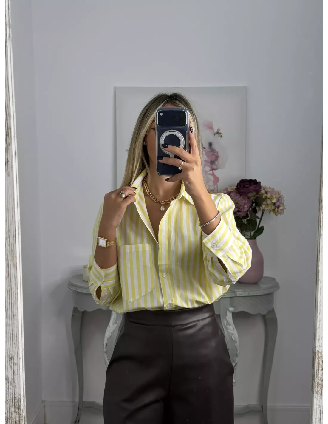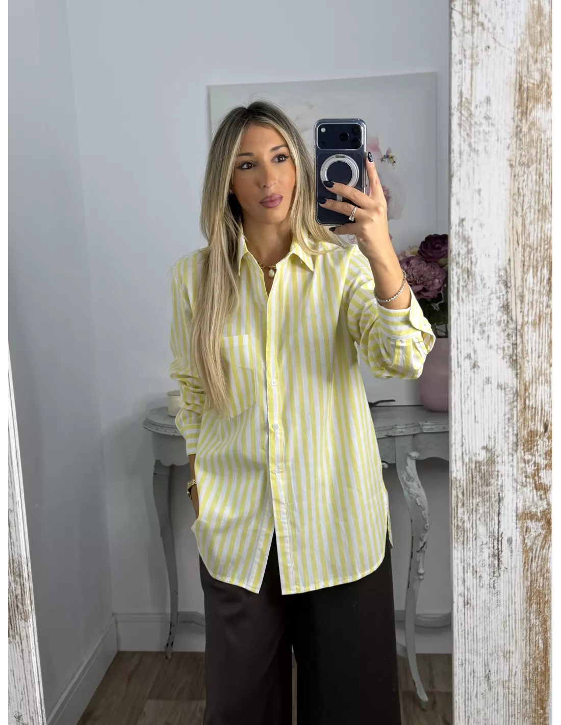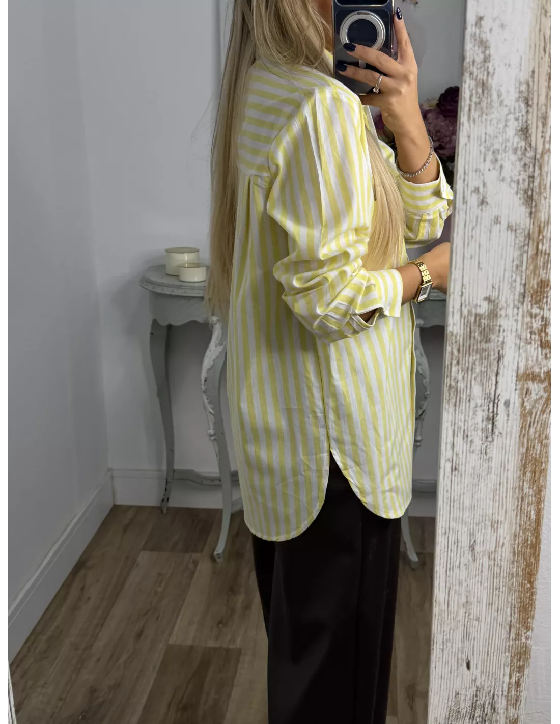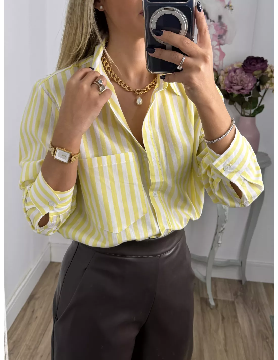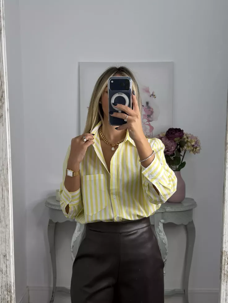Camisa de rayas. Es de manga larga y tiene un bolsillo. El corte de la camisa es recta, no es ajustado.