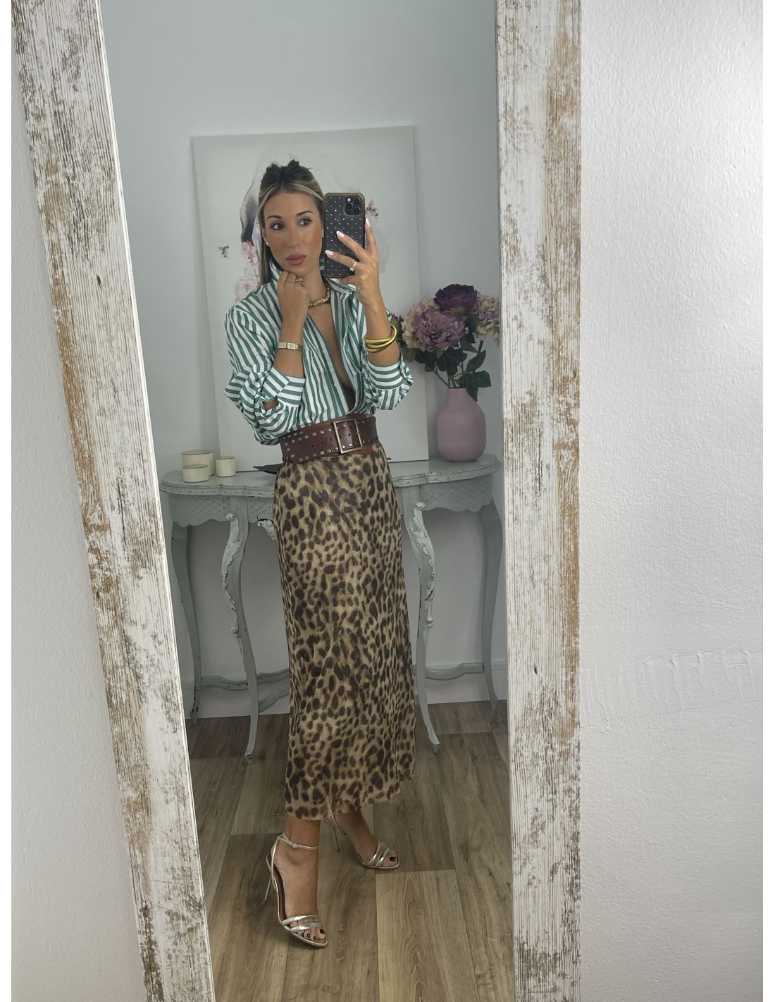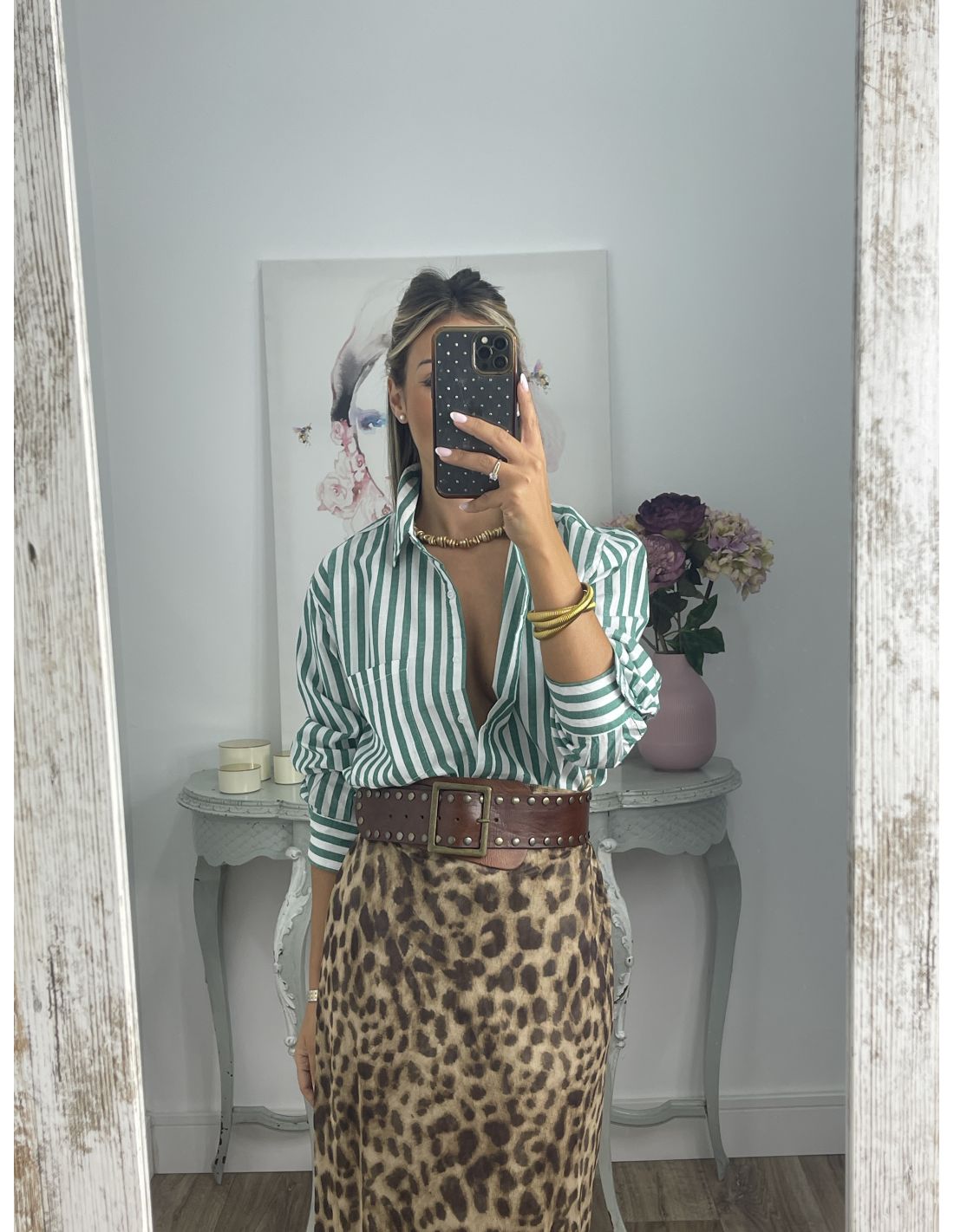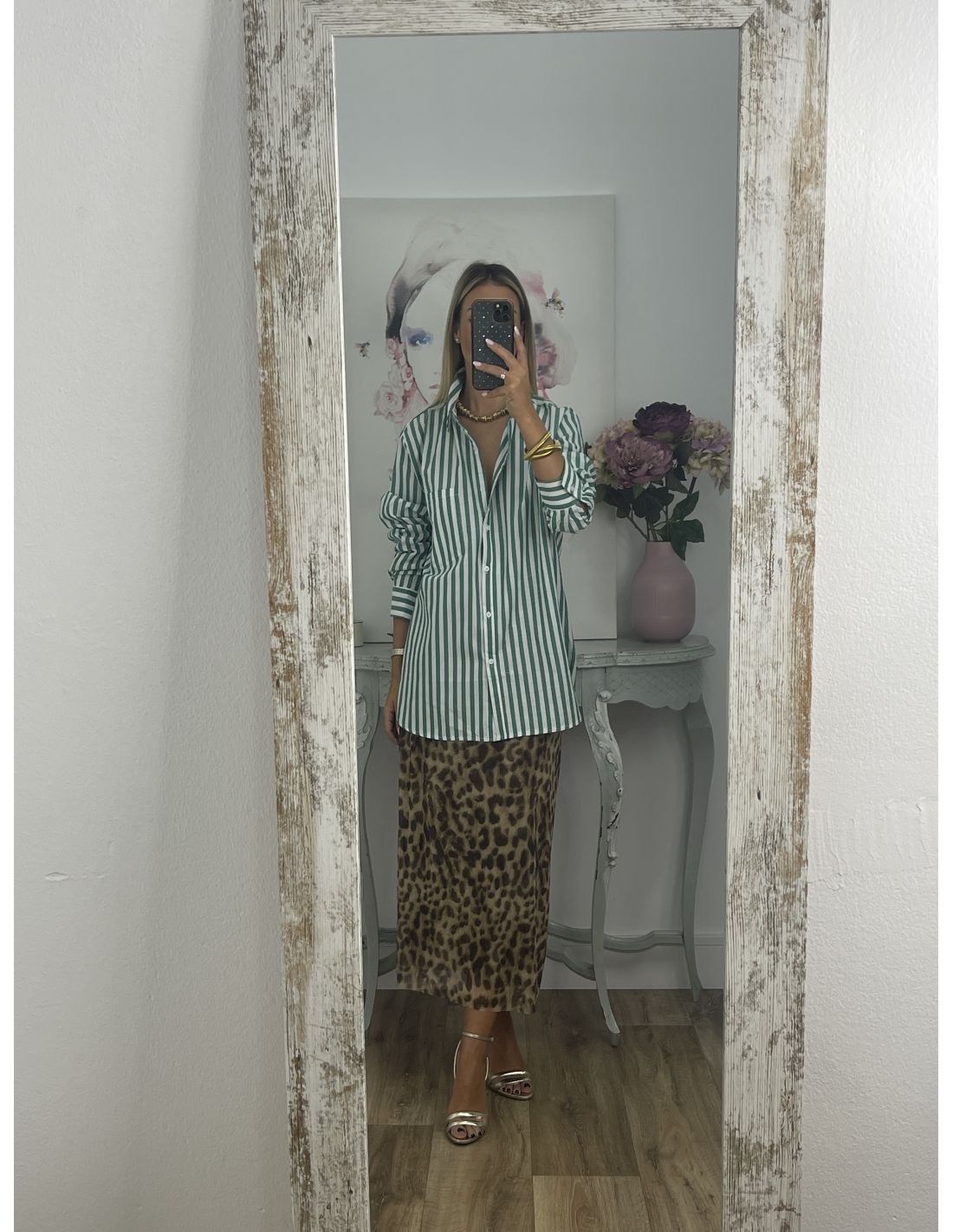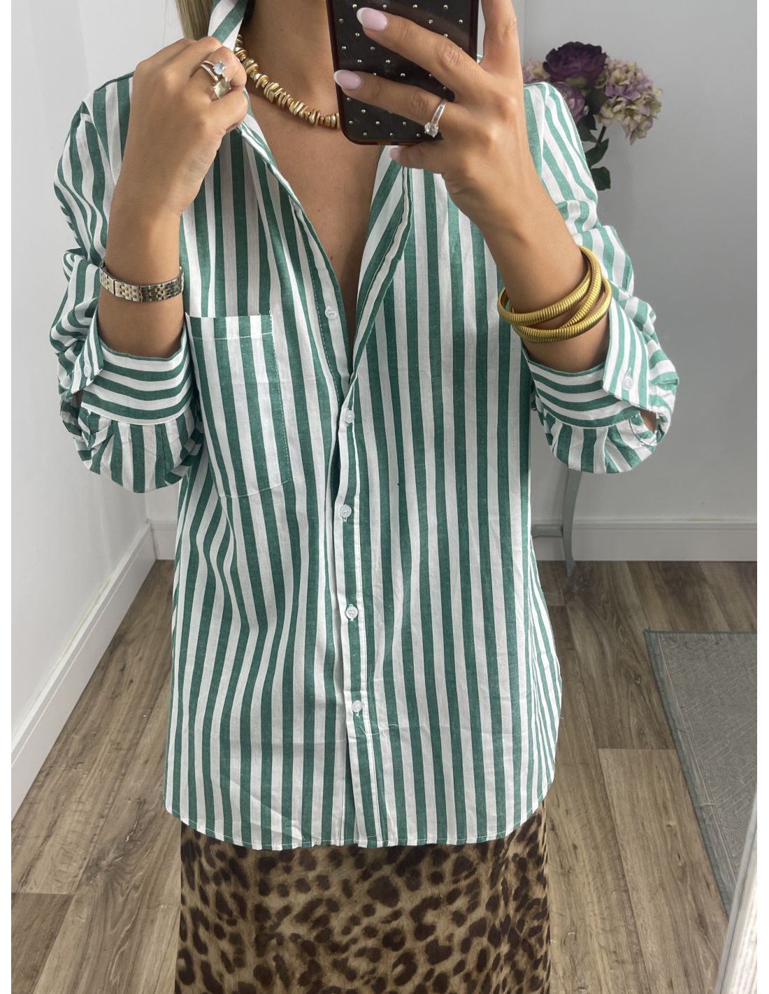 Camisa de rayas. Es de manga larga y tiene un bolsillo. El corte de la camisa es recta, no es ajustado.