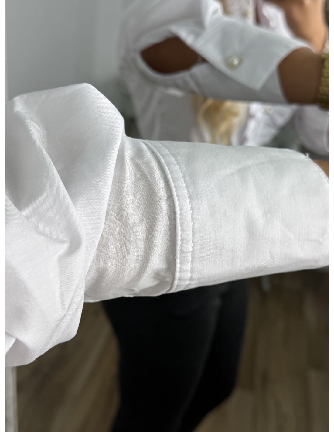 Camisa celeste que lleva volante en la parte delantera. Lleva pinzas y hace forma..