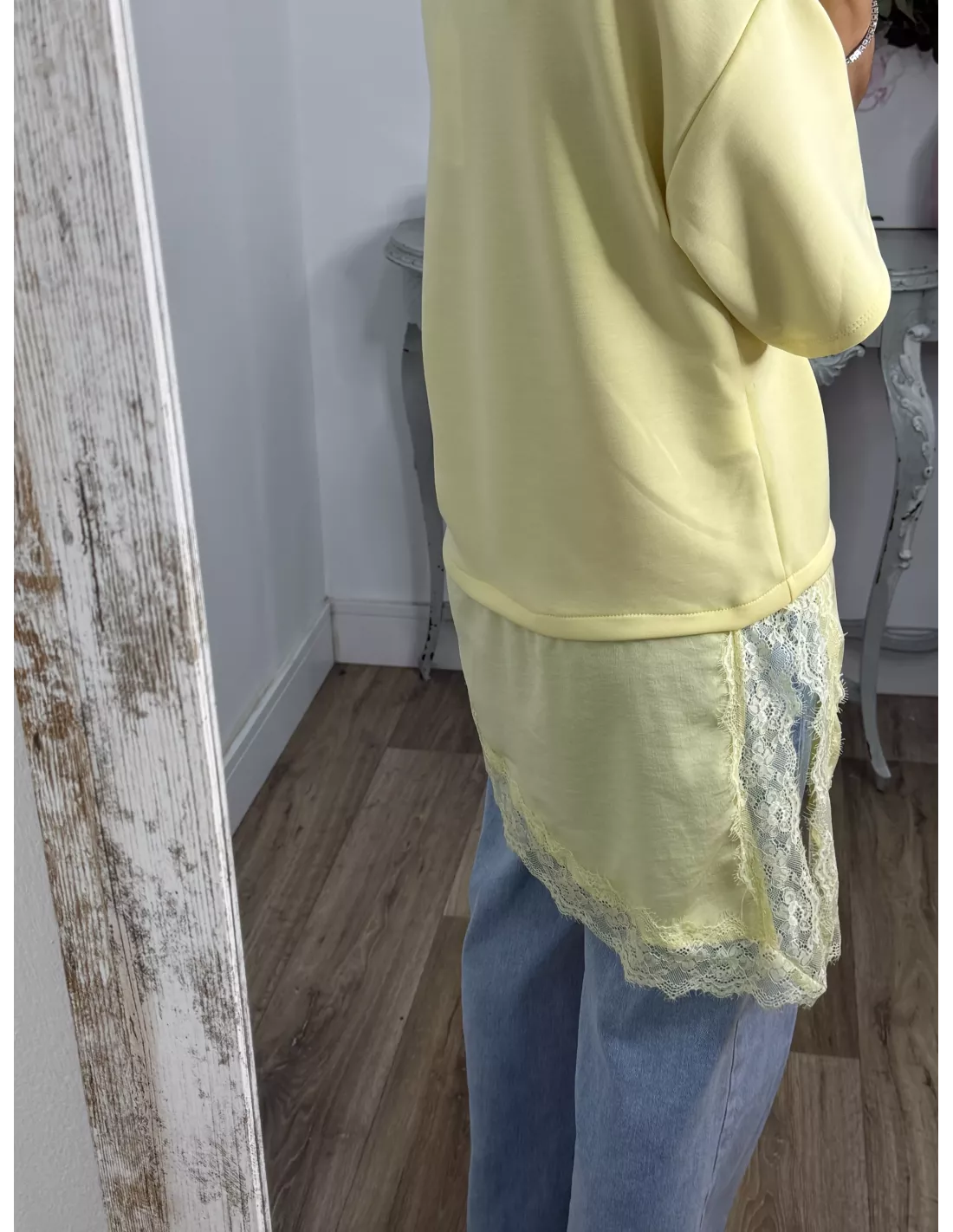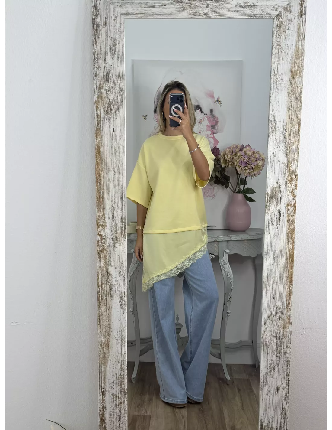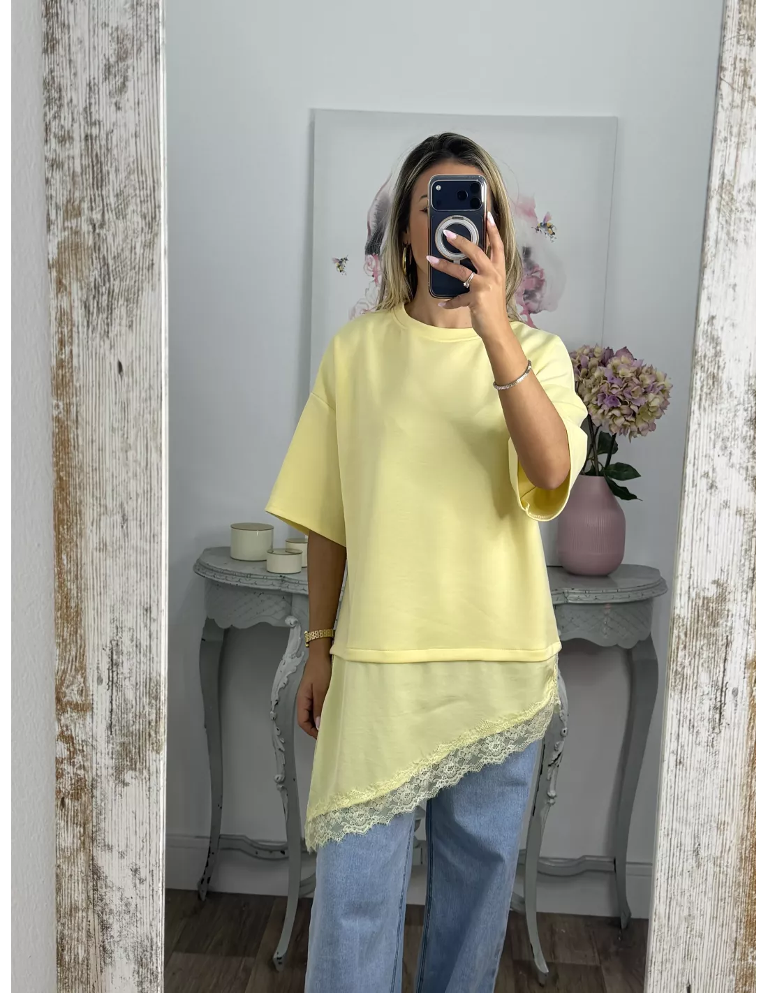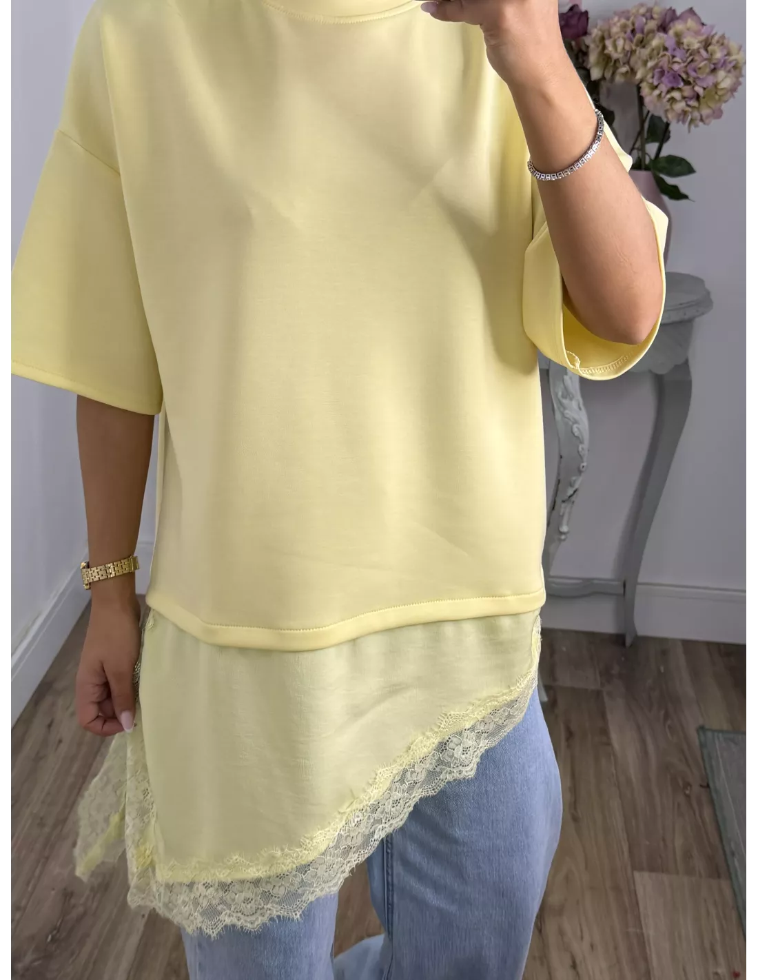 Camiseta de cuello a la caja De corte amplio y versifica. En el banco cinético y lleva una puntilla.