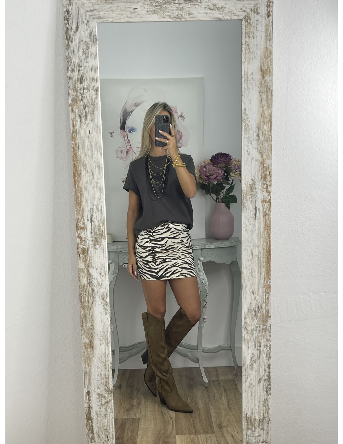 Camiseta básica de cuello a la caja de manga corta y corte recto. La modelo lleva puesta la talla XL para que le quede ese efecto amplio y oversize.