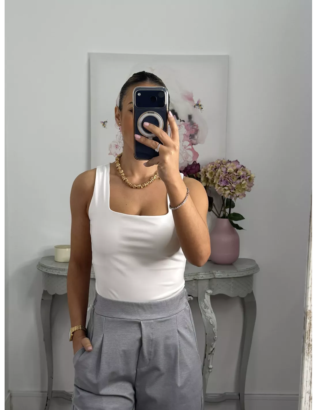 Camiseta básica licra blanca escote cuadro