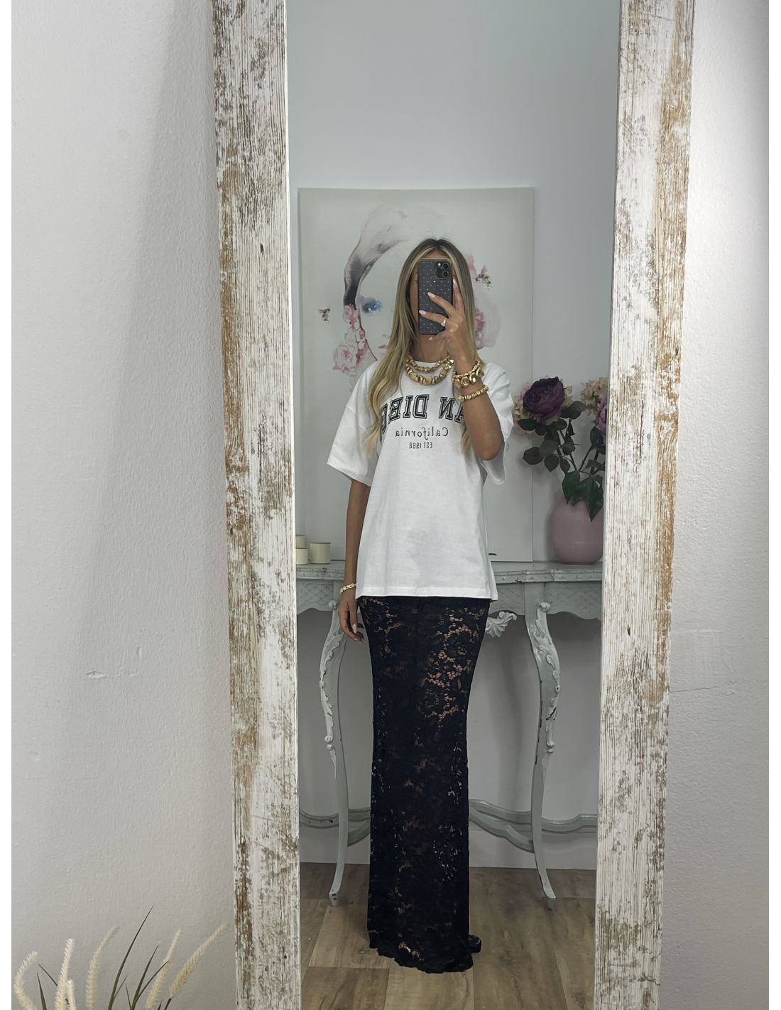 Camiseta de manga corta de cuello a la caja de corte recto. Tiene unas letras en el centro que ponen San Diego.