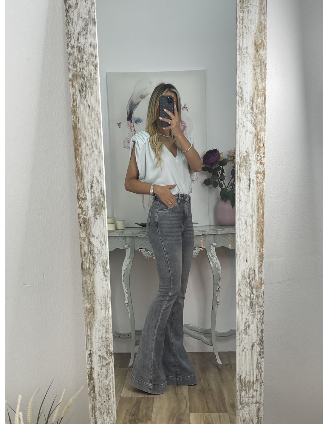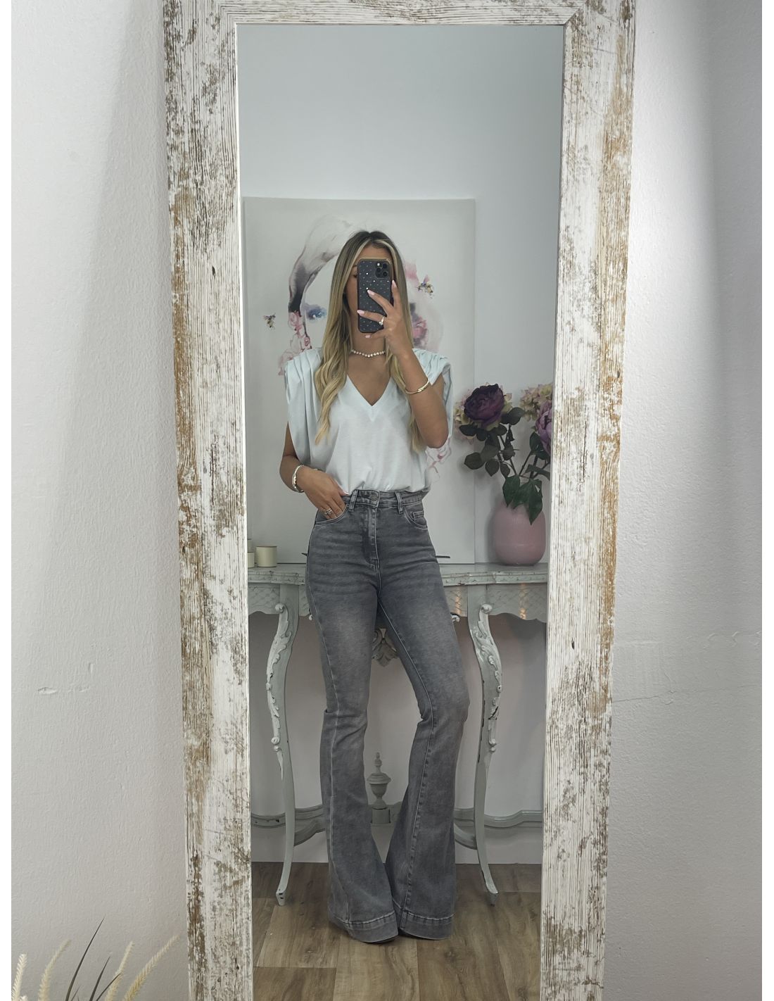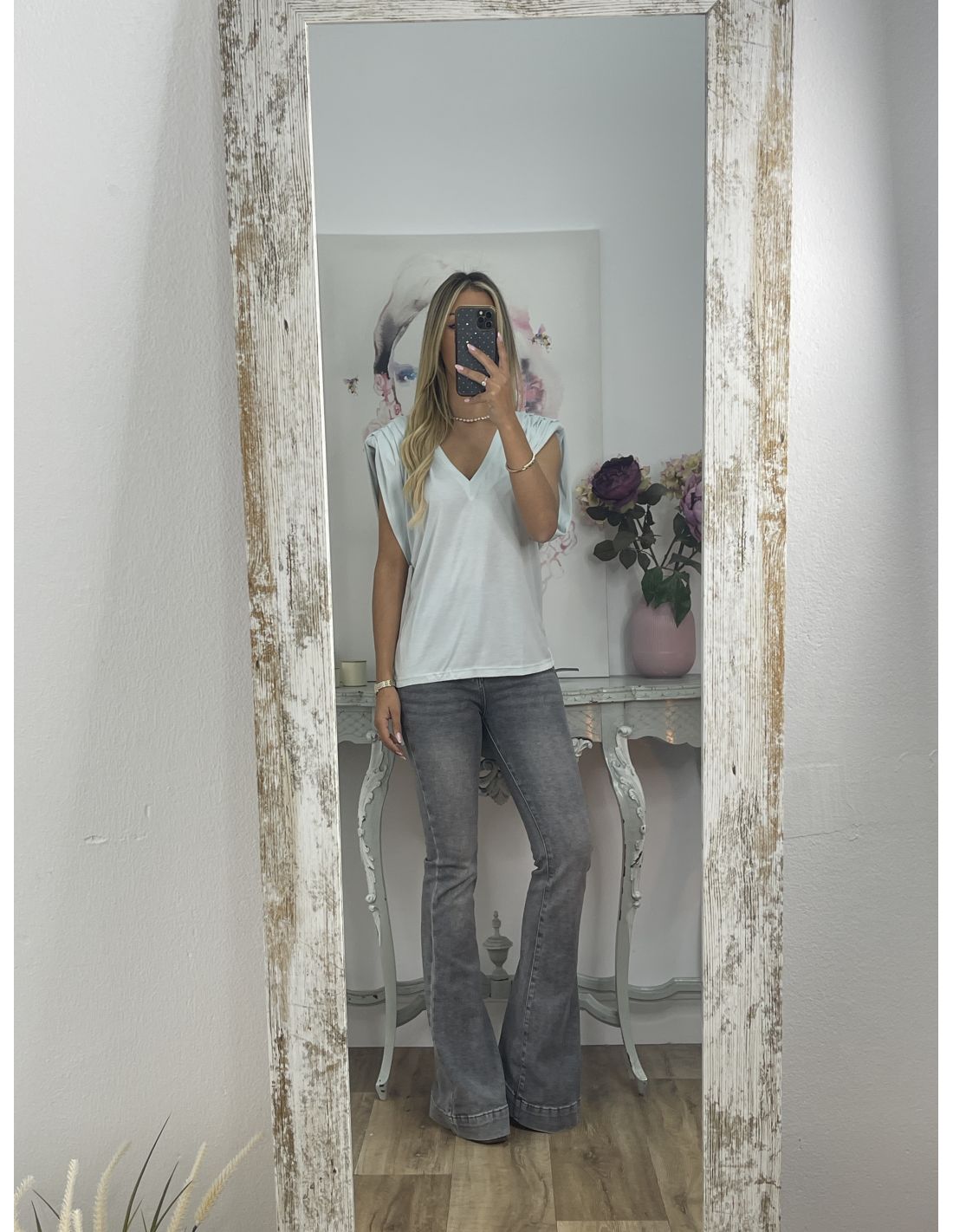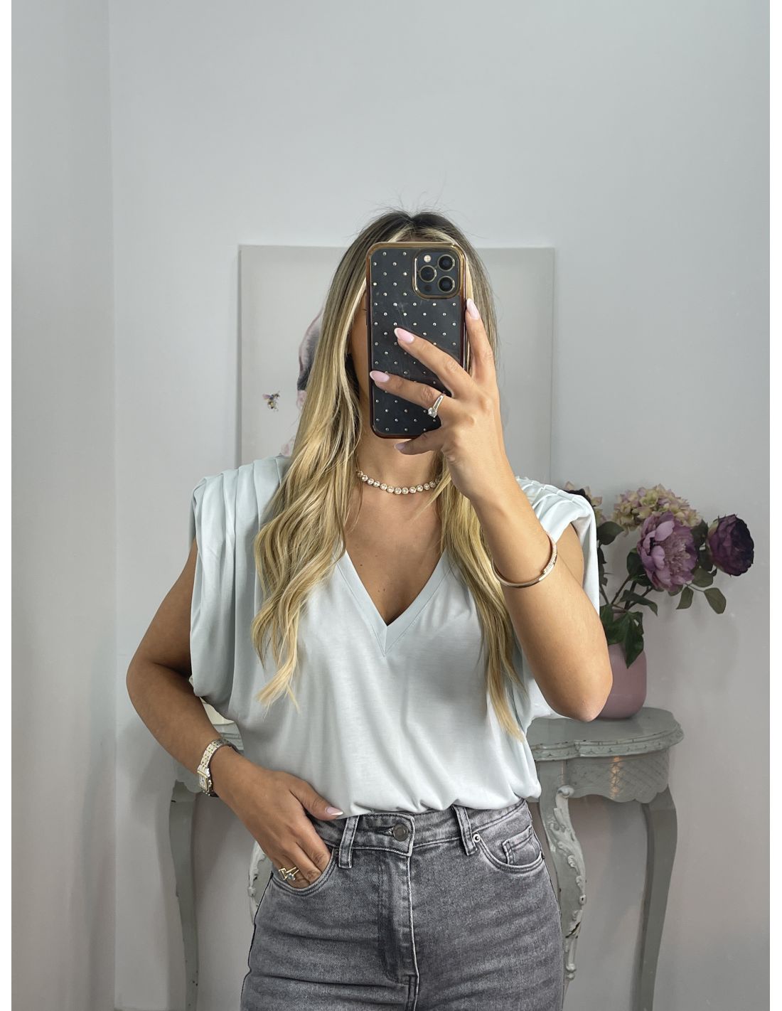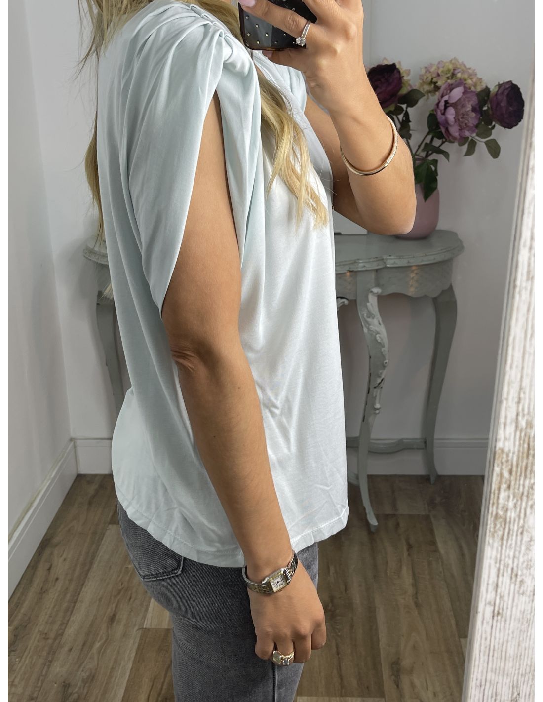 Camiseta de cuello de pico con hombreras pronunciadas que en la zona del hombro lleva unas pliegues.