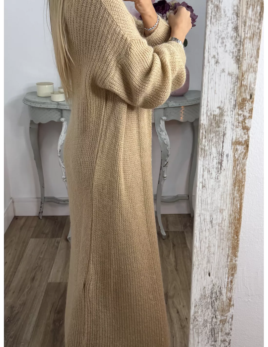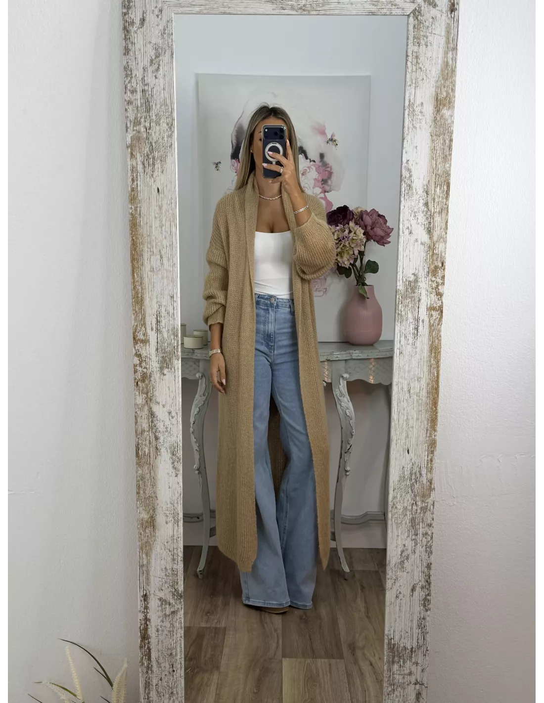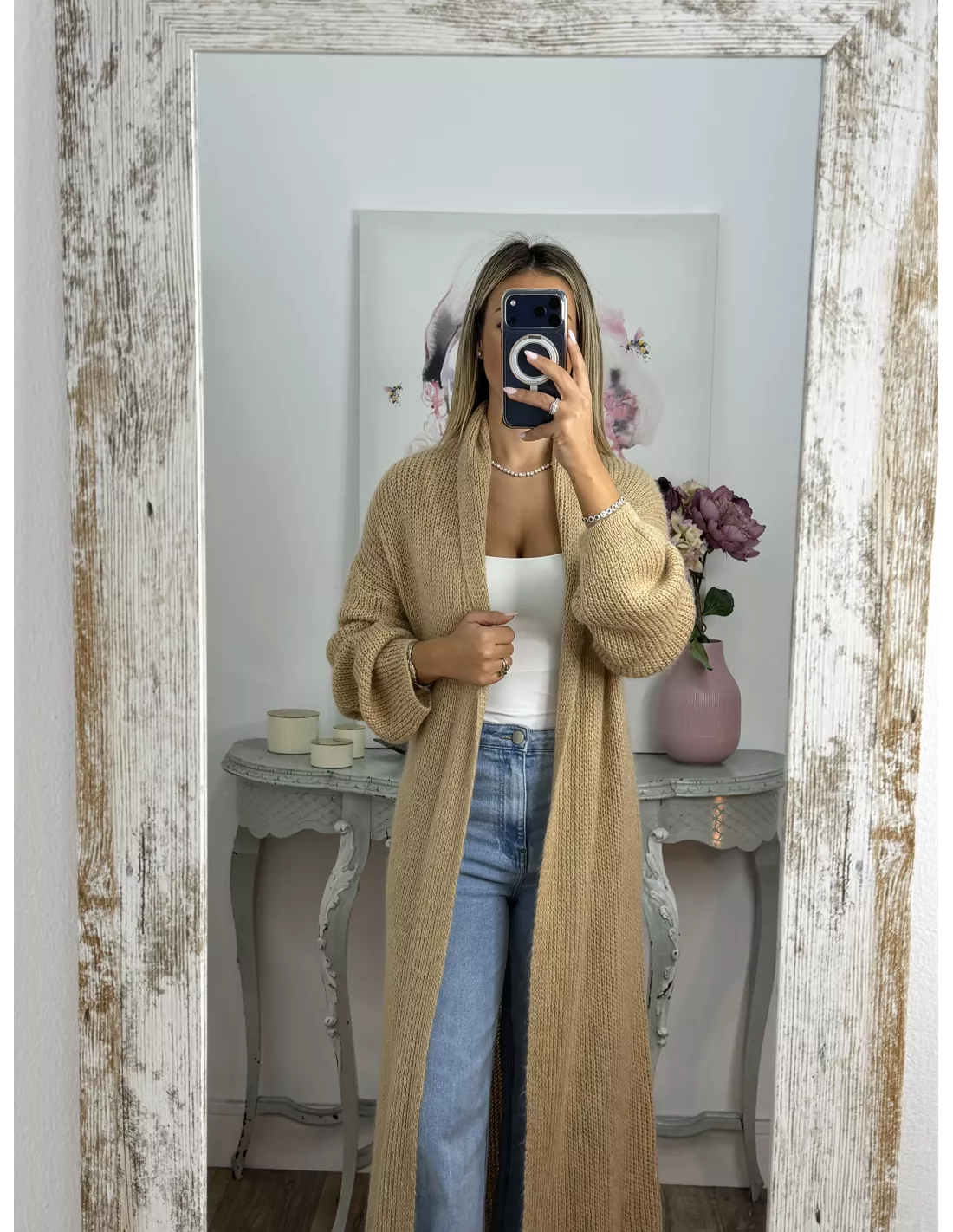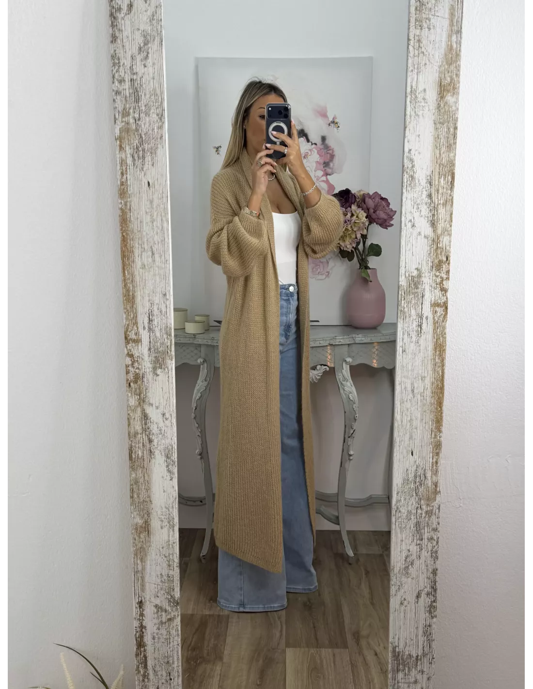 Cardigan largo de hombro oversize. El corte es recto y a la caída no trae botones para cerrarlo.