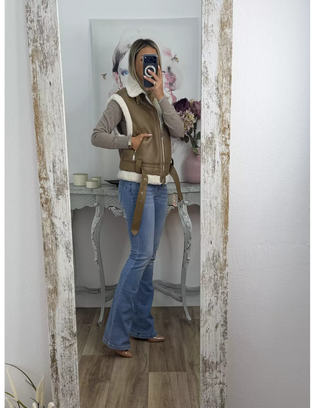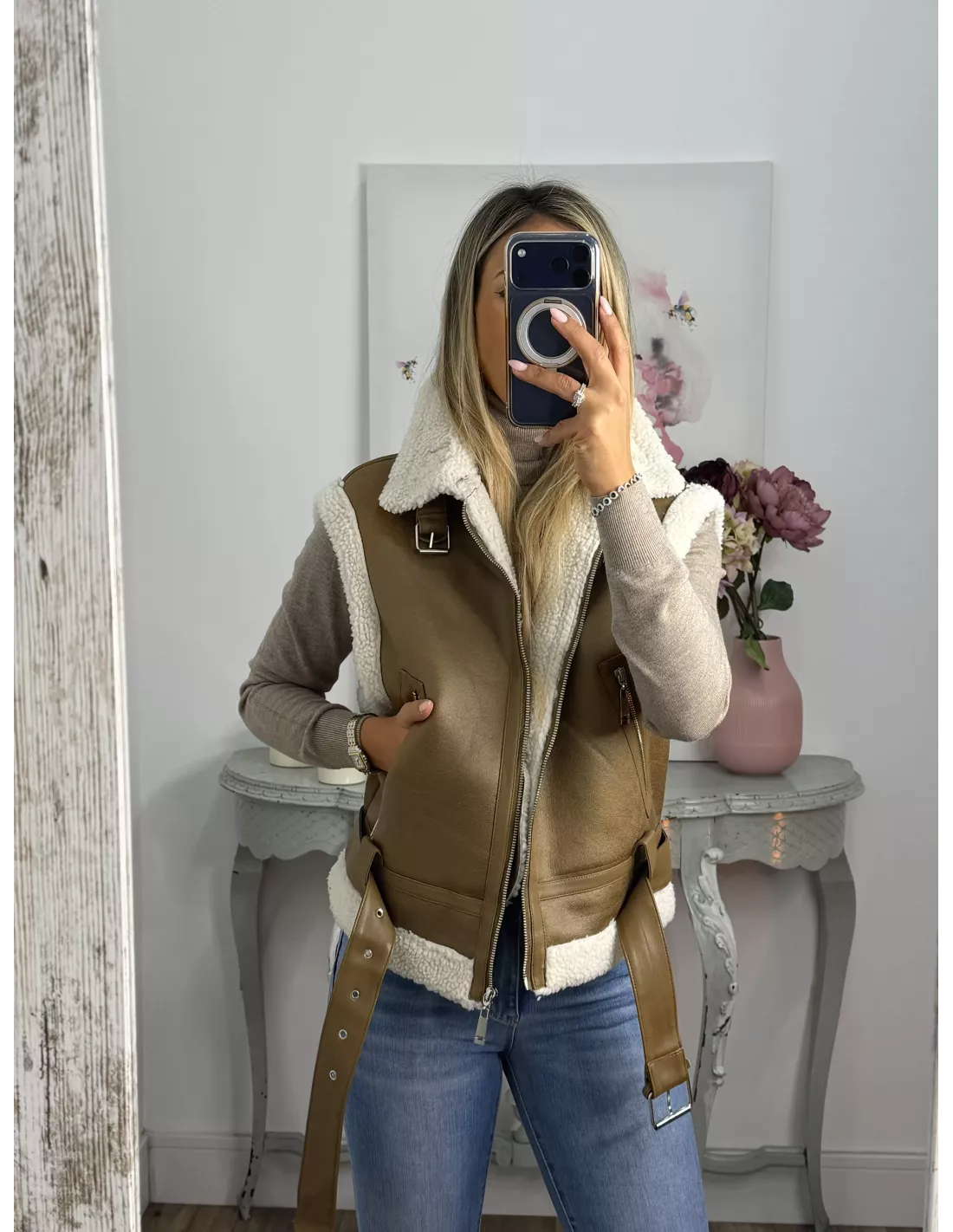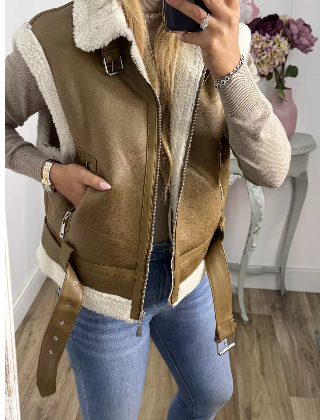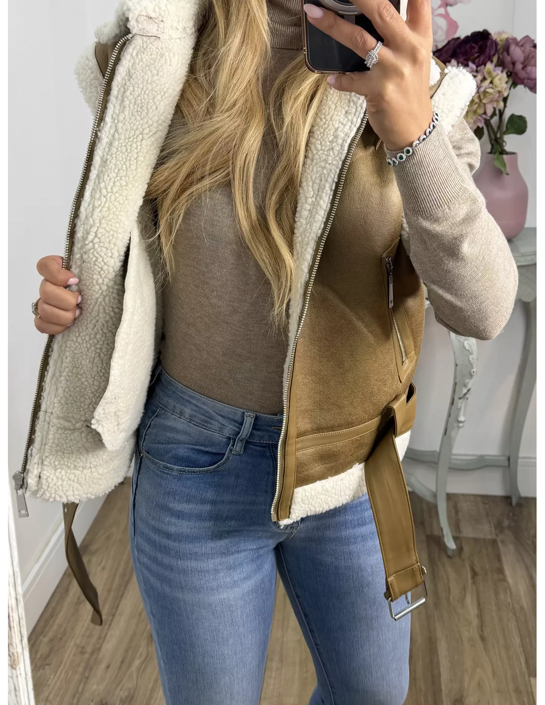 Chaleco de antelina la parte exterior y borreguito por dentro. Los detalles de las cremalleras son en plateado.