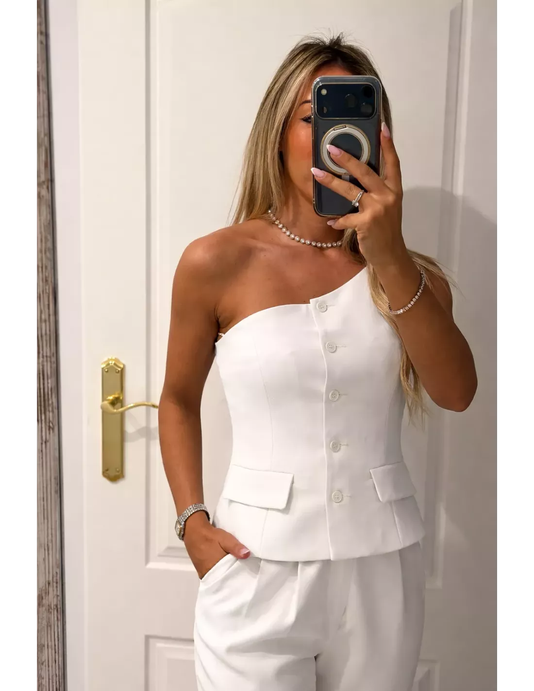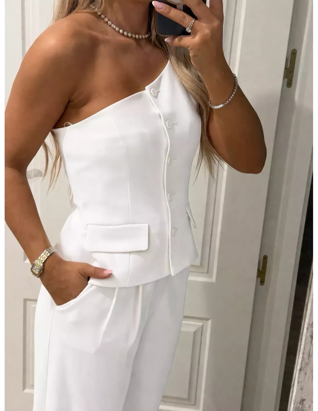 Chaleco abotonado de corte asimétrico. Va forrado.