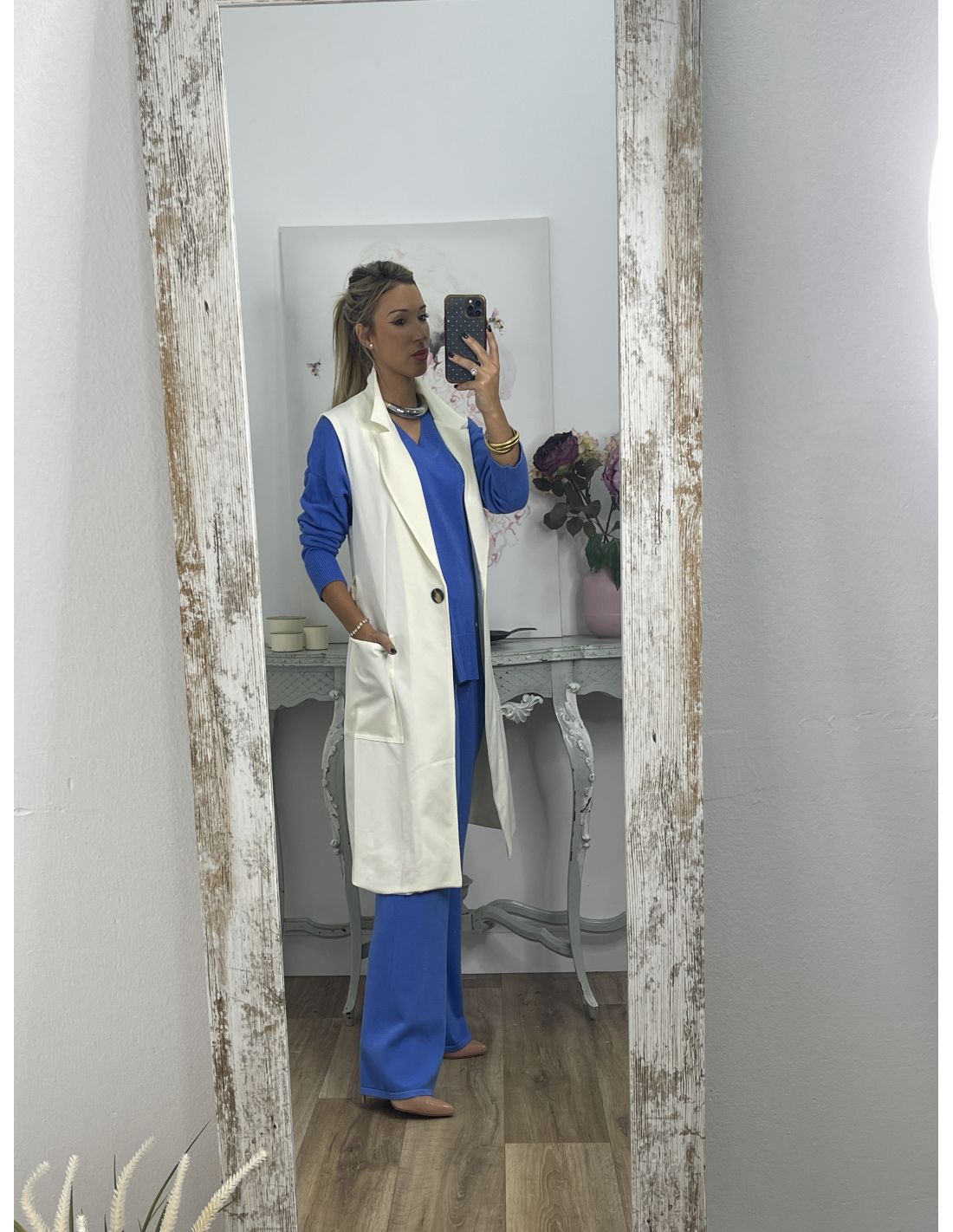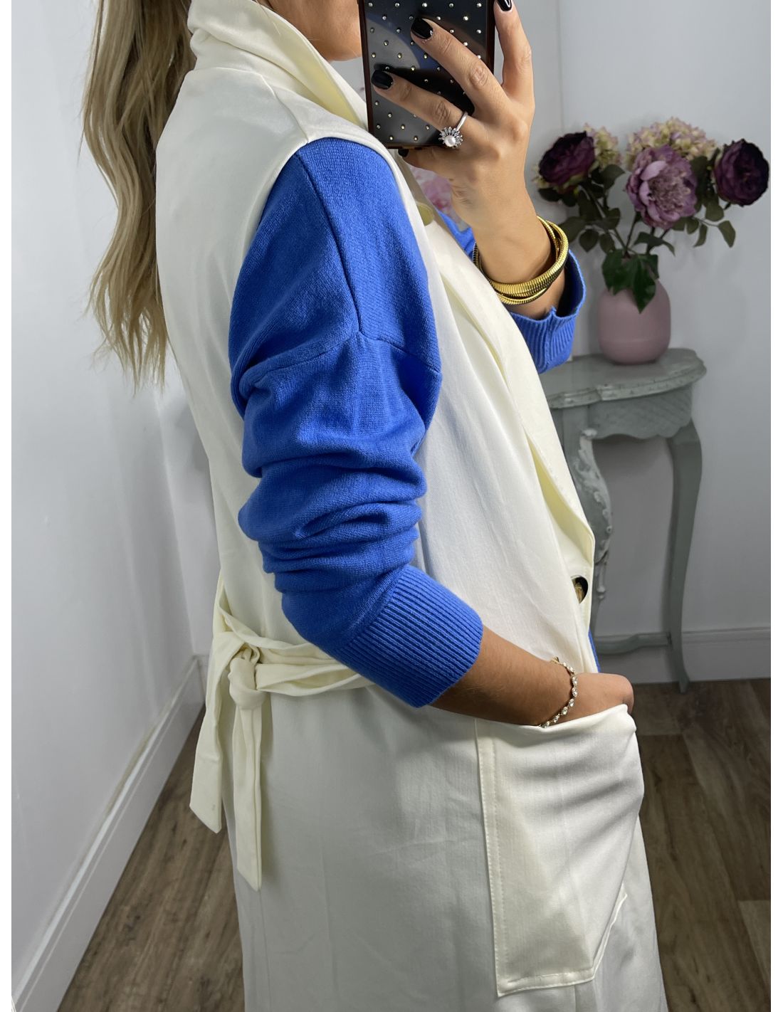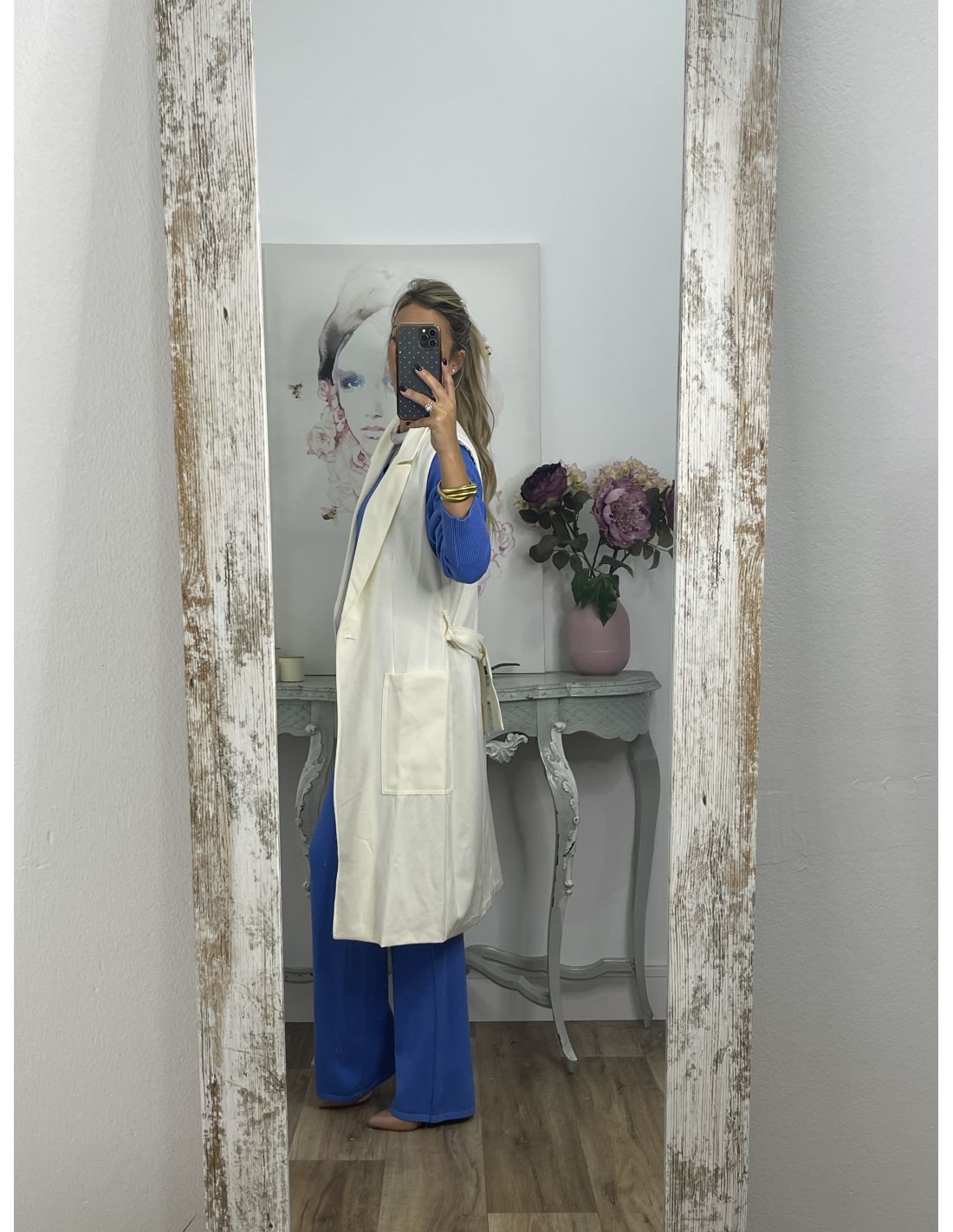 Chaleco largo, de corte tipo gabardina que se puede cerrar con un solo botón, Va forrado y trae cinturón del mismo tejido.
