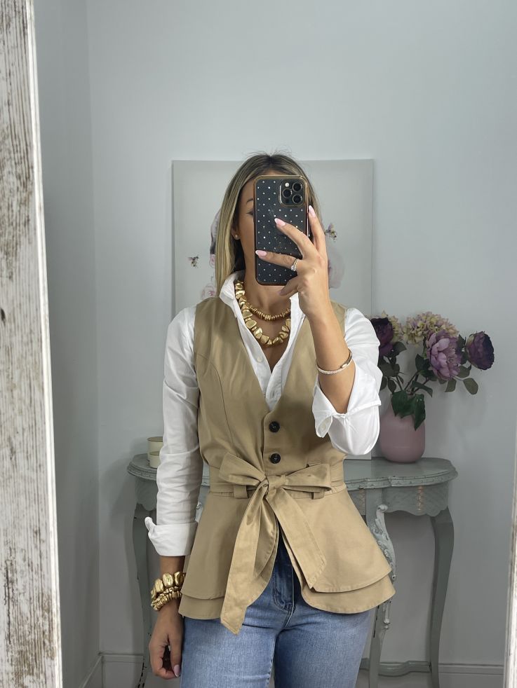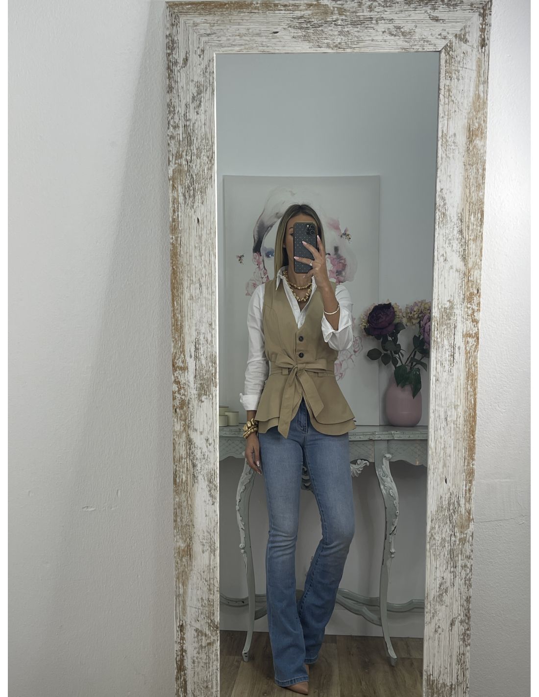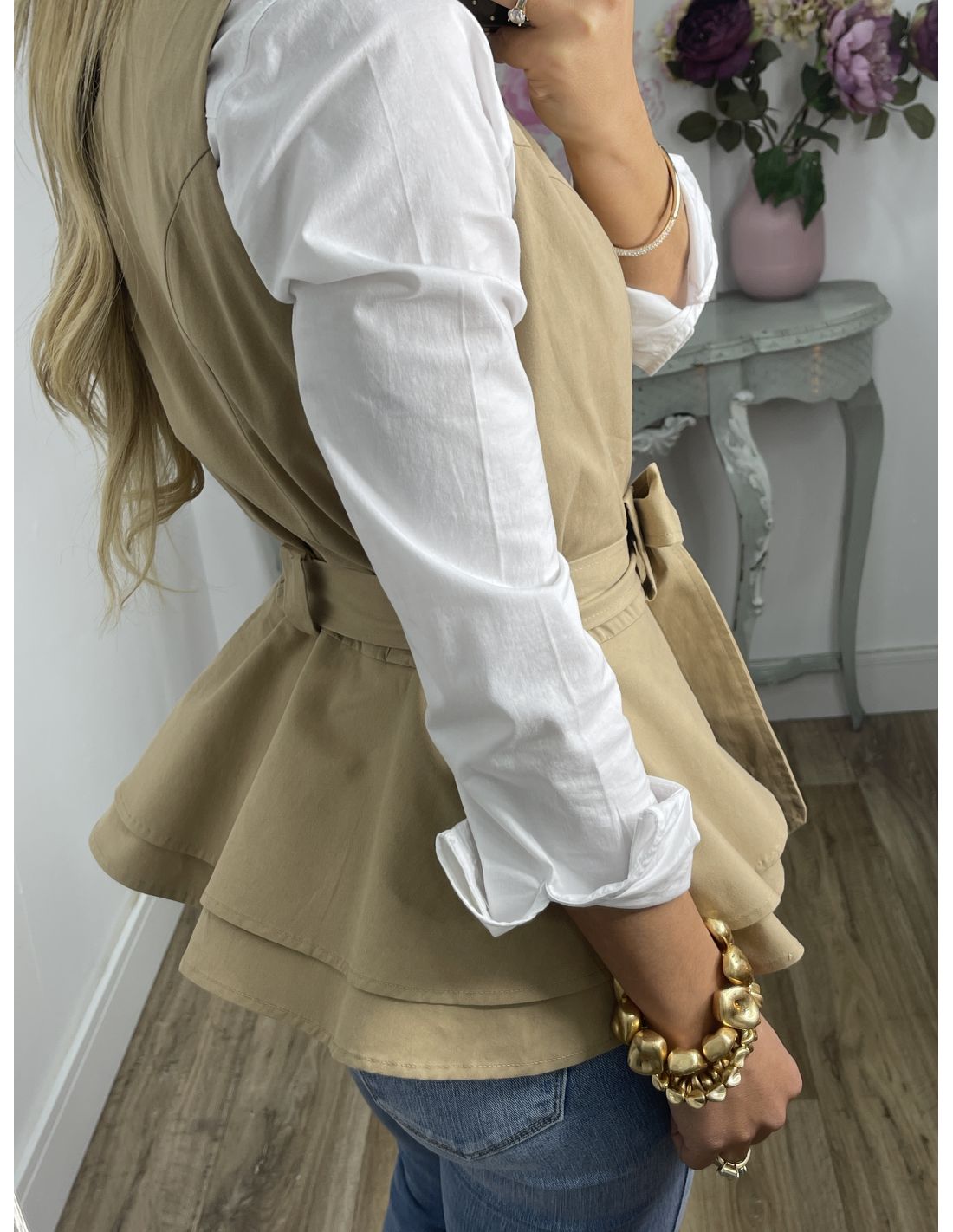Chaleco de corte peplum con dos volantes, es abotonado y trae cinturón del mismo tejido.