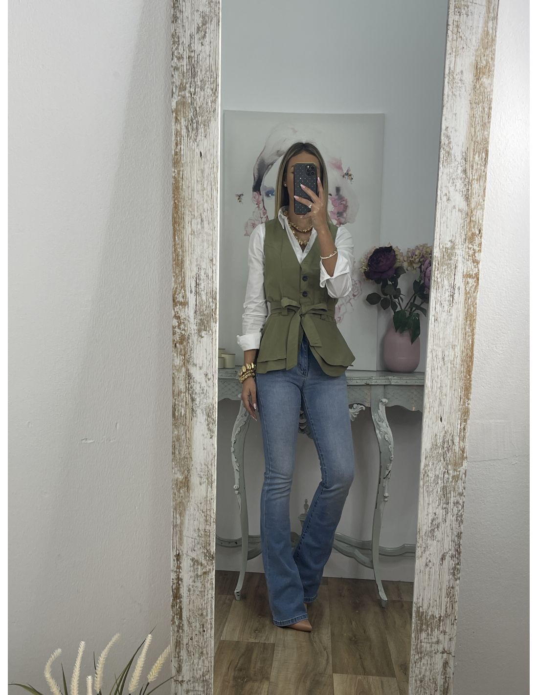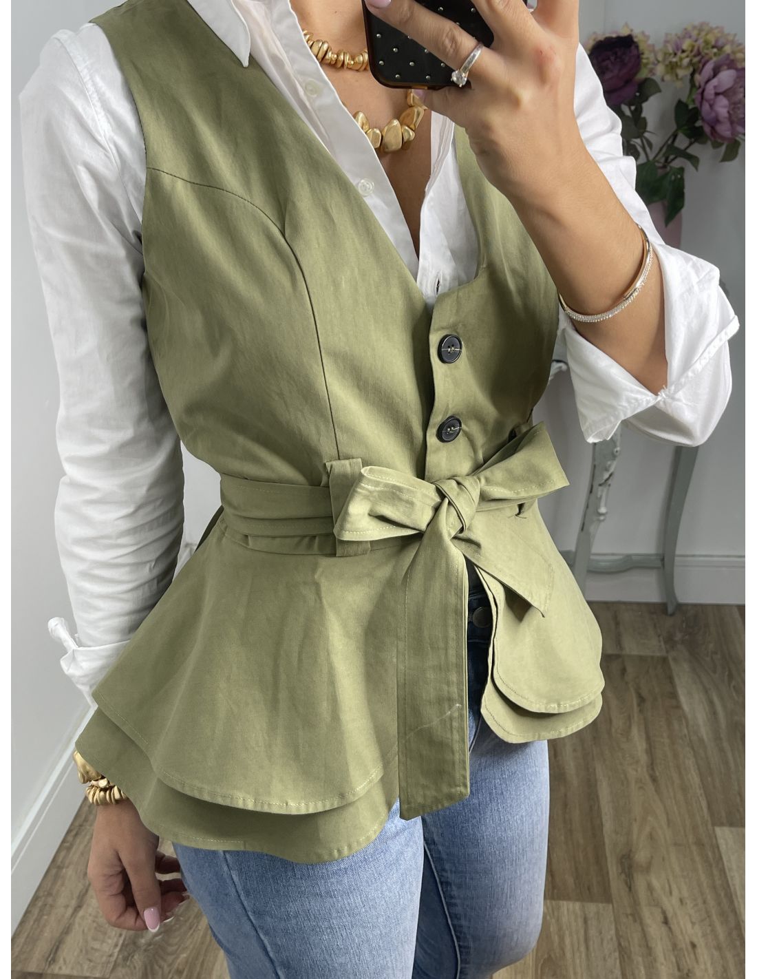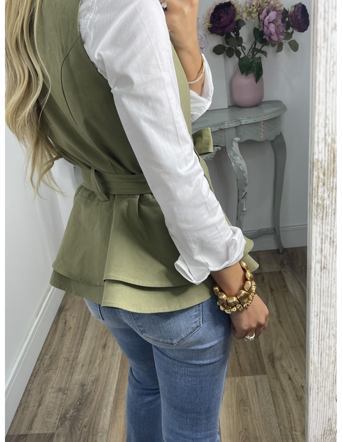 Chaleco de corte peplum con dos volantes, es abotonado y trae cinturón del mismo tejido.