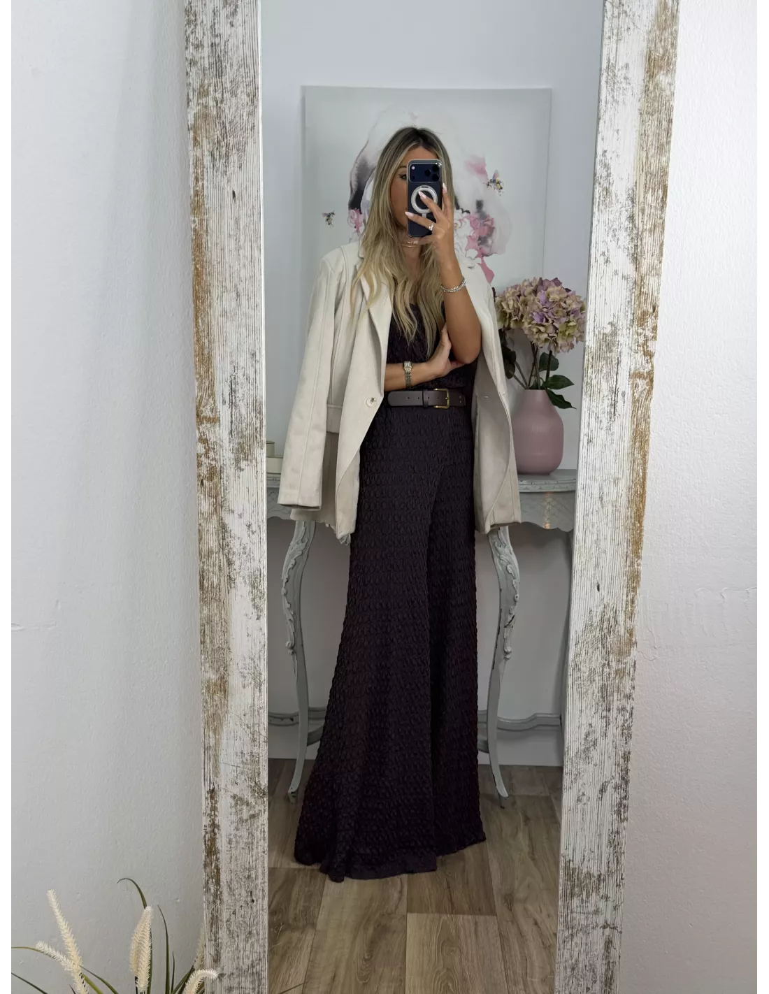 Chaqueta de antelina de corte montado. Lleva hombreras, va forrada. No tiene bolsillos. Es más ancha de la zona de los hombro y más estrecha de la cintura.