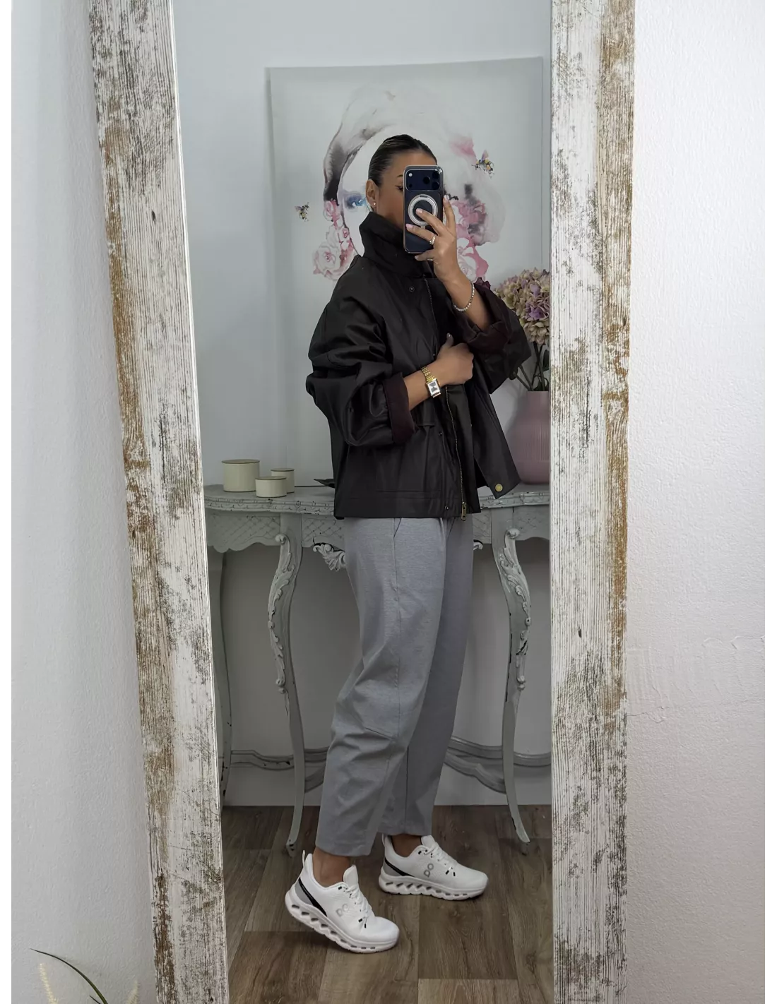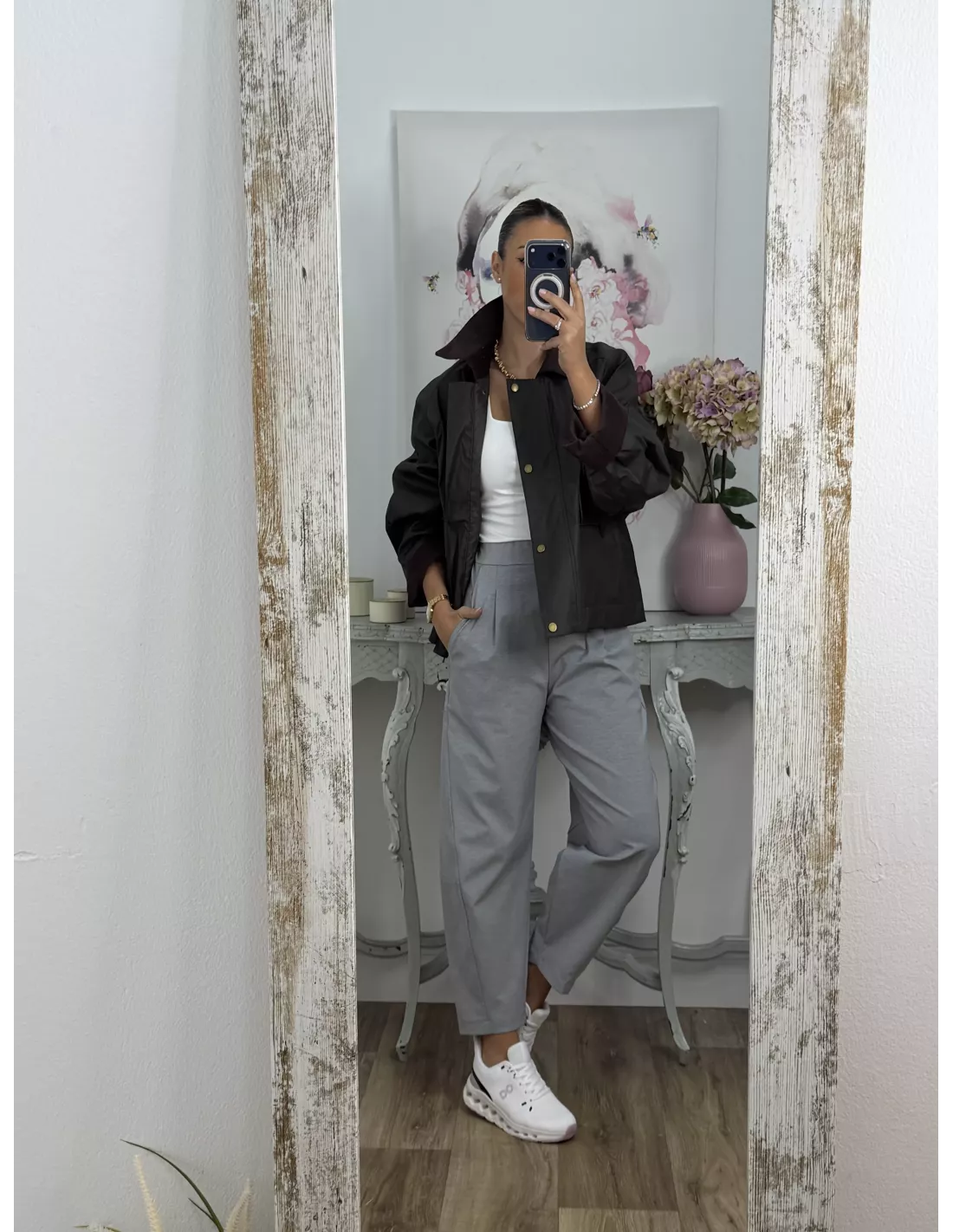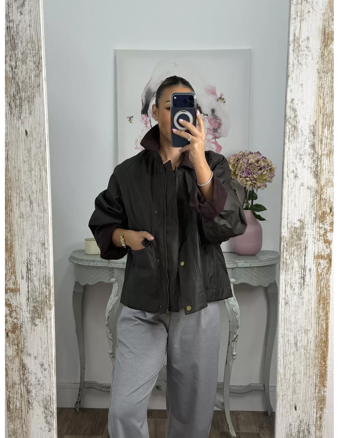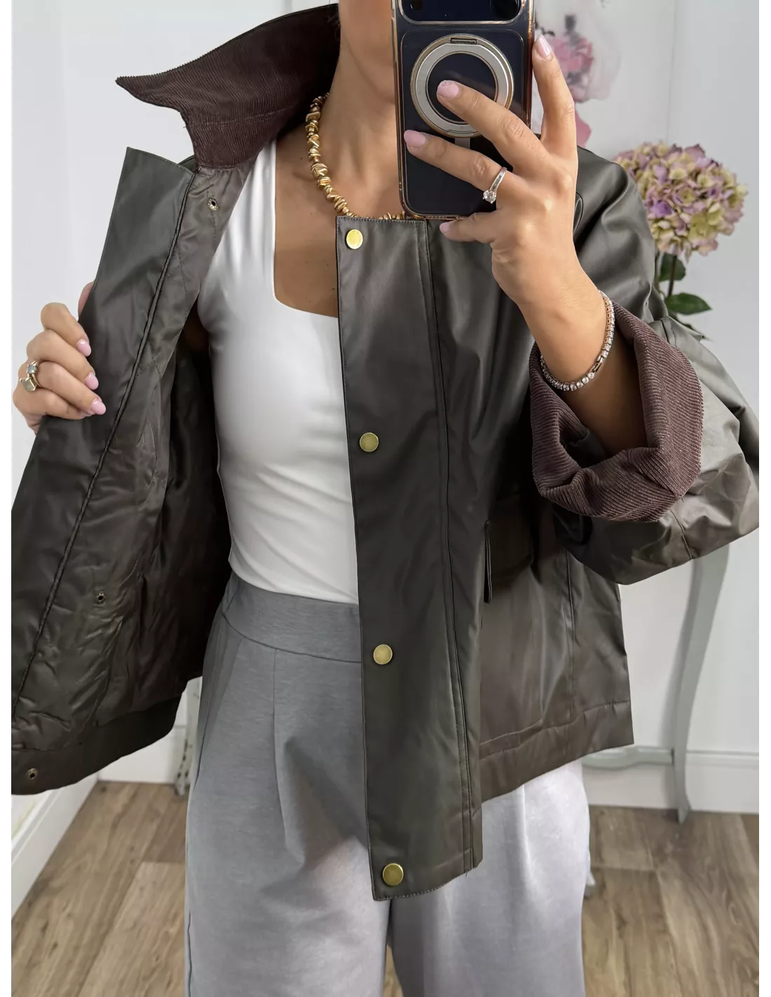 Chaqueta tipo barbou de corte oversize. Es acolchado por dentro, es abrigado. Se cierra con botones de clip y cremallera en dorado envejecido. Es de corte recto. La zona del cuello es de pana en color chocolate. Es impermeable.