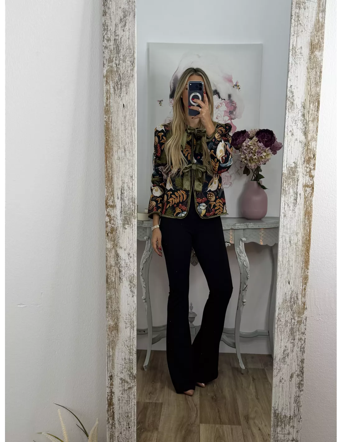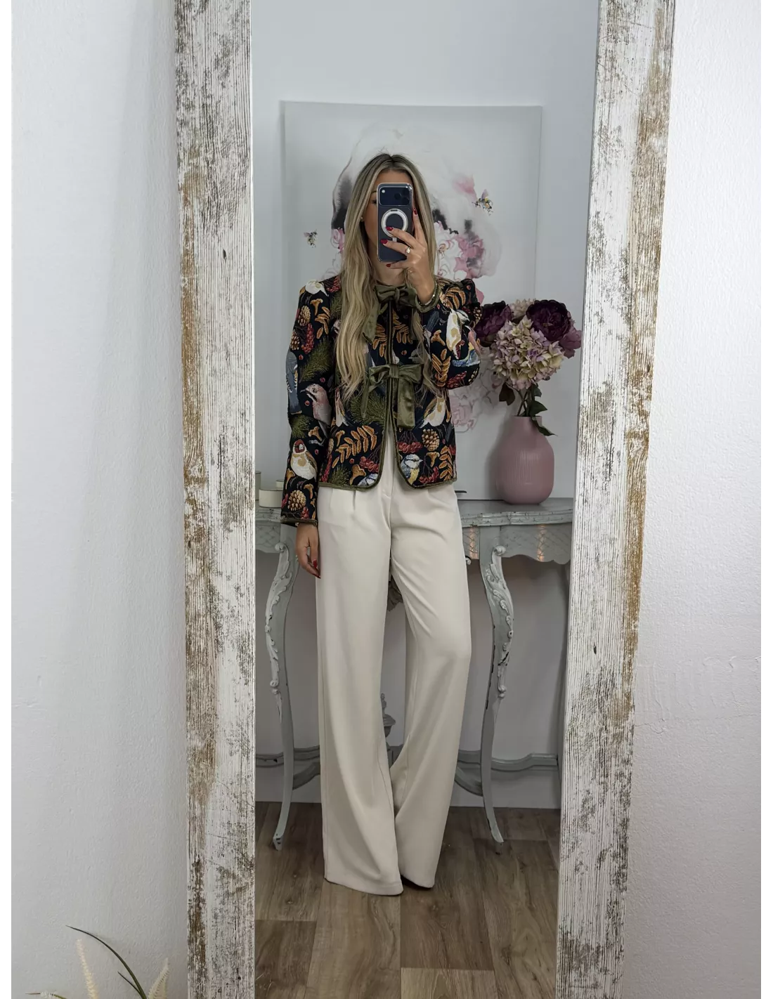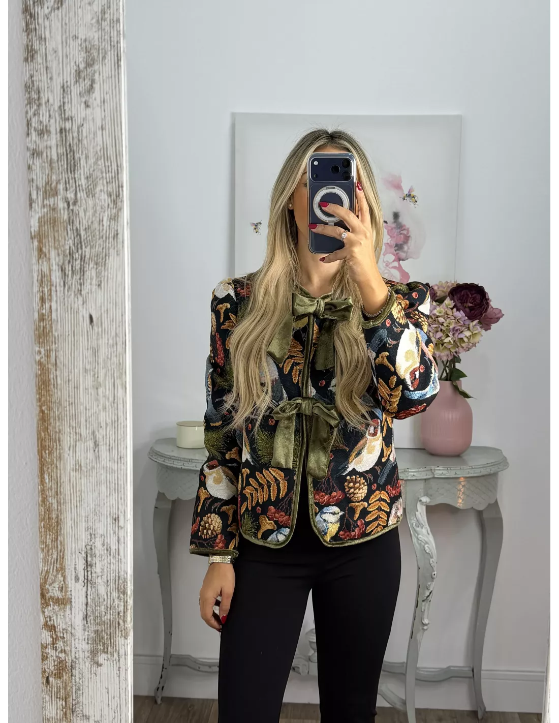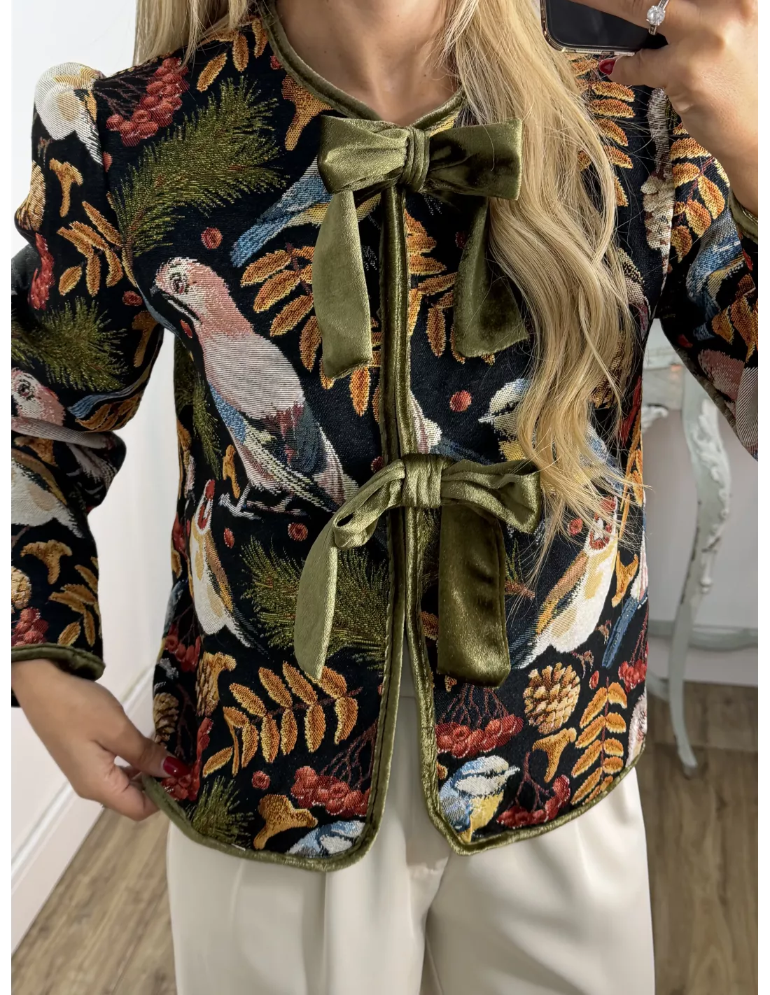 Chaqueta de cuello a la caja con ribete y lazos de terciopelo. Es de corte recto. Va forrada.