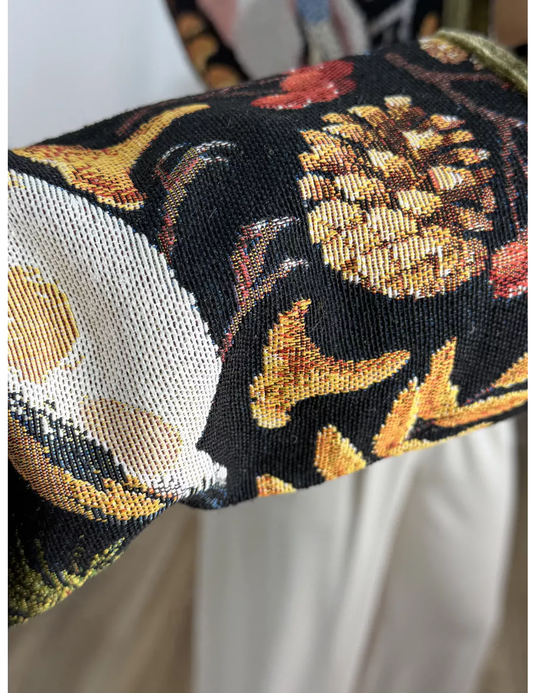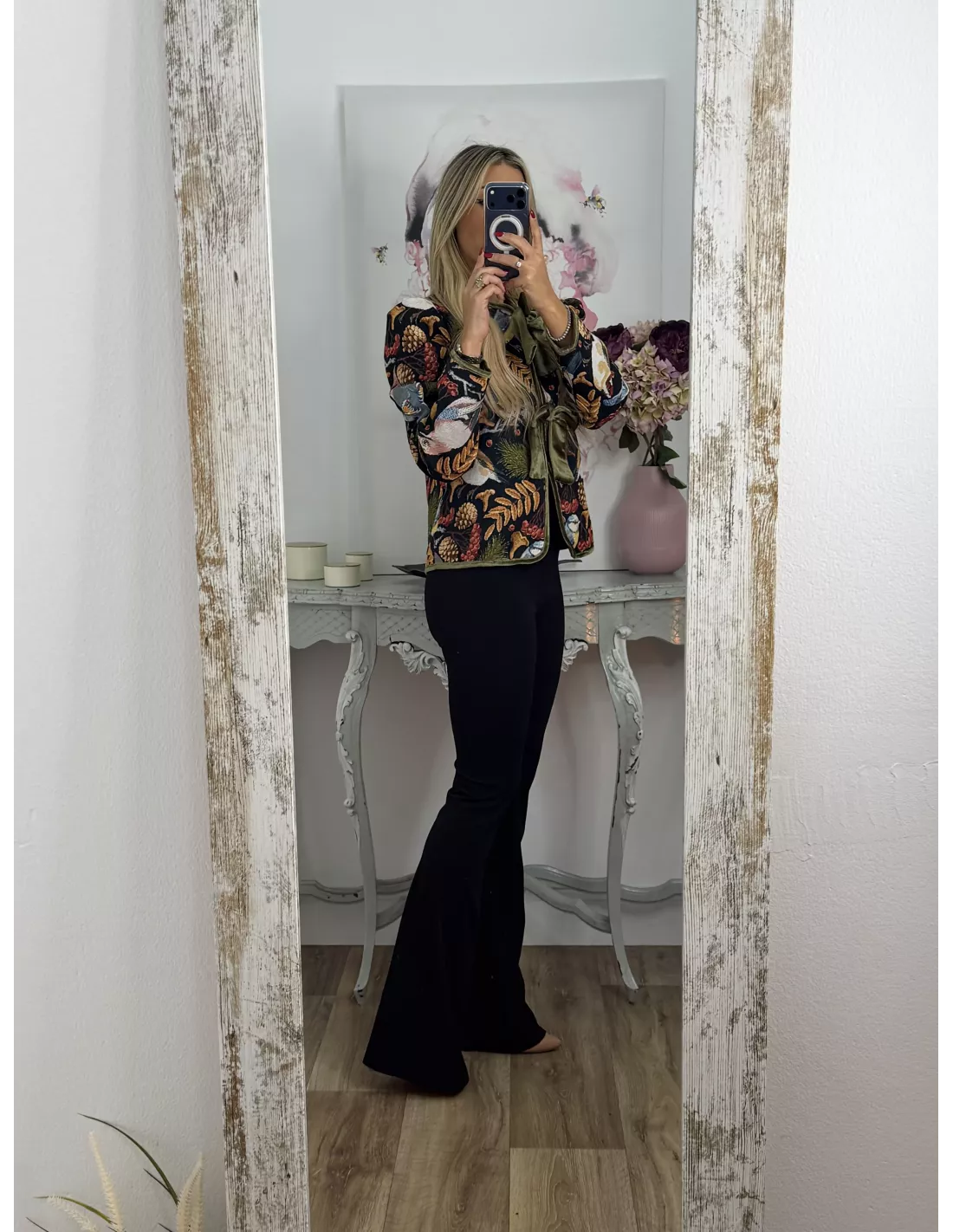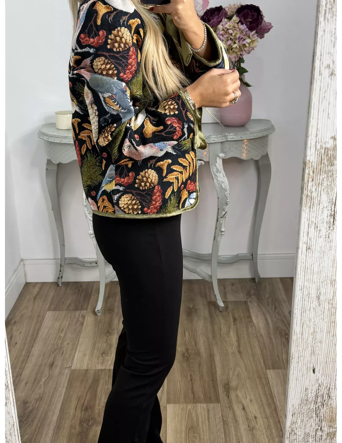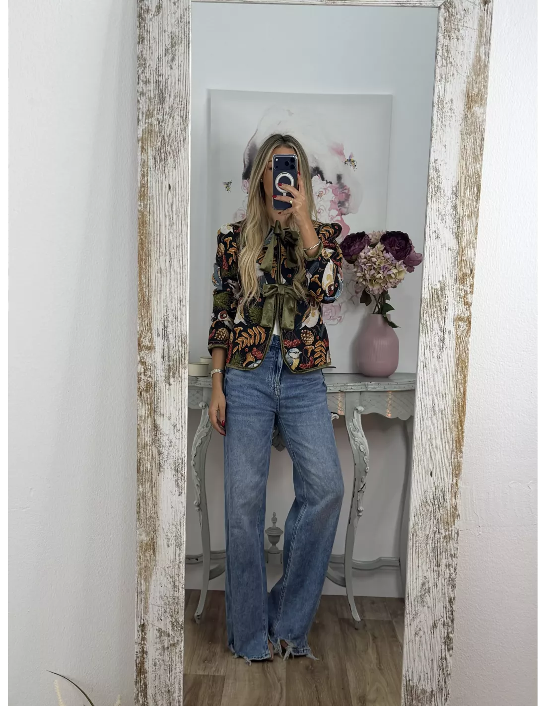 Chaqueta de cuello a la caja con ribete y lazos de terciopelo. Es de corte recto. Va forrada.