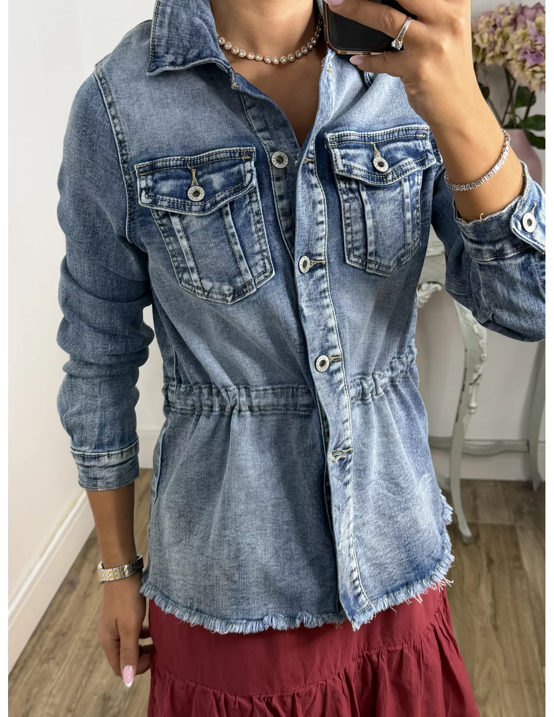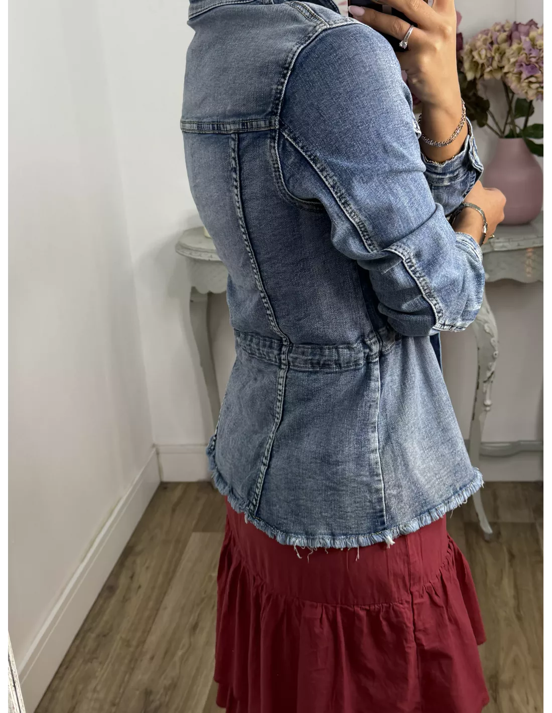 Chaqueta vaquera elástica de efecto desgastado en la parte de abajo, va a desflecada y se ajustan en la cintura. No va forrada. Talla justa de la zona del hombro.