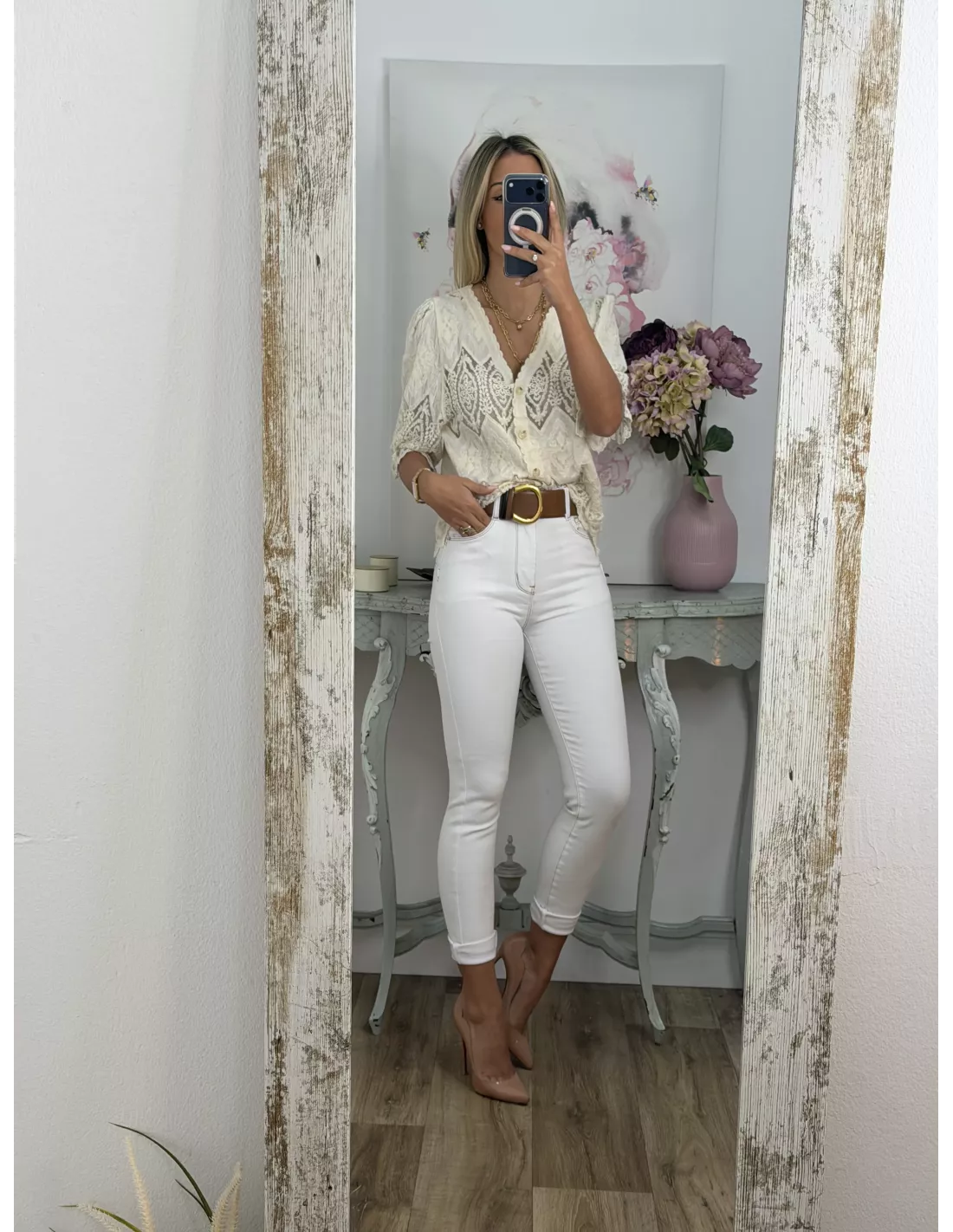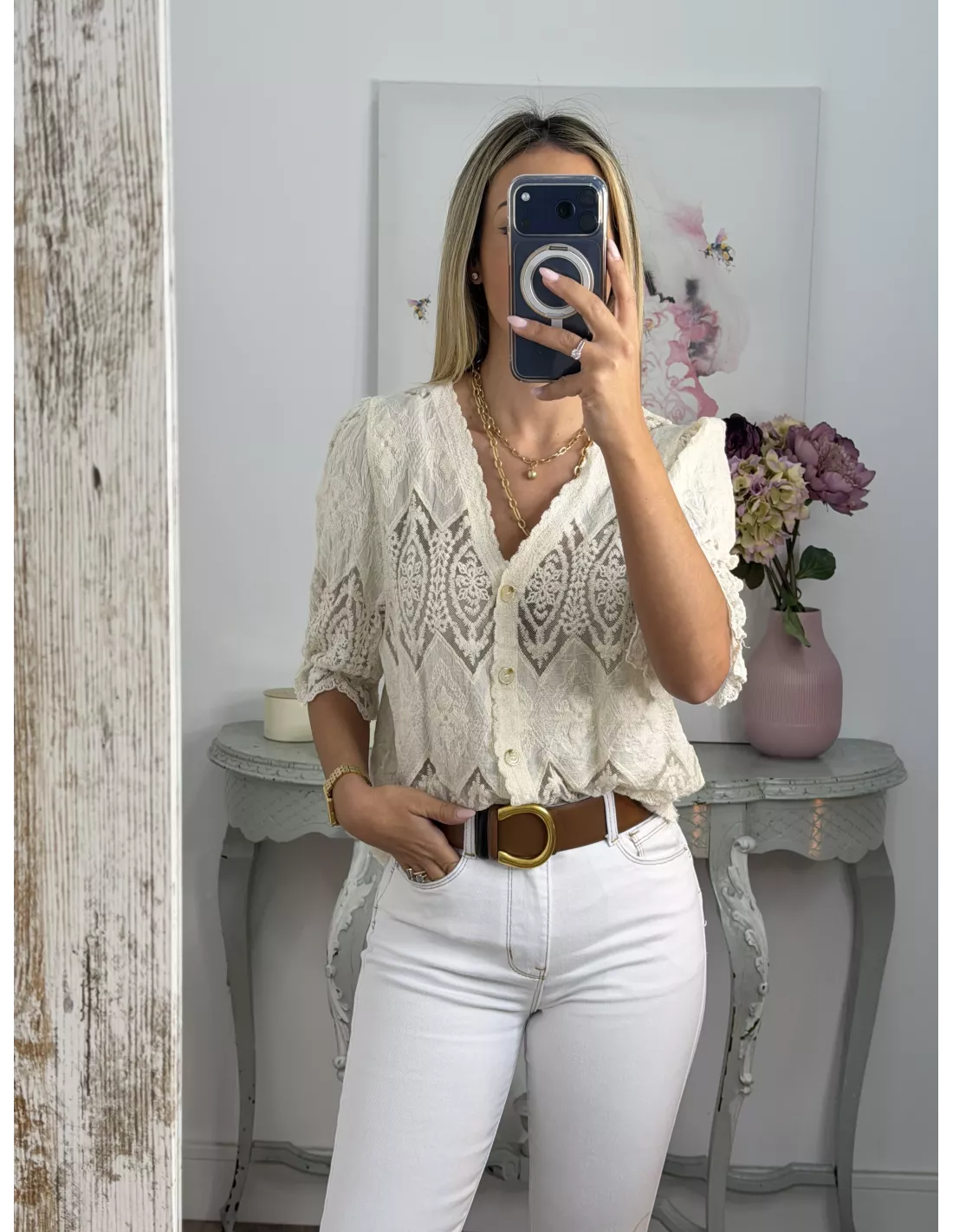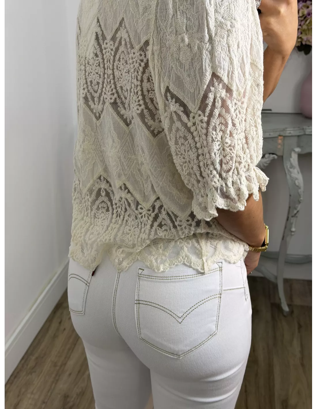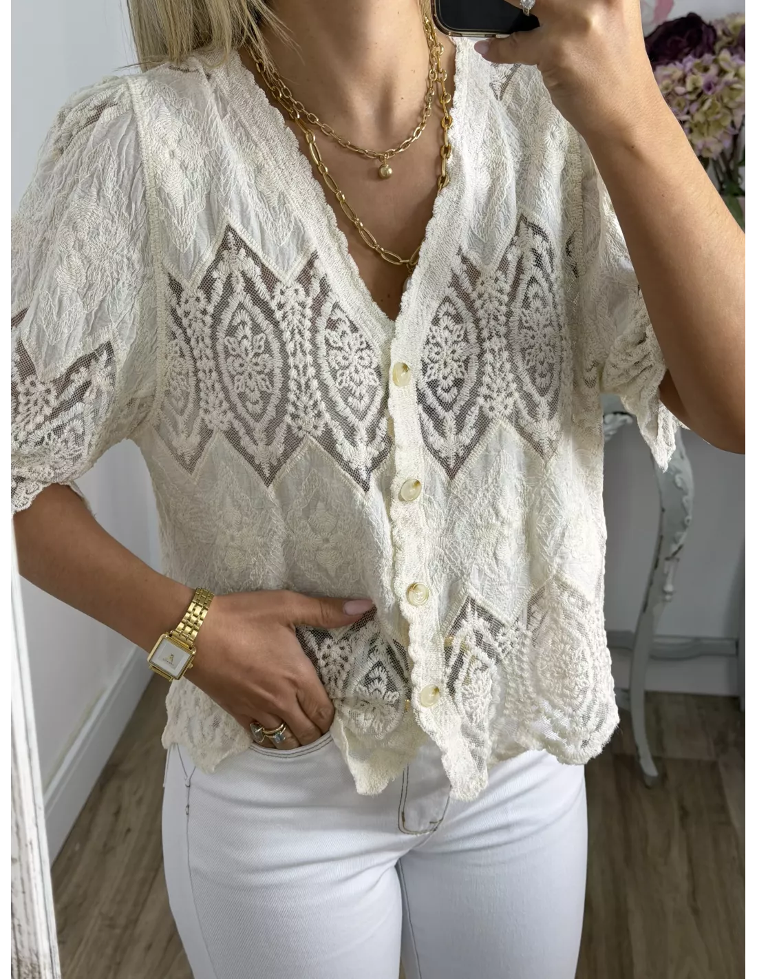 Chaqueta encaje beige abotonada