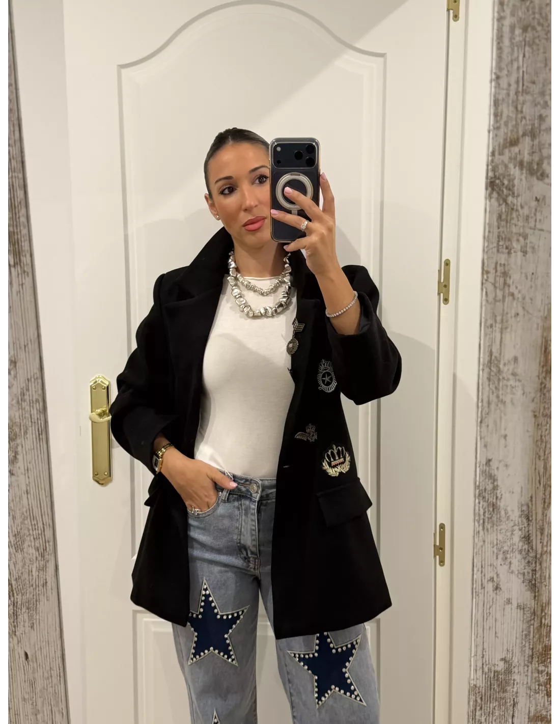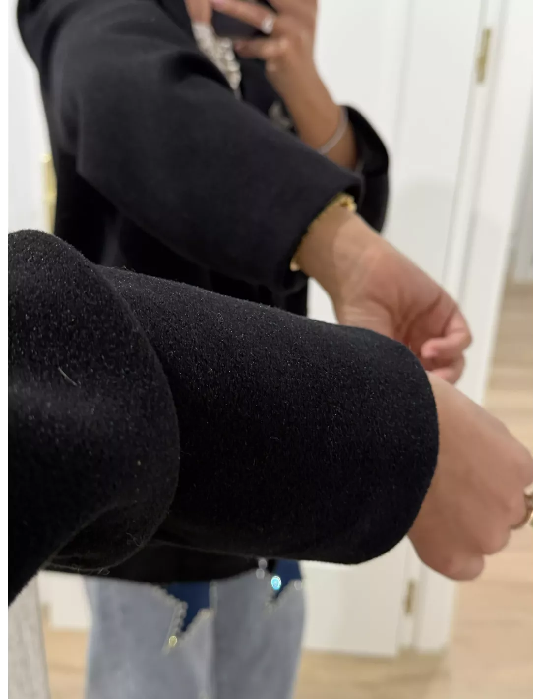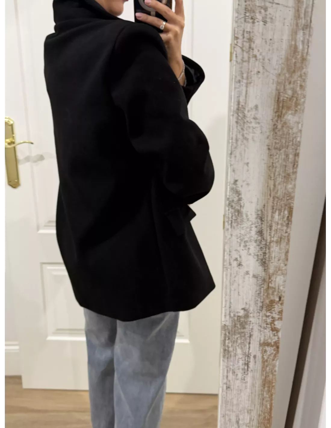 Chaqueta de corte oversize, que va forrada y tiene hombreras. Se cierra en un único botón. El tejido es tipo paño.