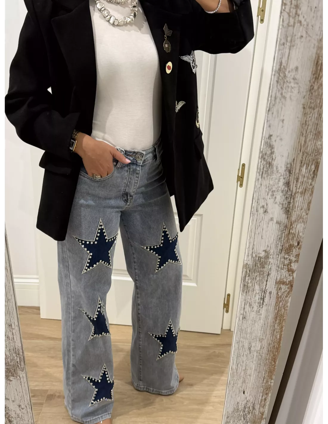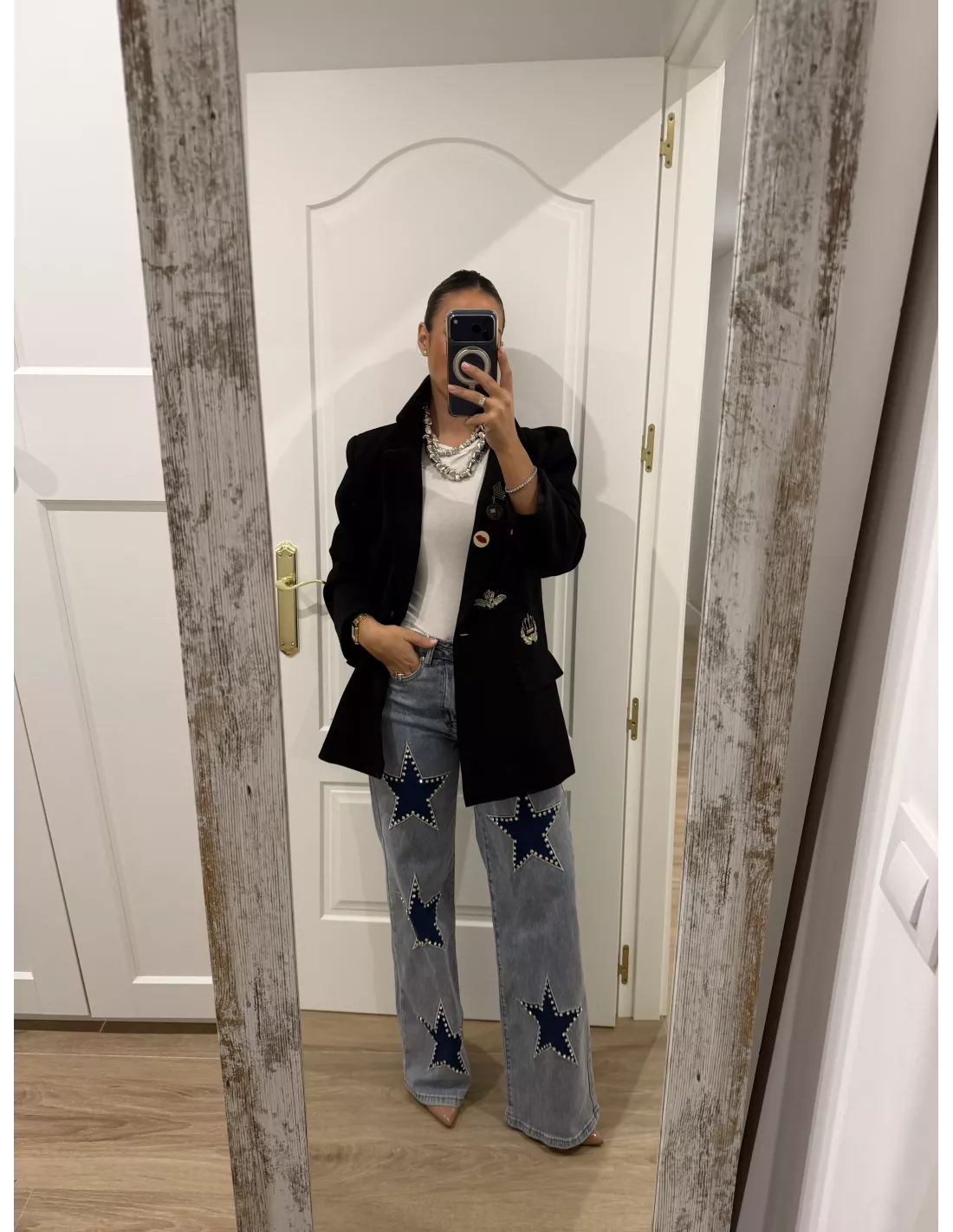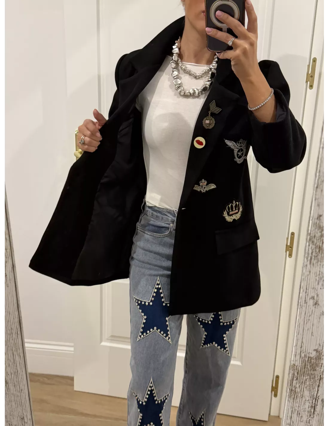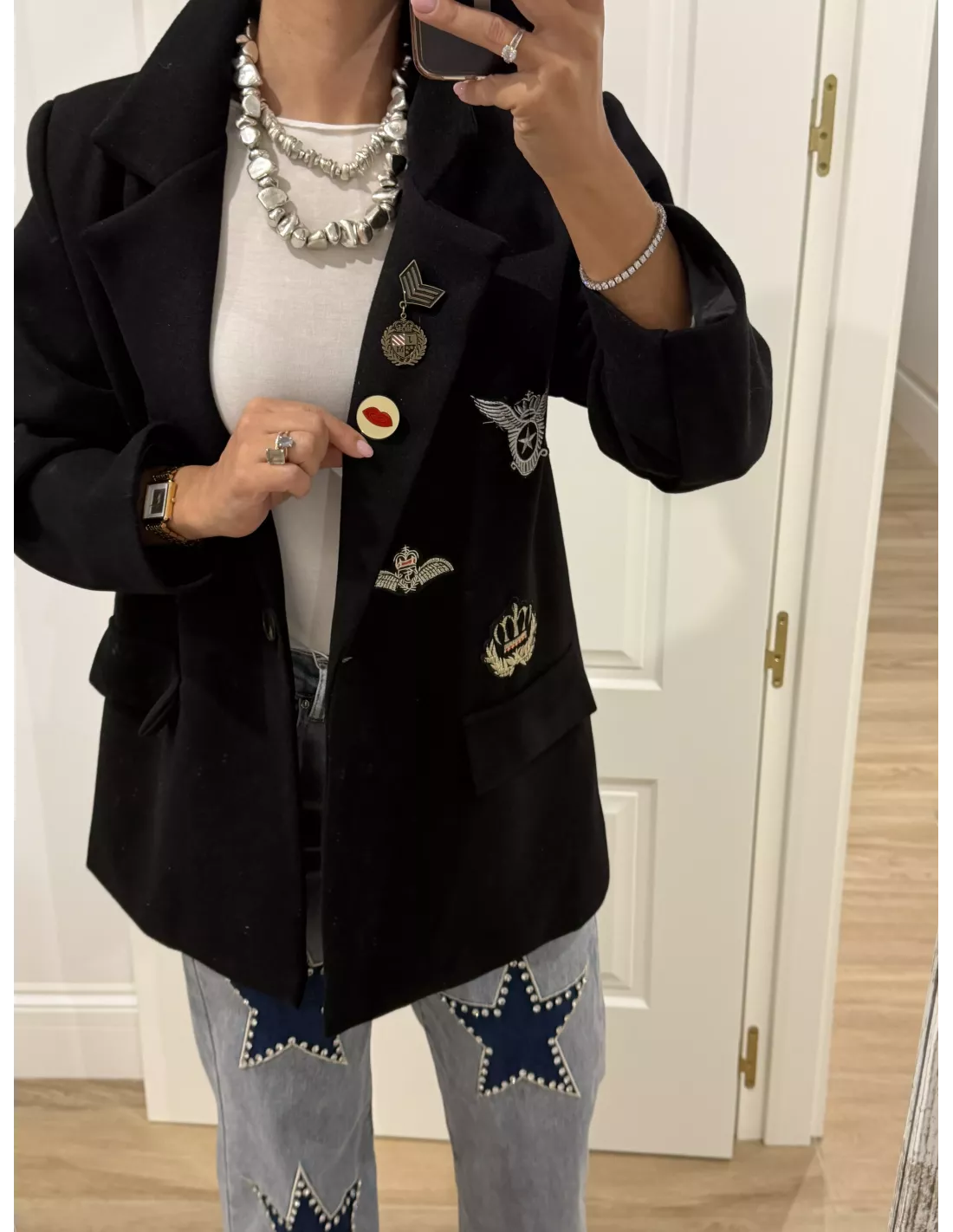 Chaqueta de corte oversize, que va forrada y tiene hombreras. Se cierra en un único botón. El tejido es tipo paño.