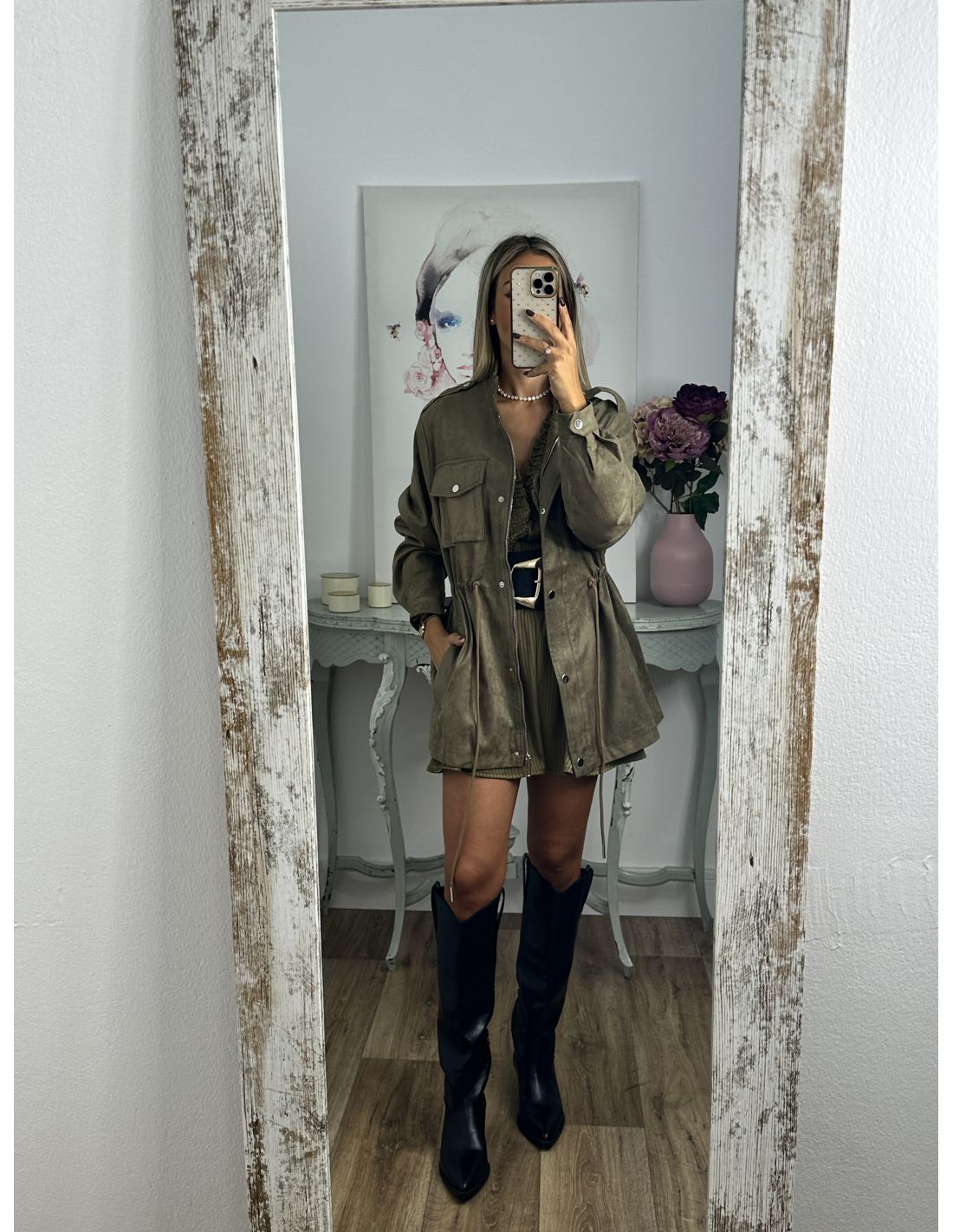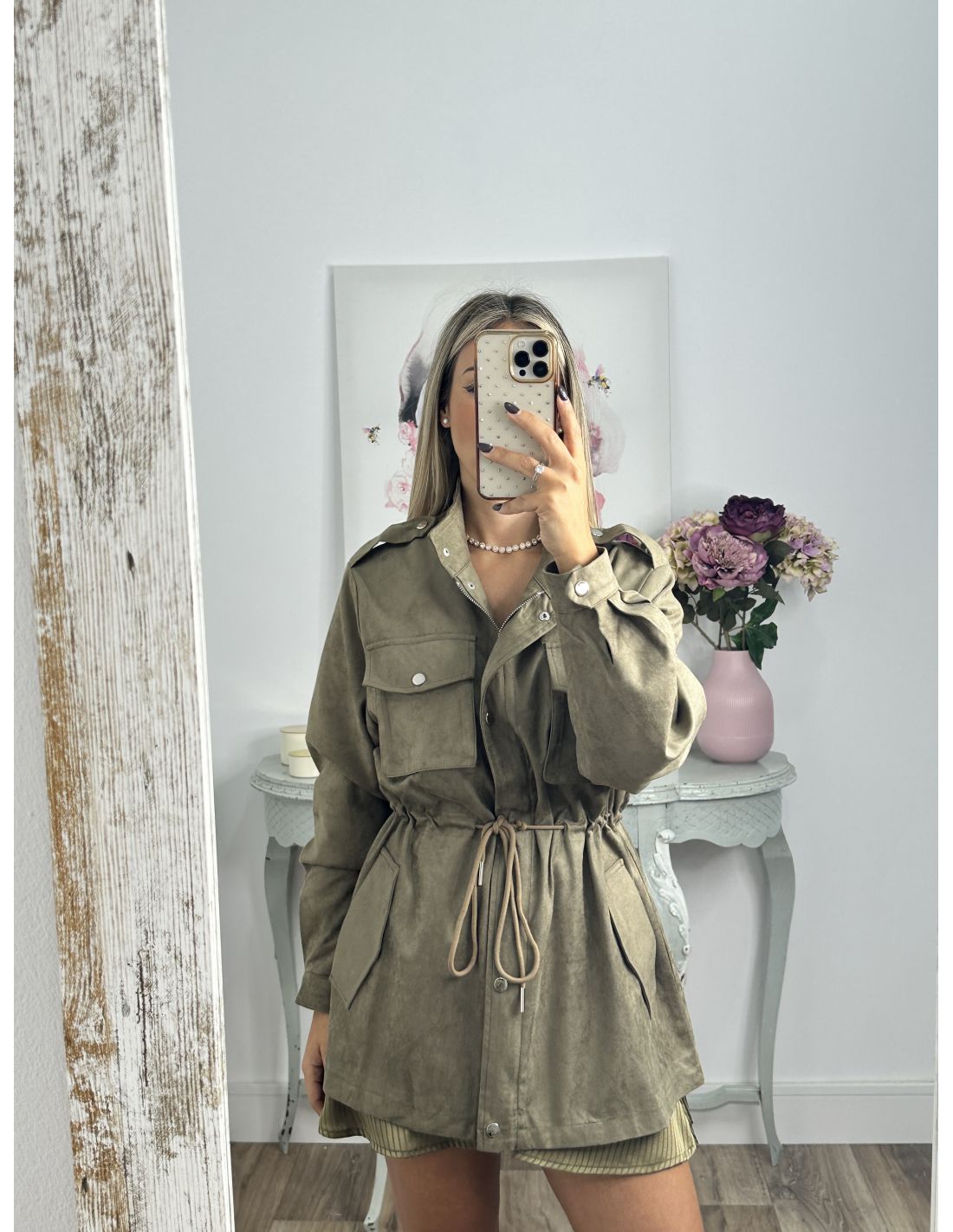 Chaqueta tipo Parka de corte recto que se ajusta en la zona de la cintura con un cordón. Se cierra con cremallera y botones de clips en plateados. Va forrada.