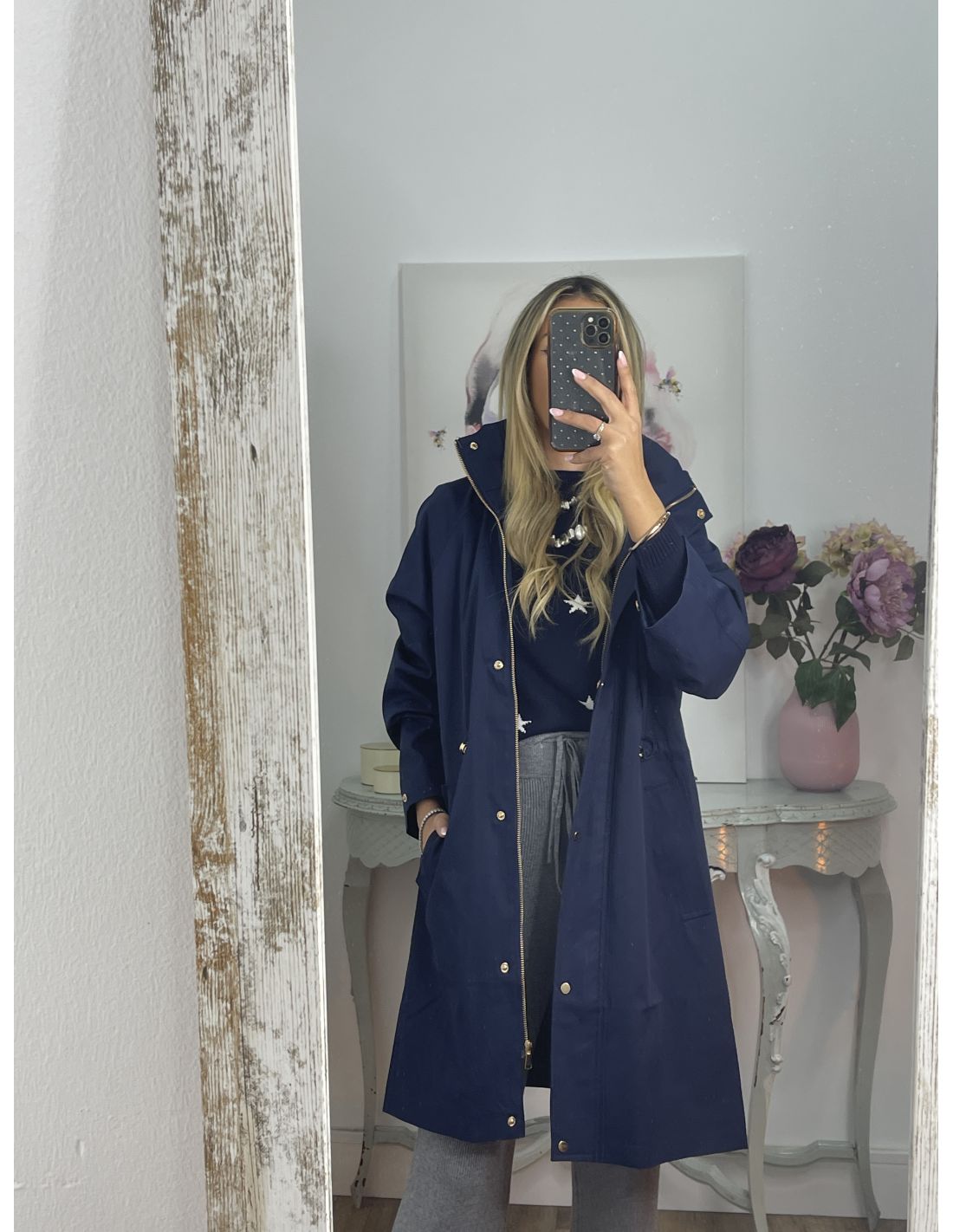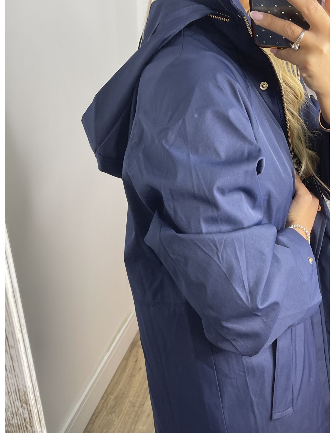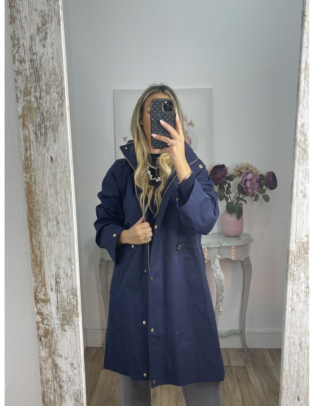 Chaqueta tipo Parka de corte, recto que lleva capucha que se puede guardar en la zona del cuello. Se ajusta en la cintura. El corte es amplio.