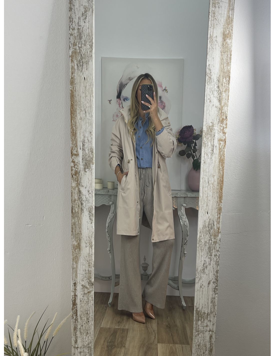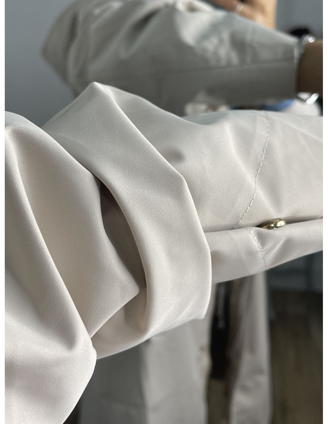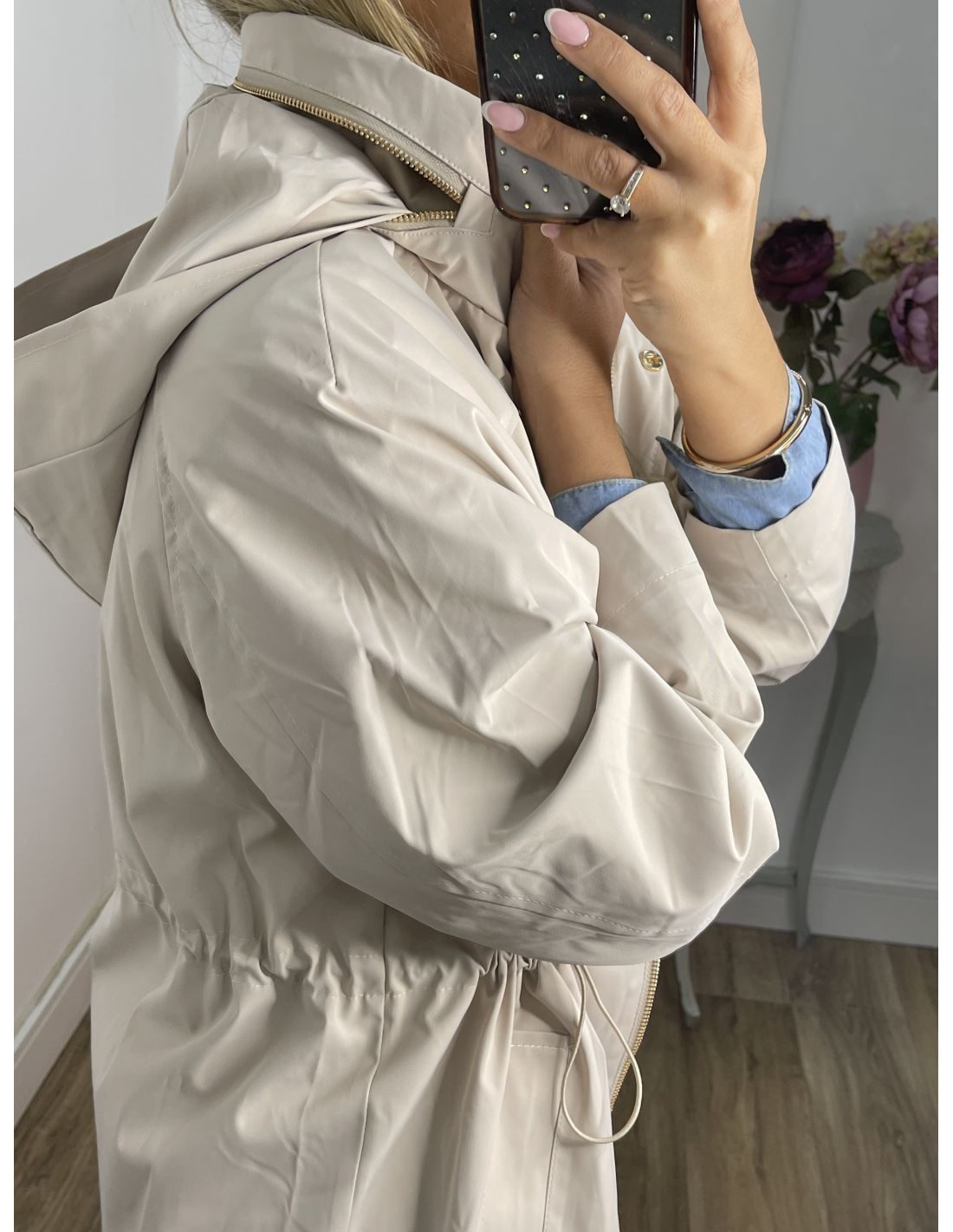 Chaqueta tipo Parka de corte, recto que lleva capucha que se puede guardar en la zona del cuello. Se ajusta en la cintura. El corte es amplio.