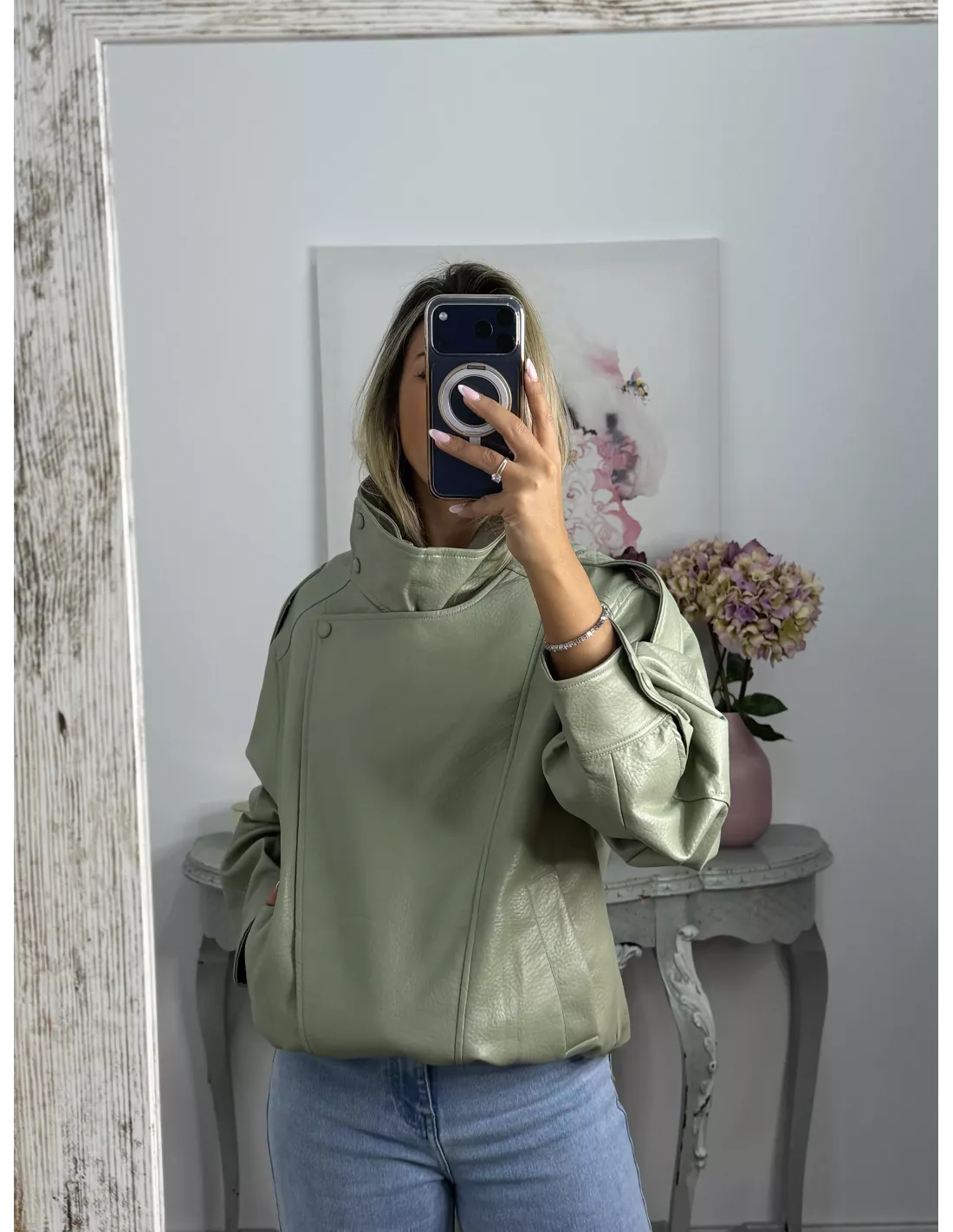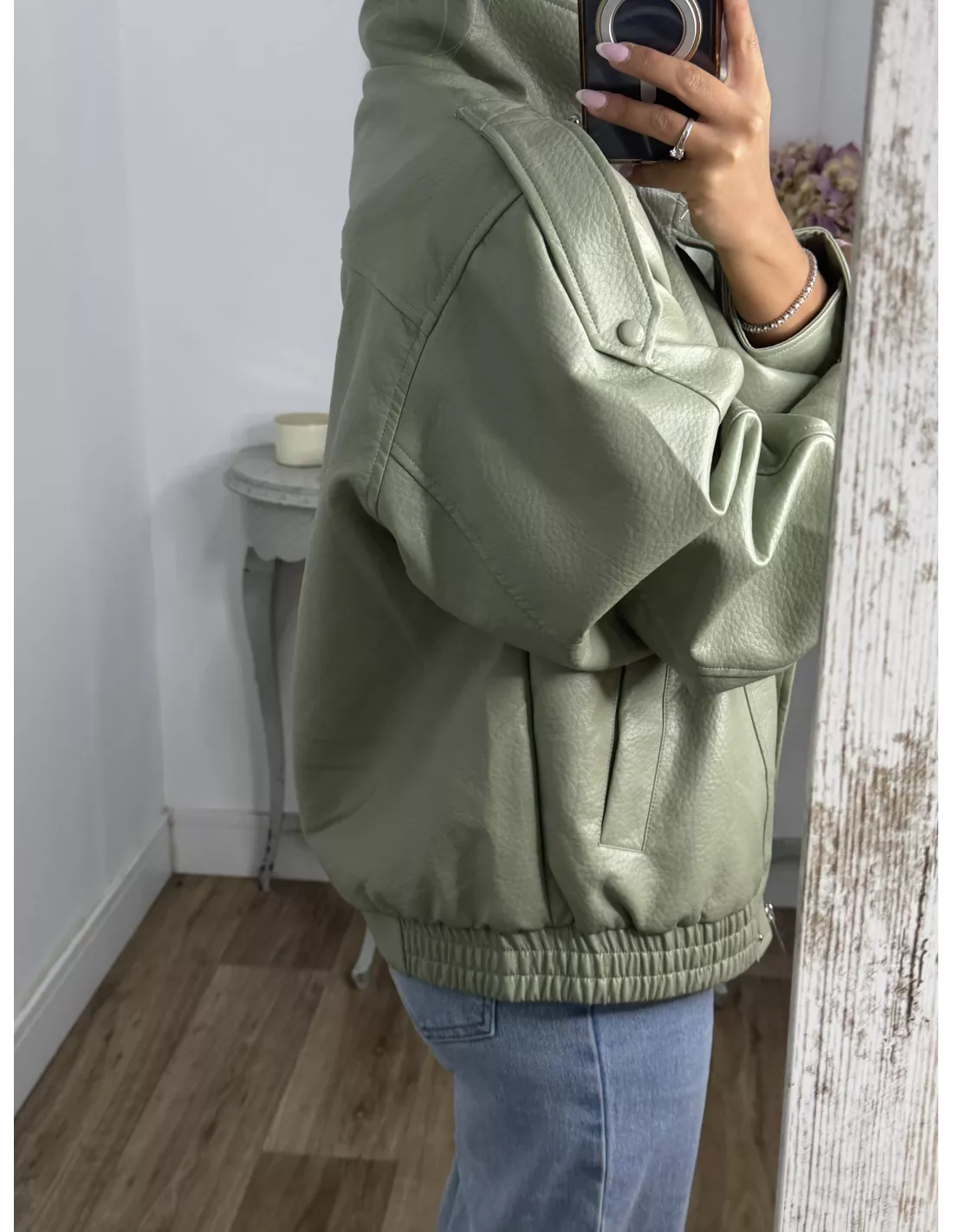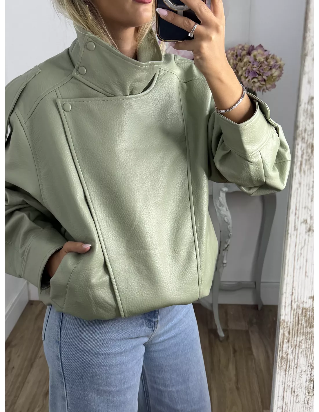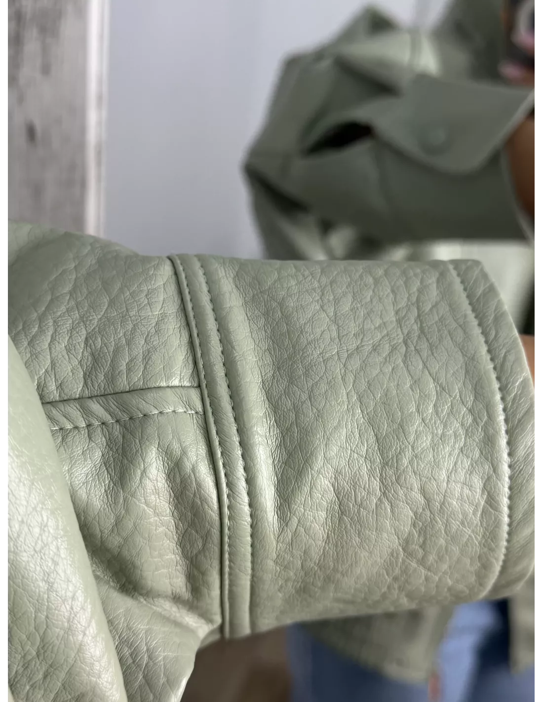 Chaqueta de polipiel, de cuello chimenea, corte oversize. Va forrada, las cremalleras son en plateada.