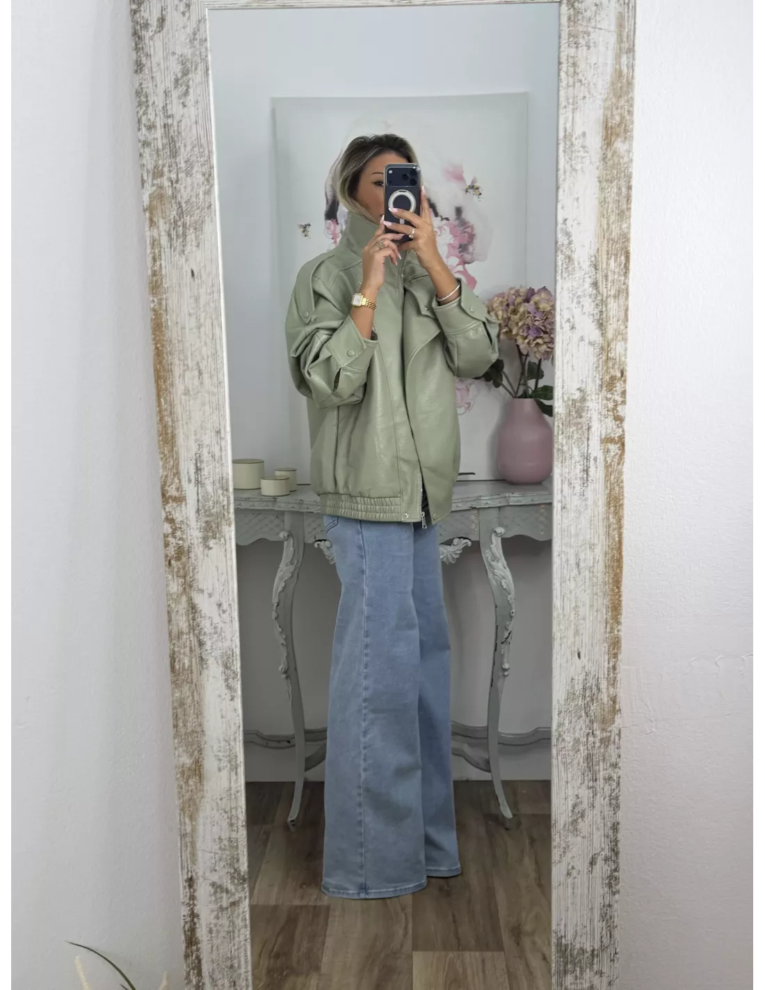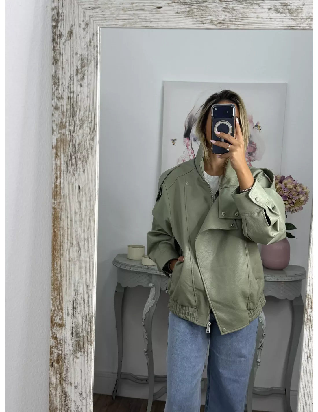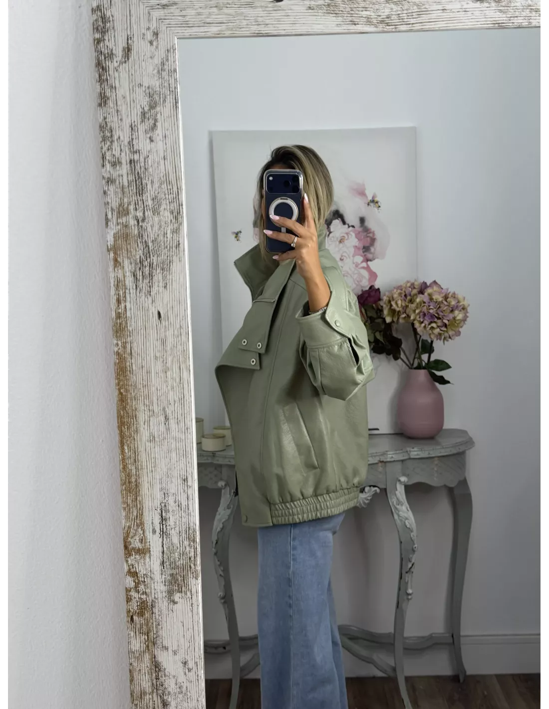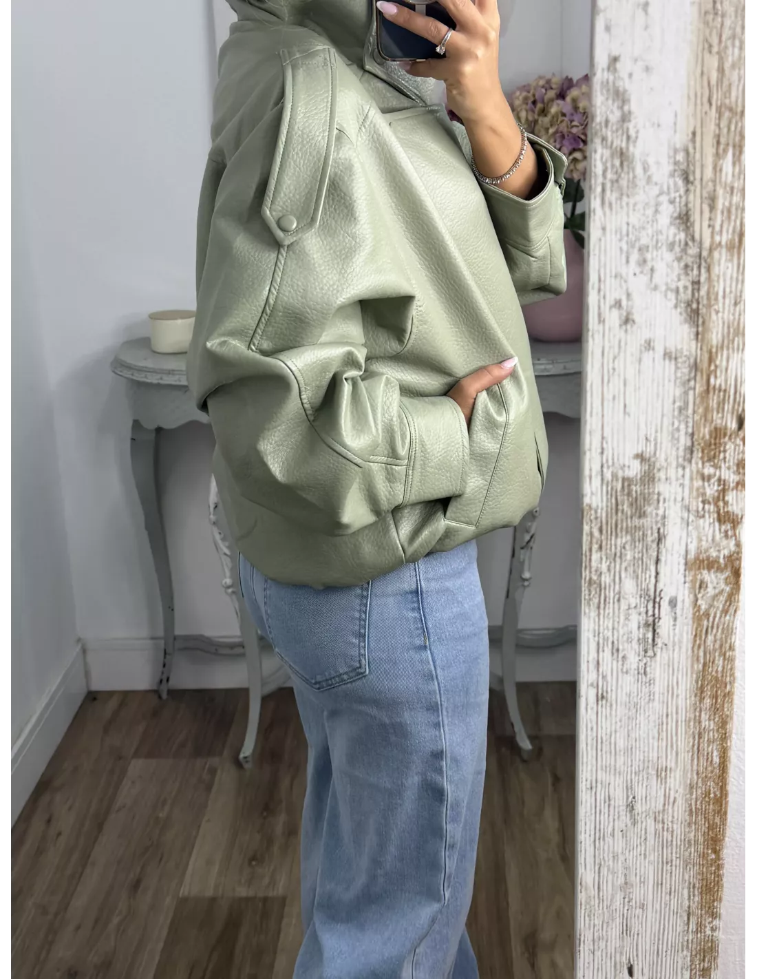 Chaqueta de polipiel, de cuello chimenea, corte oversize. Va forrada, las cremalleras son en plateada.