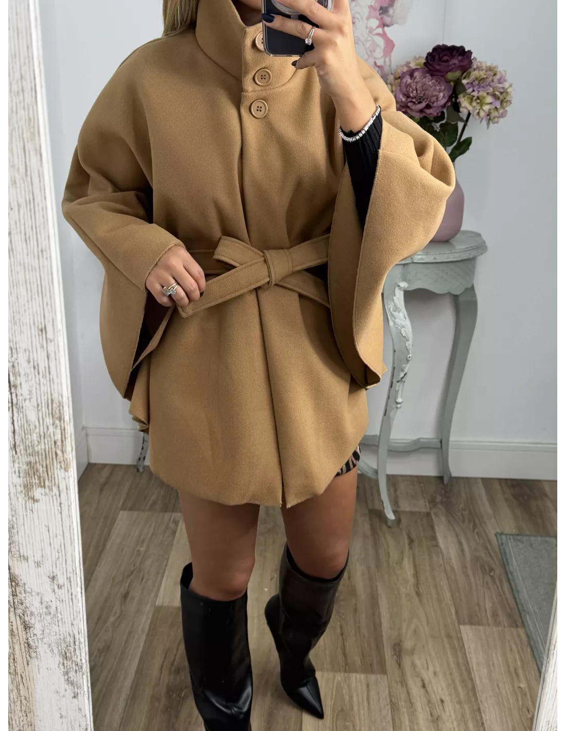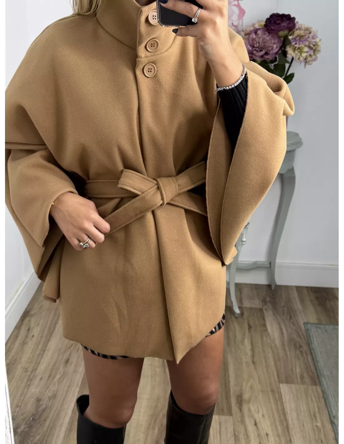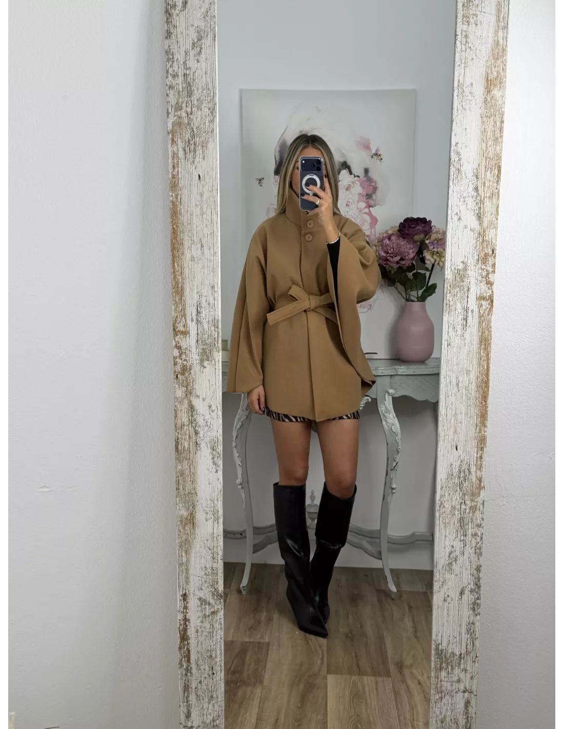 Capa de tejido tipo paño, con cuello chimenea que se cierra con tres botones. Trae cinturón del mismo tejido. No va forrada.