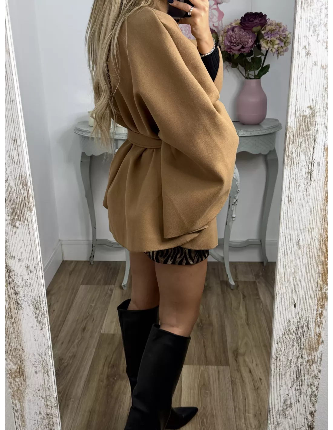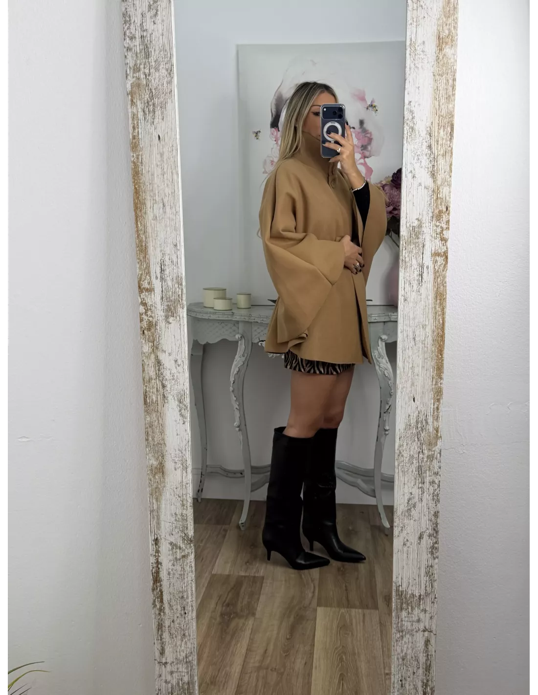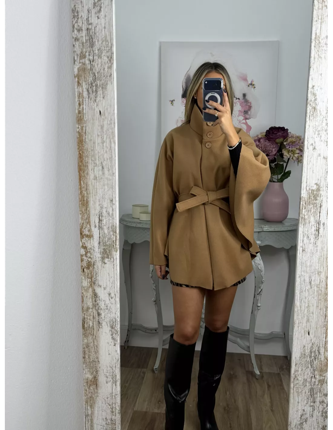 Capa de tejido tipo paño, con cuello chimenea que se cierra con tres botones. Trae cinturón del mismo tejido. No va forrada.
