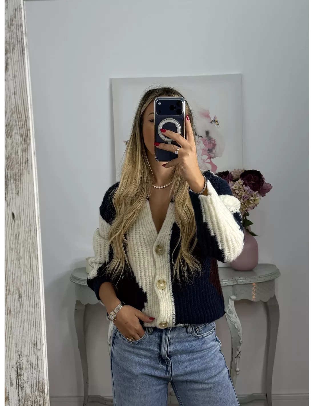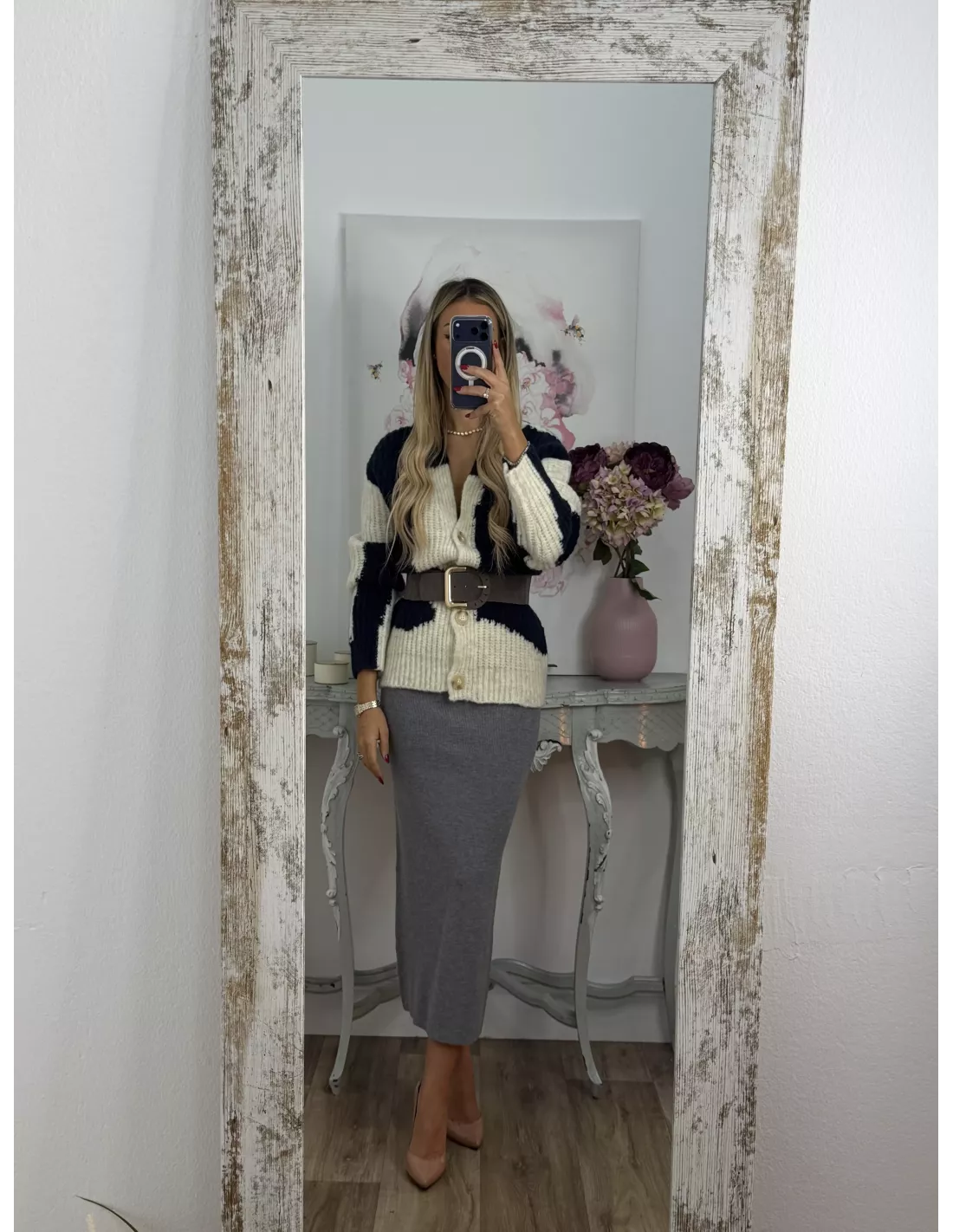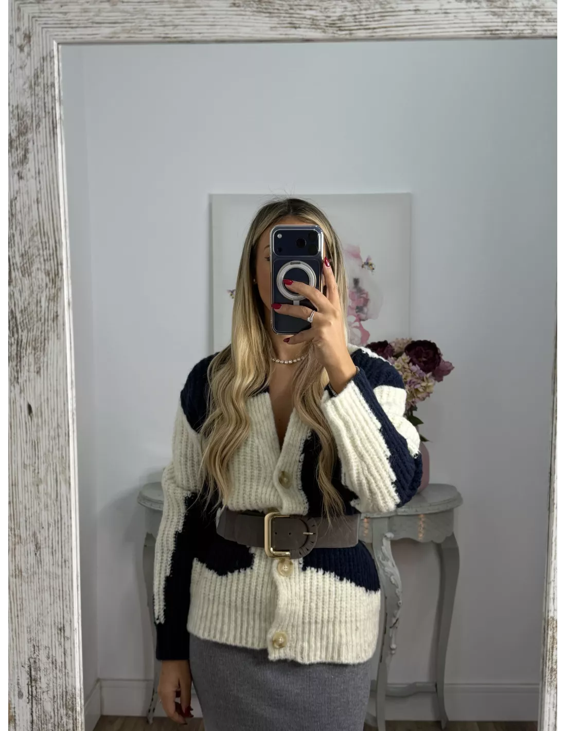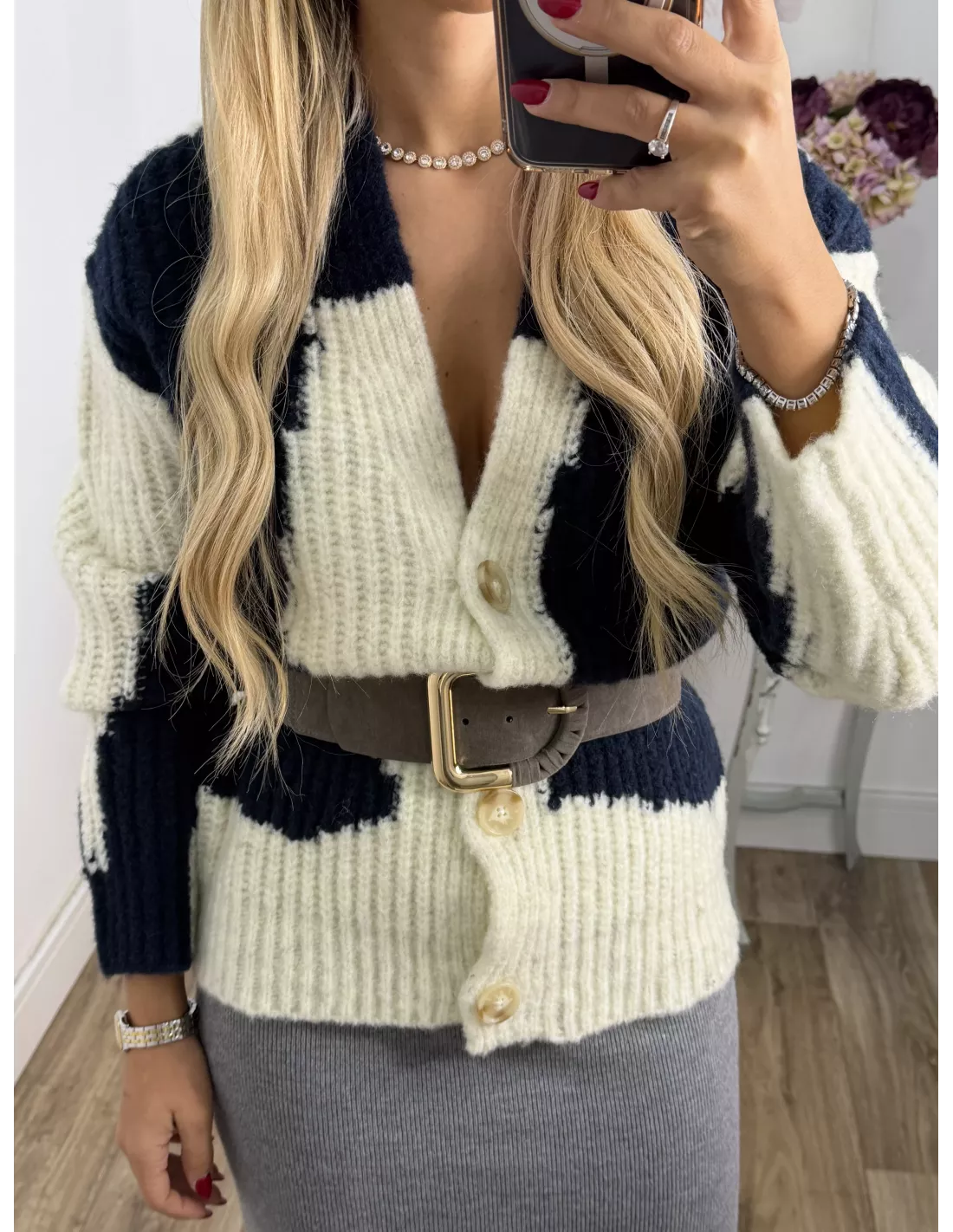 Cárdigan de punto grueso de tacto suave y que no pica nada es abotonado y se pueden abrir los botones. El corte recto. No incluye el cinturón.