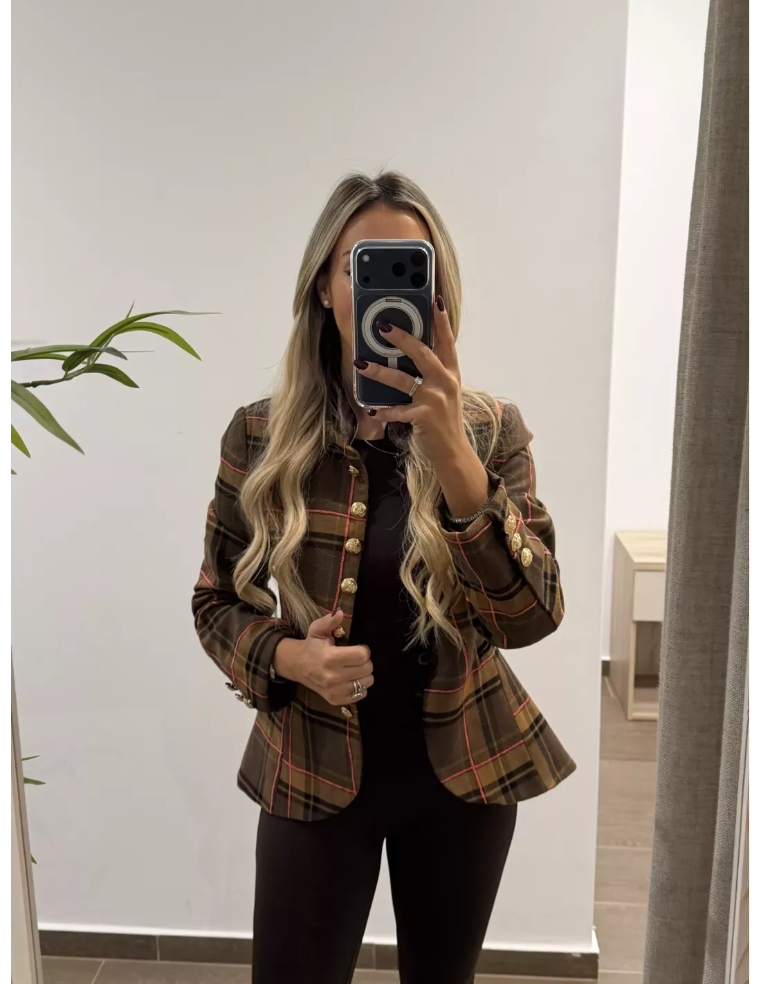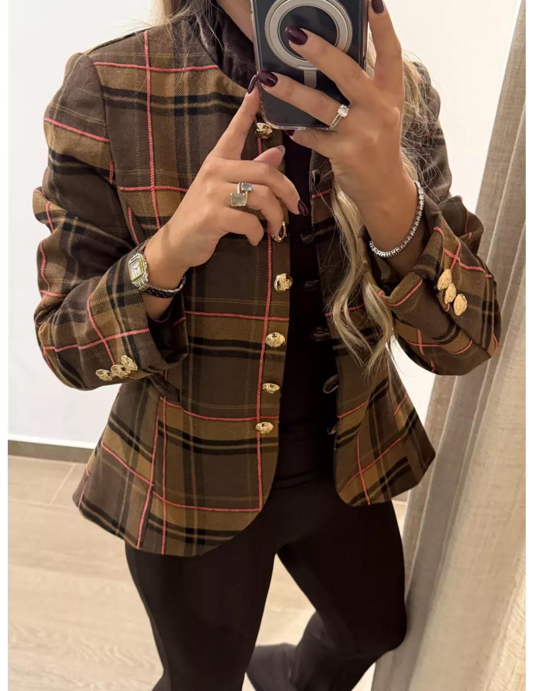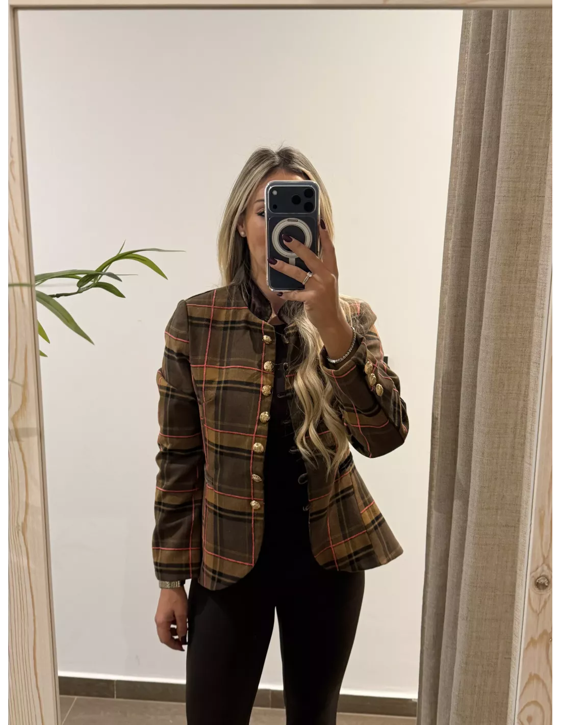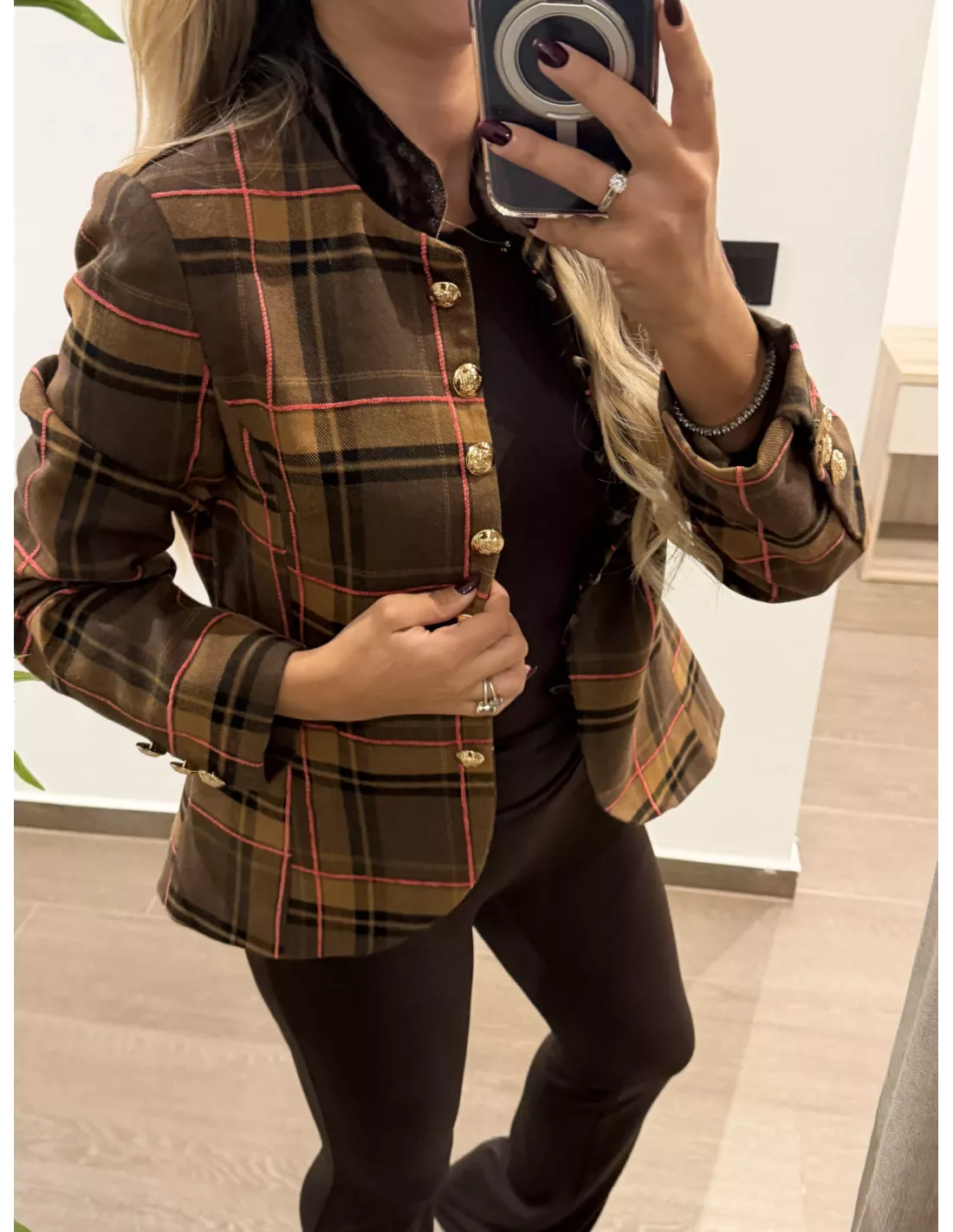 Chaqueta de cuadros con cuello de tirilla que va de terciopelo. Los botones que lleva son dorados. El cuadro lleva un relieve aterciopelado. Va forrada y tiene hombreras.