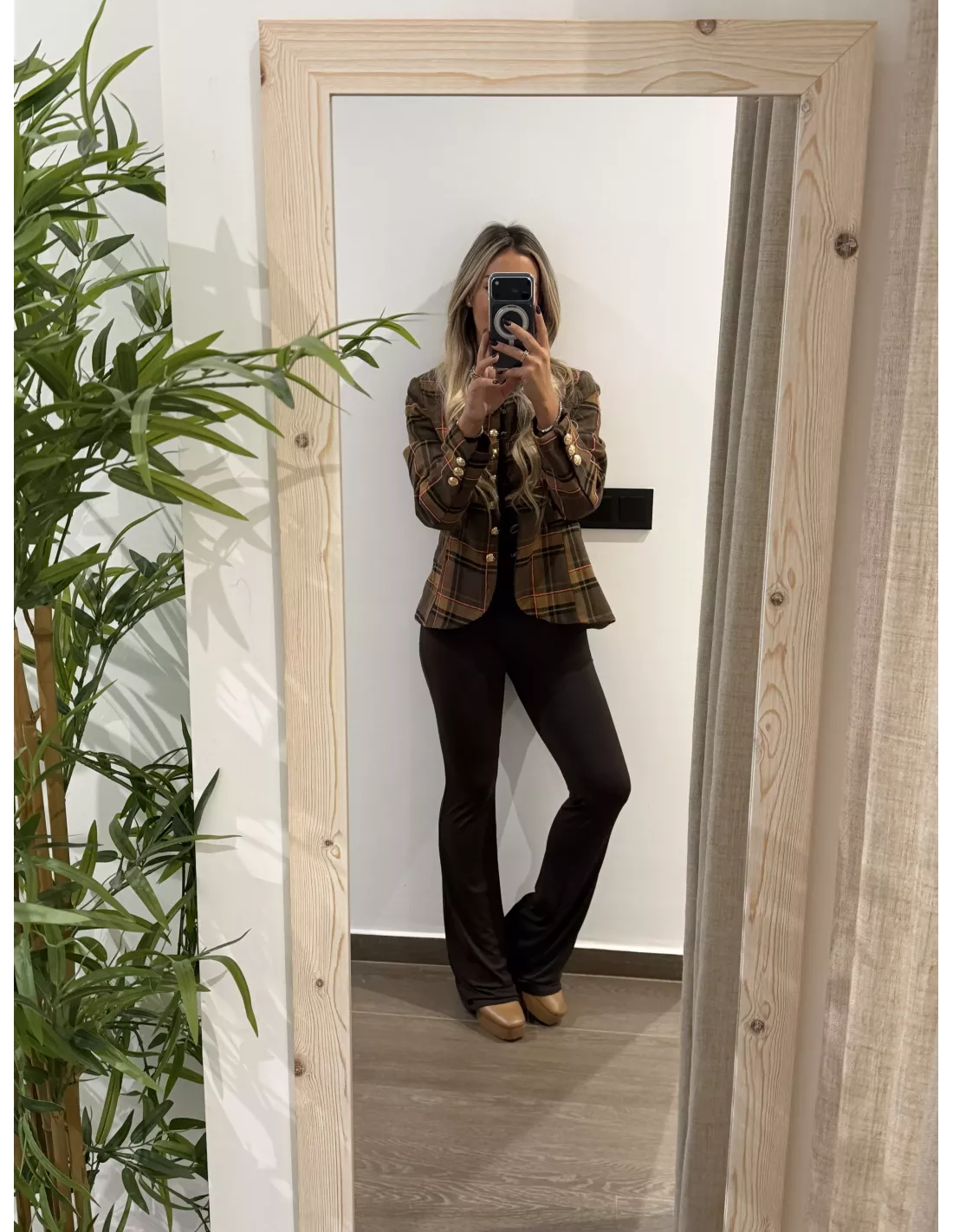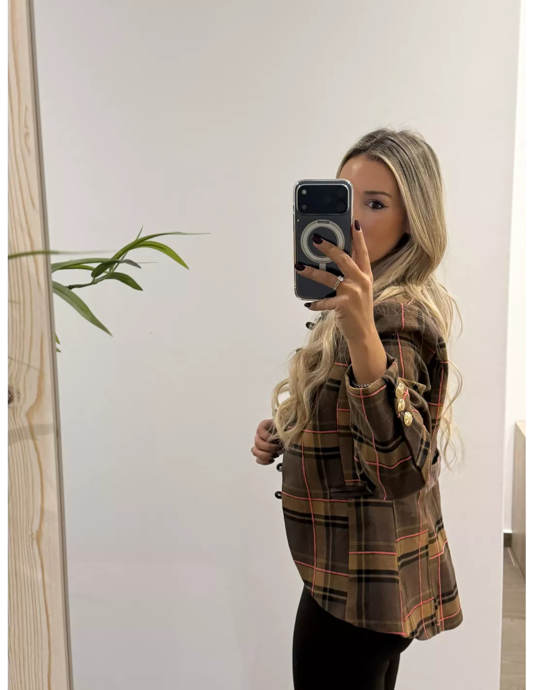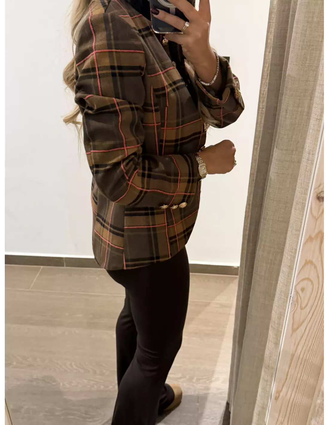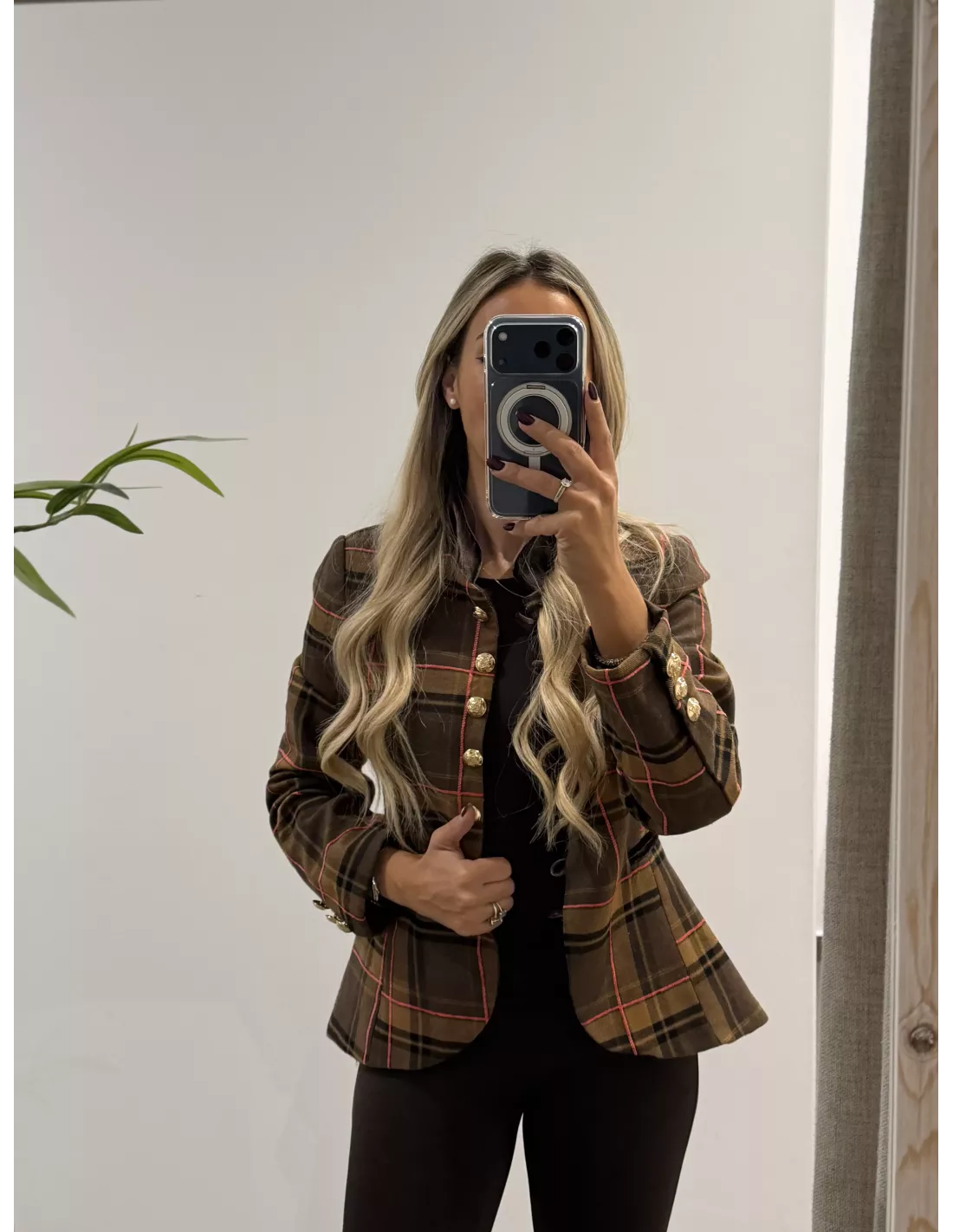 Chaqueta de cuadros con cuello de tirilla que va de terciopelo. Los botones que lleva son dorados. El cuadro lleva un relieve aterciopelado. Va forrada y tiene hombreras.