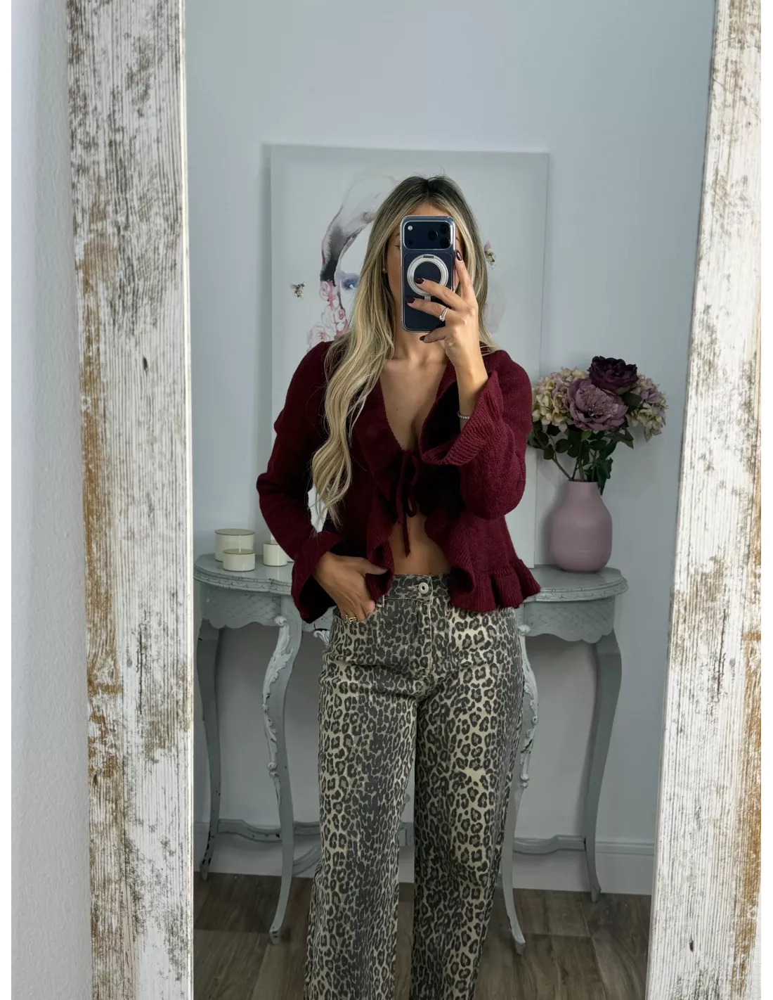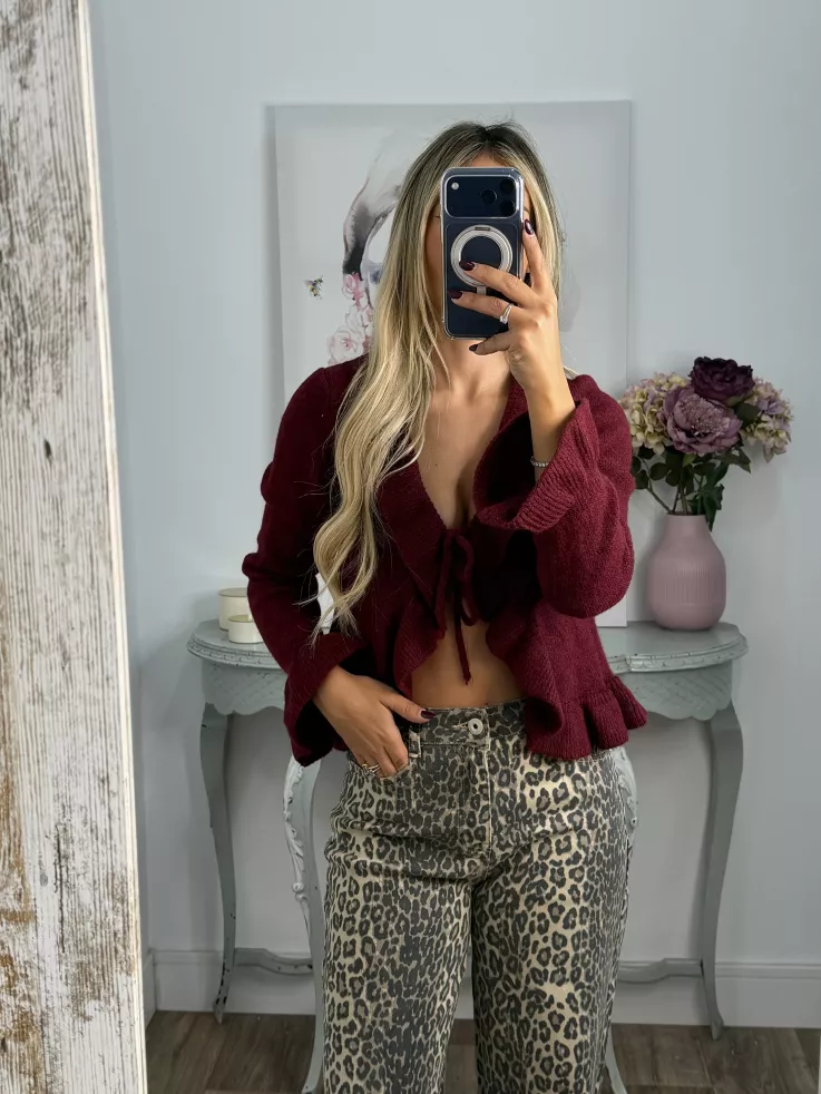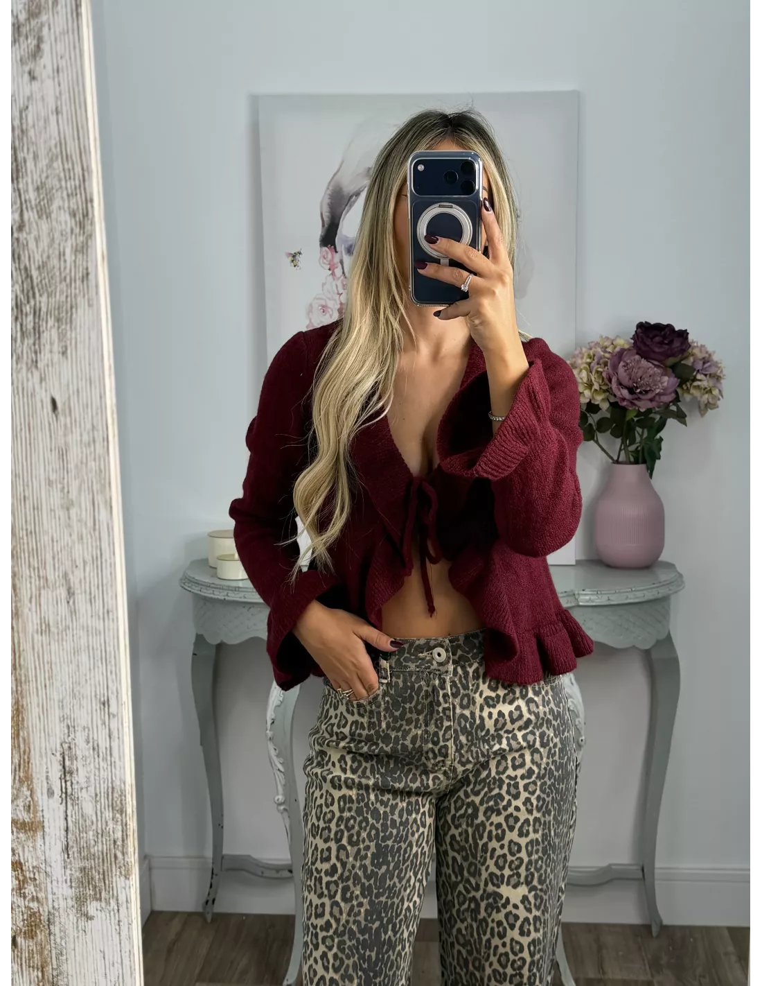 Rebeca, que se anuda en la parte delantera con una lazada y lleva todo alrededor del escote y de la parte de abajo, un volante al igual que en el puño. No pica nada.