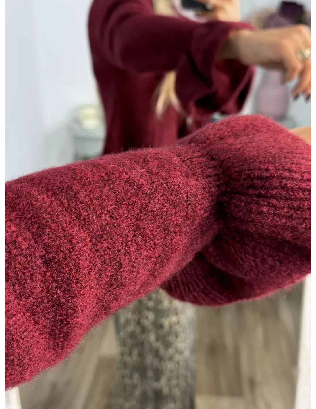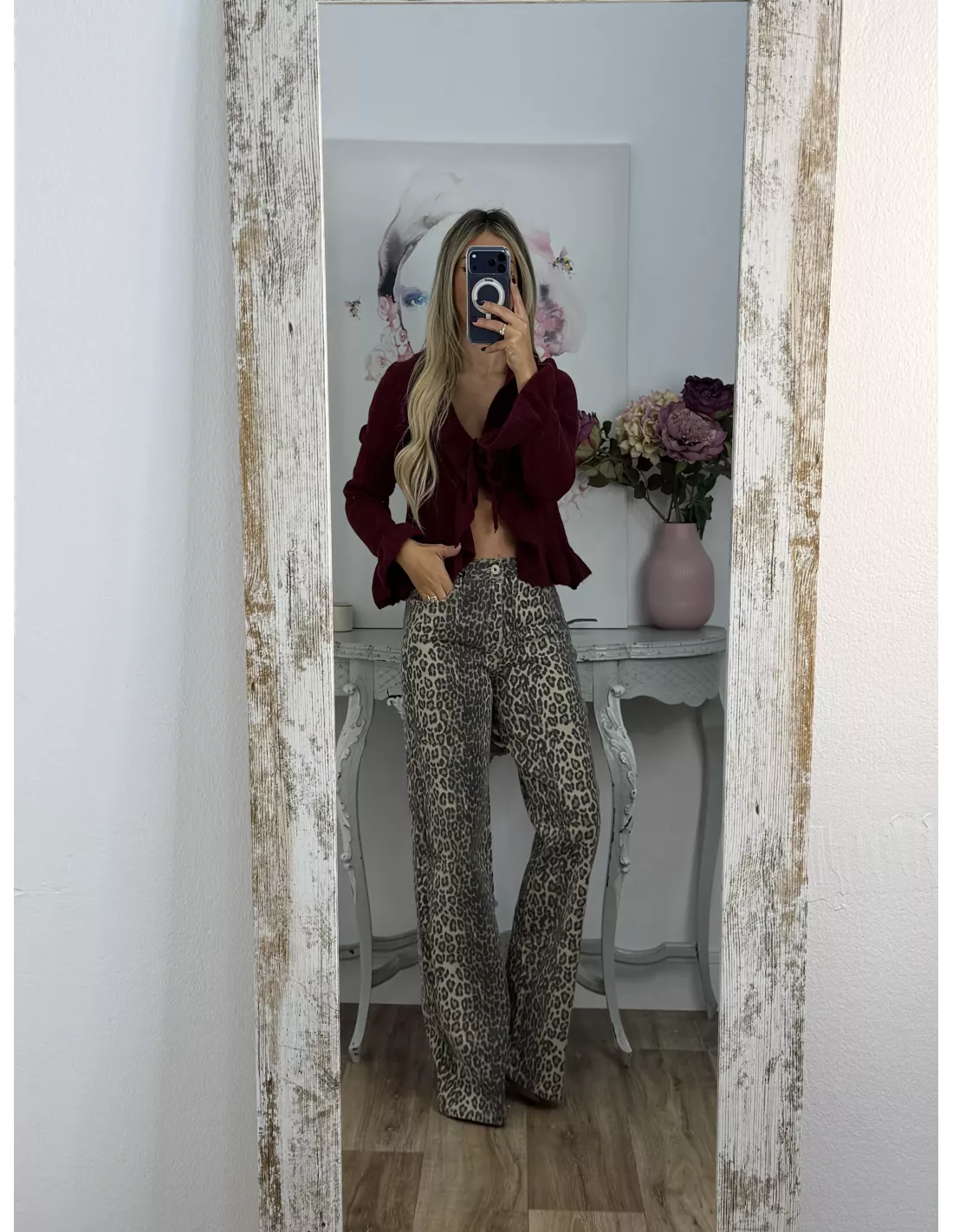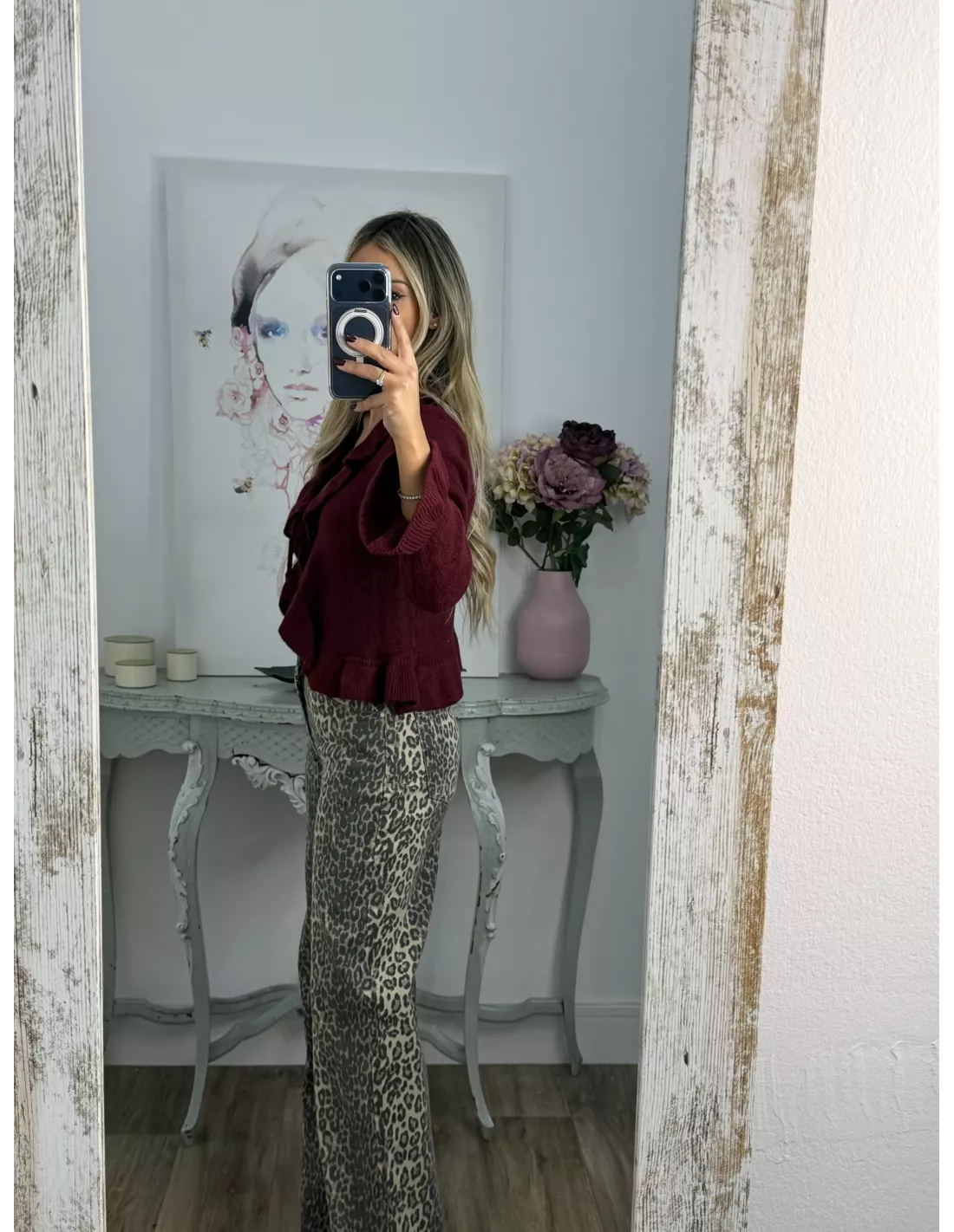 Rebeca, que se anuda en la parte delantera con una lazada y lleva todo alrededor del escote y de la parte de abajo, un volante al igual que en el puño. No pica nada.