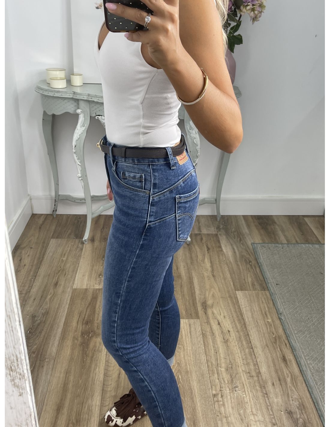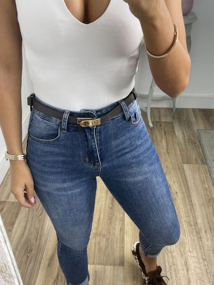 Cinturón de piel ajustable con hebilla dorada.