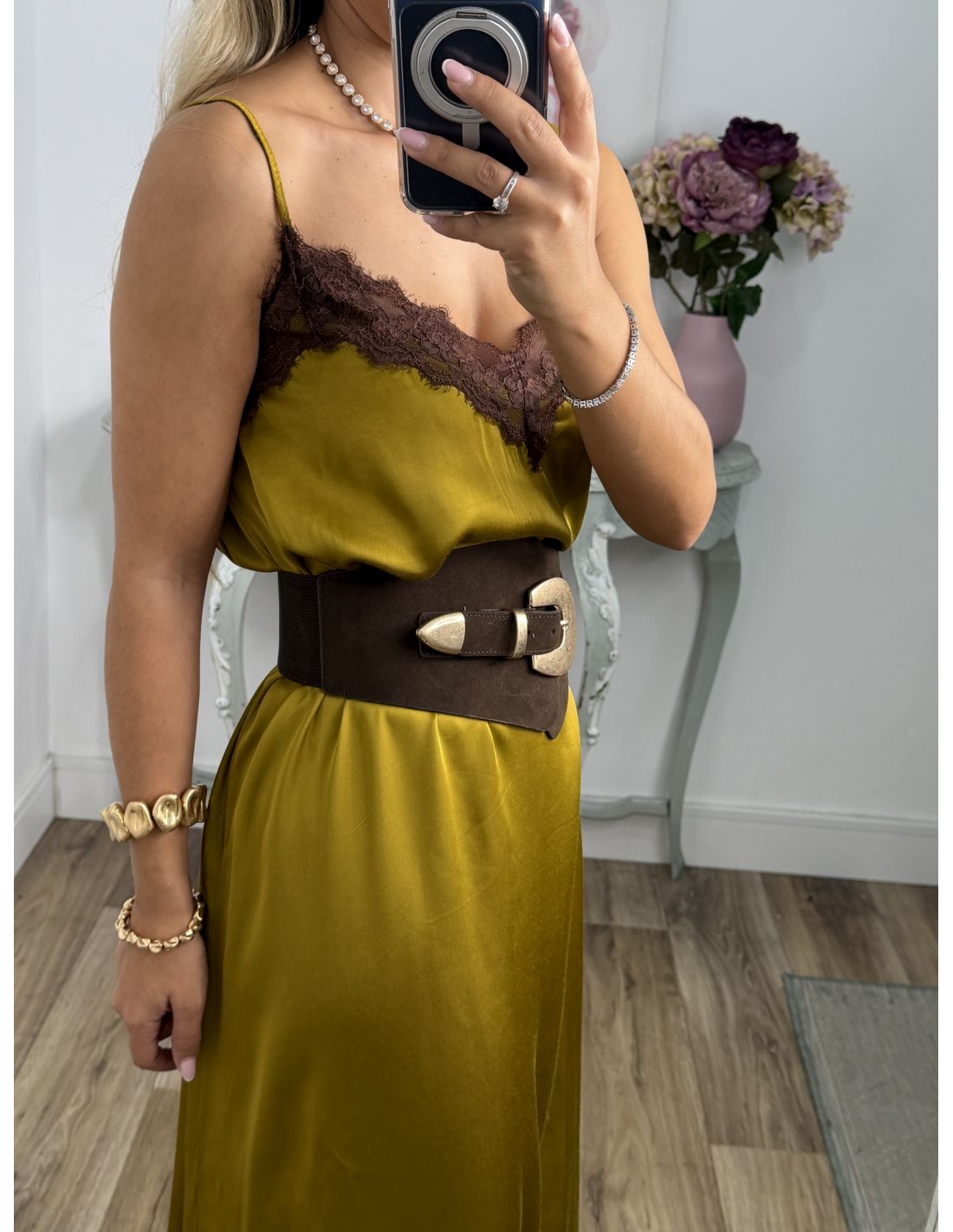 Cinturón ancho de tejido tipo ante, (no es de ante). La parte de atrás es elástica y se adapta muy bien.