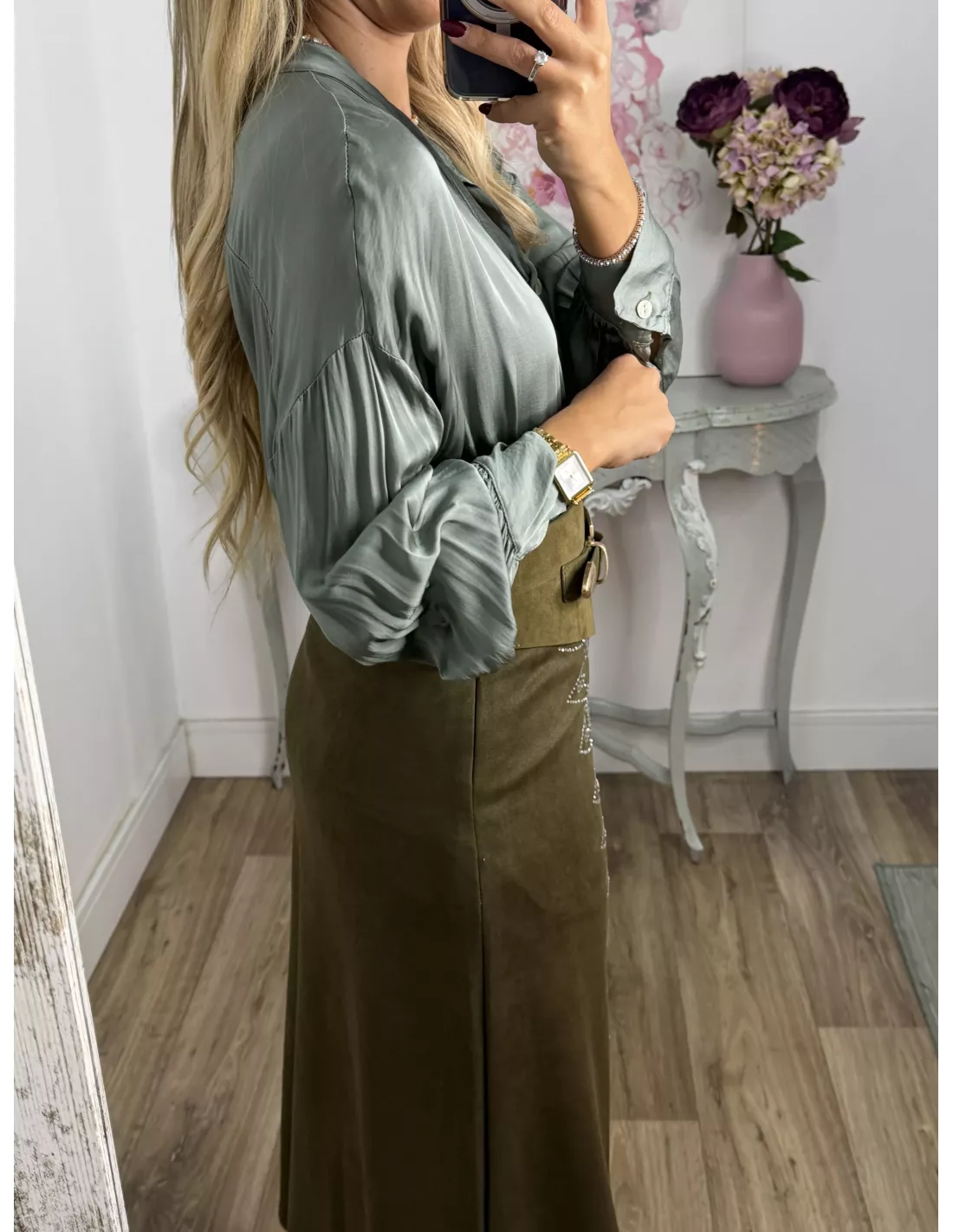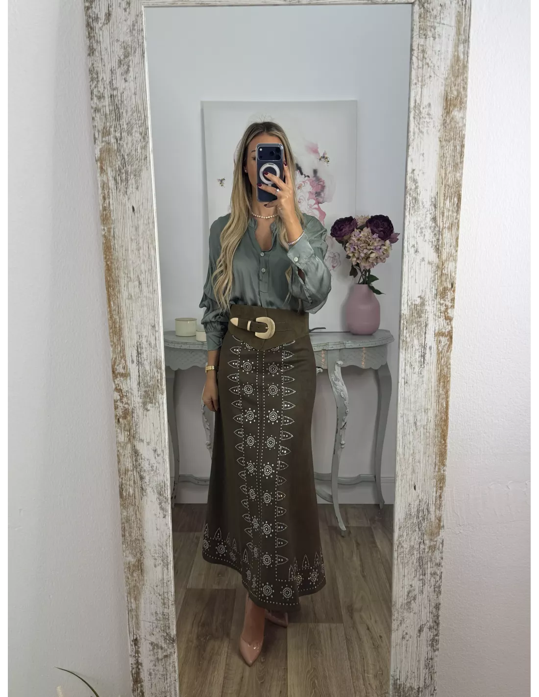 Cinturón ancho de tejido tipo ante, (no es de ante). La parte de atrás es elástica y se adapta muy bien.