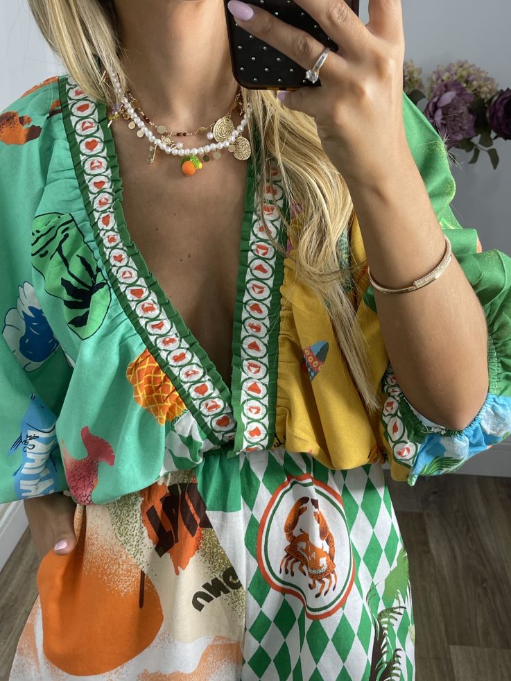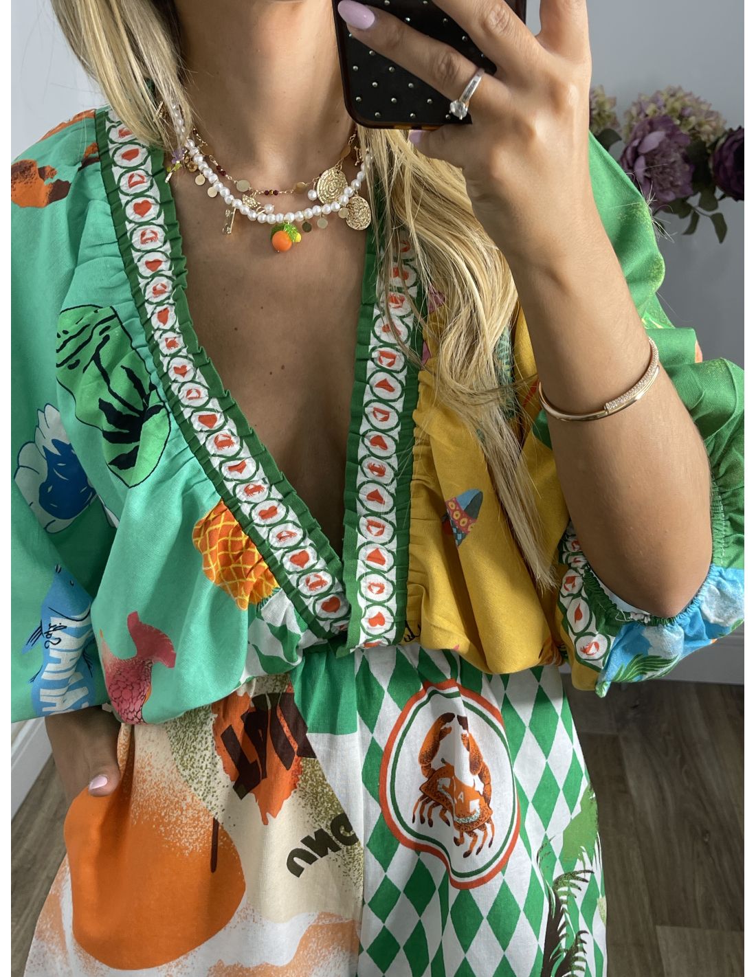 Conjunto de dos colgantes, uno de bolas y otro dorado con abalorios.