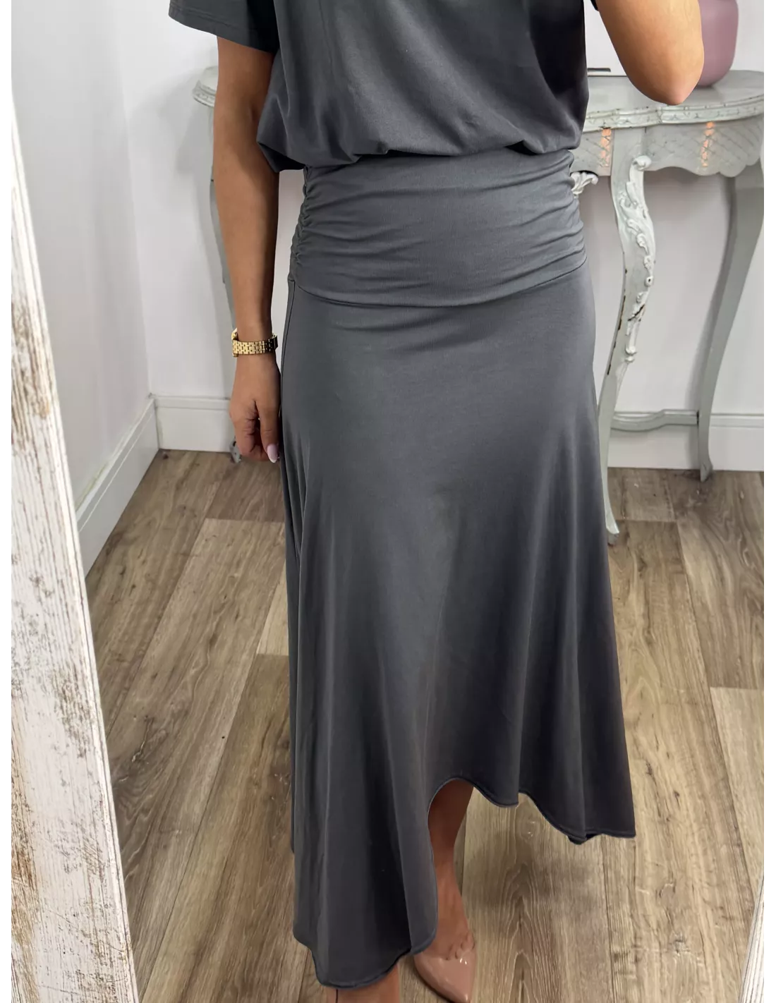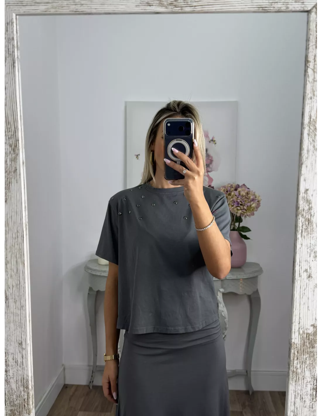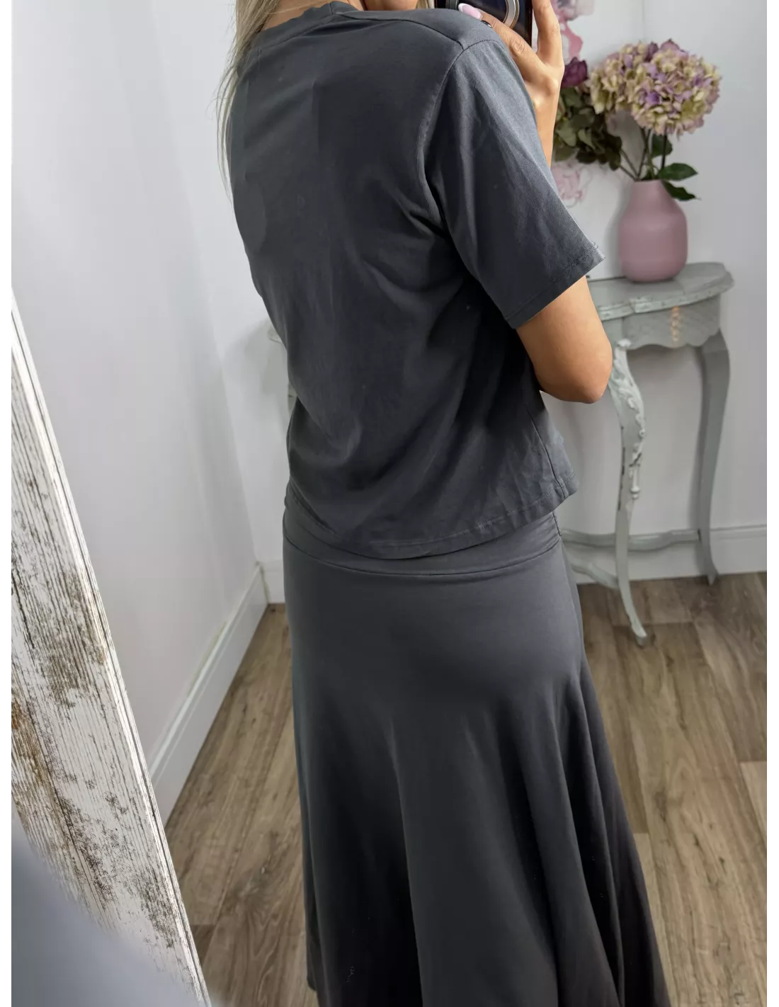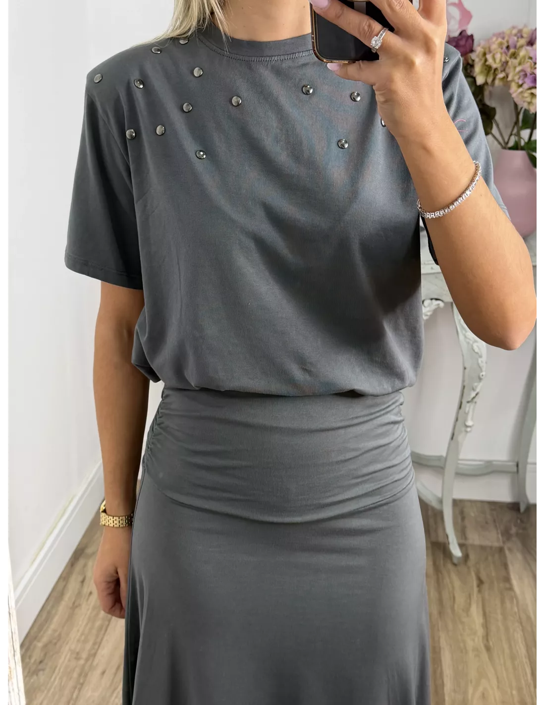 Conjunto de camiseta y falda. La camiseta es de cuello a la caja tiene tachuelas plateadas. La falda tiene una cintura ancha y el abajo es asimétrico.