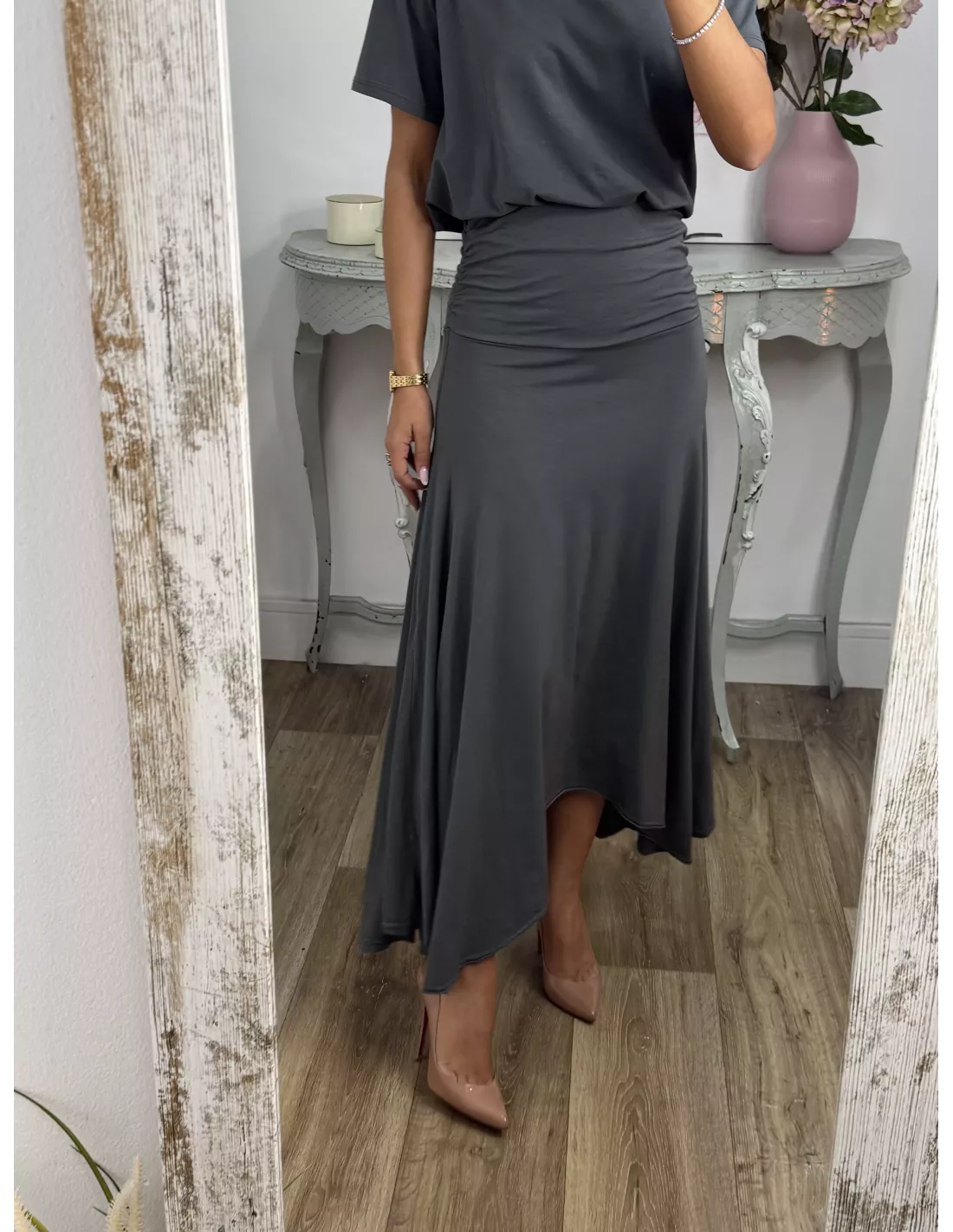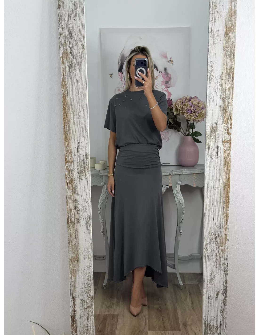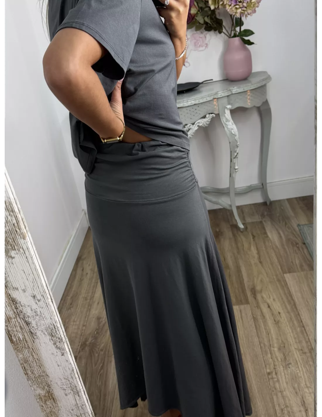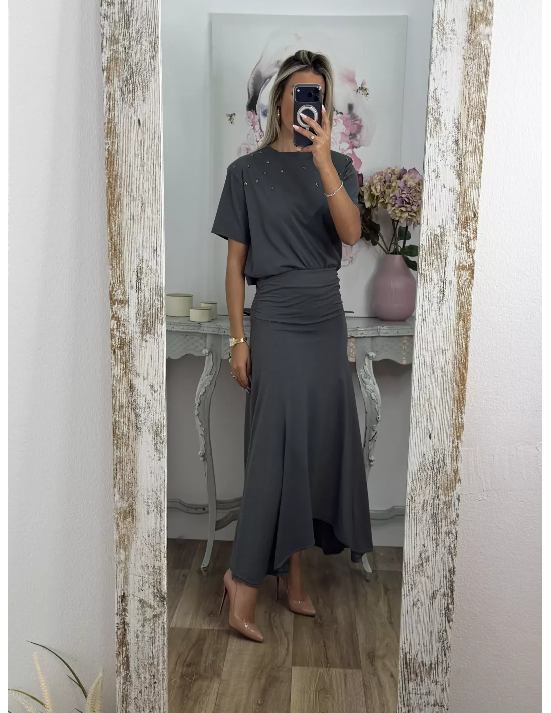 Conjunto de camiseta y falda. La camiseta es de cuello a la caja tiene tachuelas plateadas. La falda tiene una cintura ancha y el abajo es asimétrico.