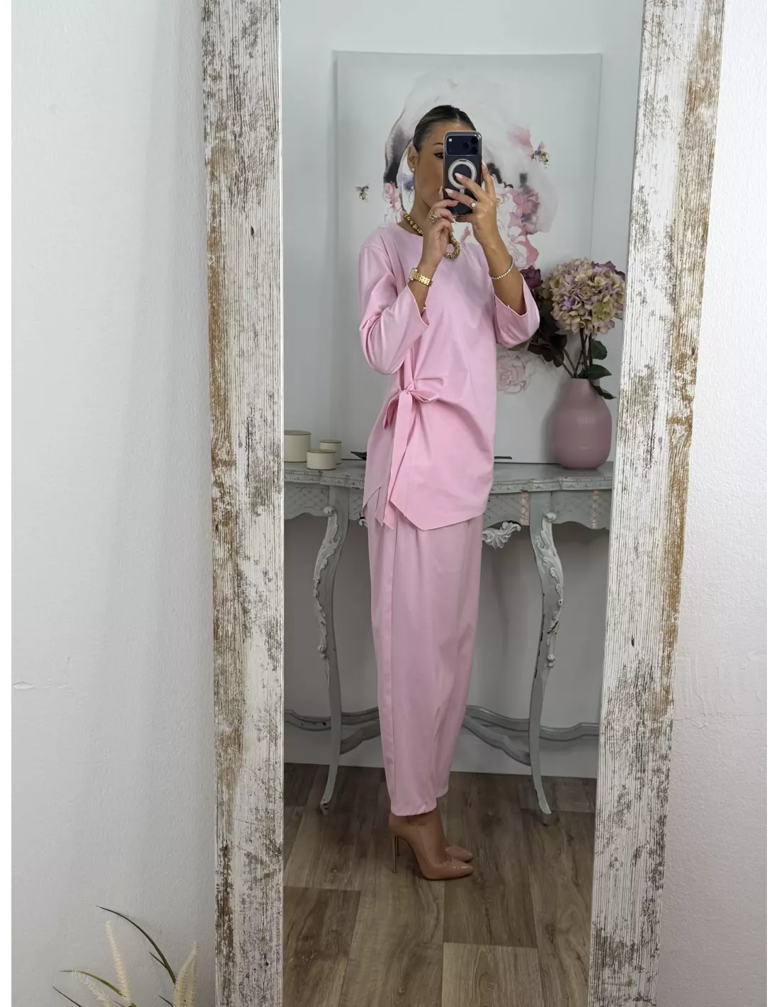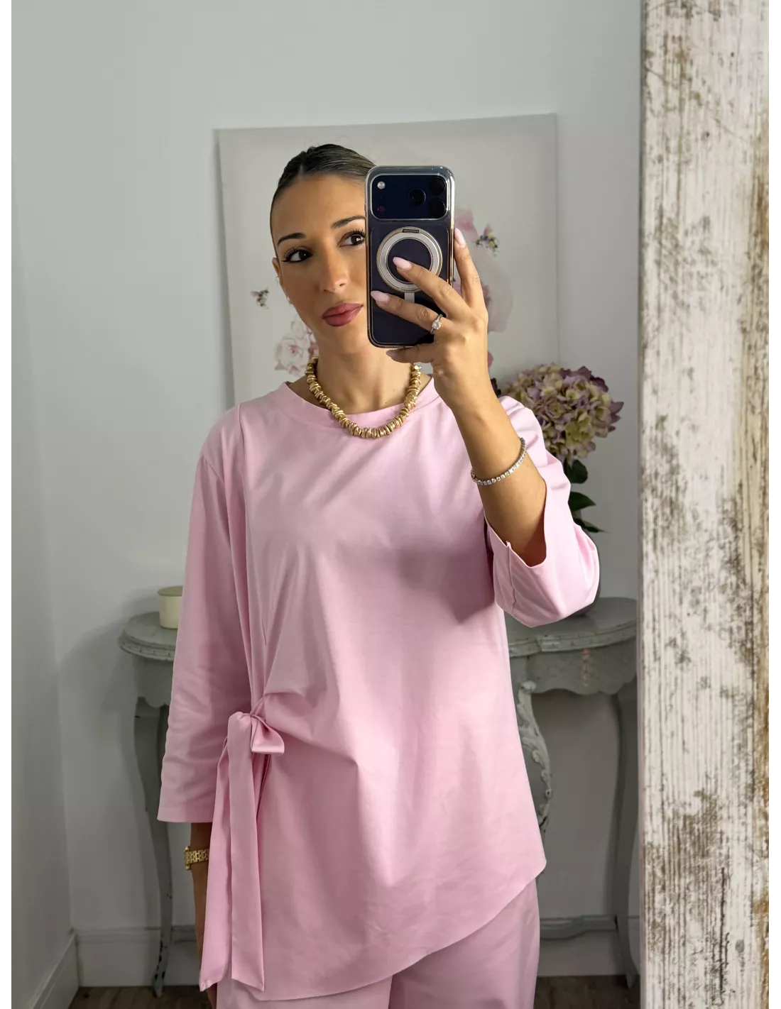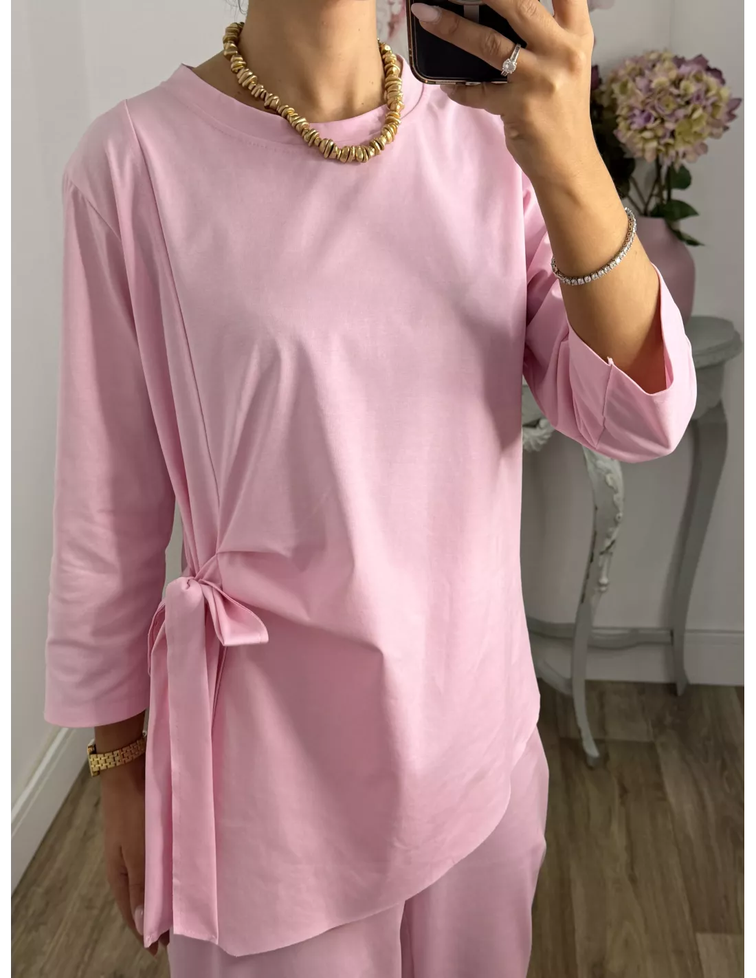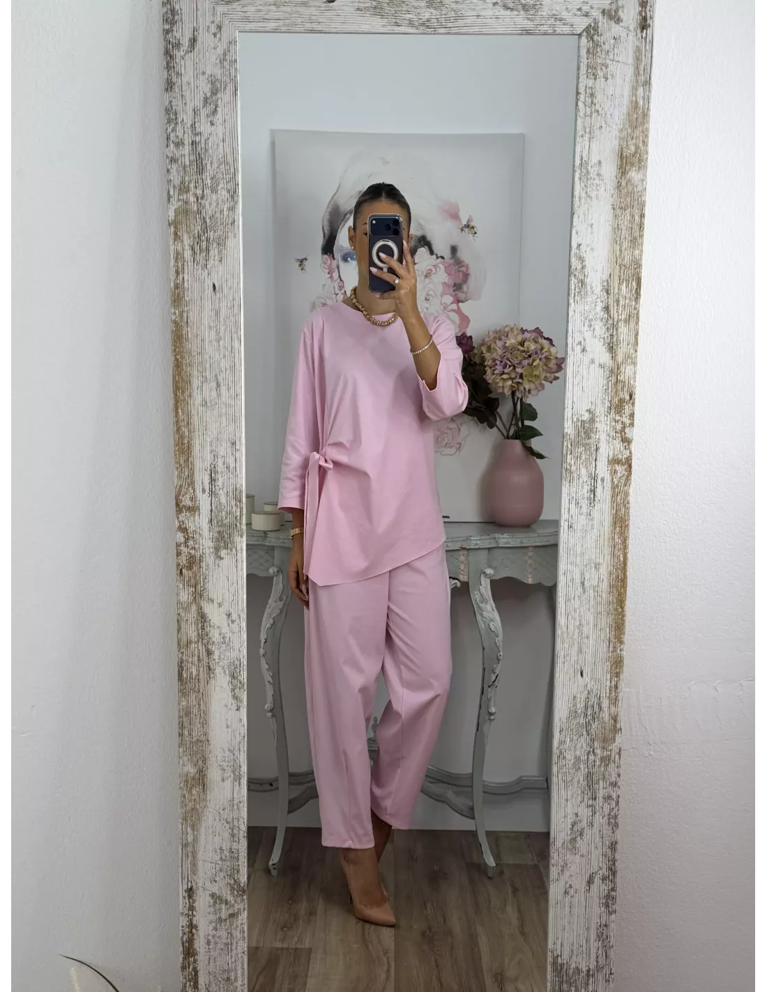 Conjunto de blusa y pantalón la blusa de cuello a la caja con manga francesa y la zona de la cintura lleva una lazada.El pantalón lleva goma en la cintura, es tipo jogger. El tejido es de. Punto.