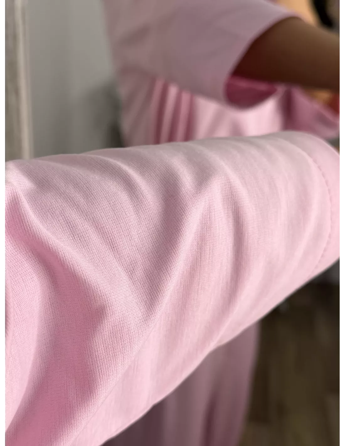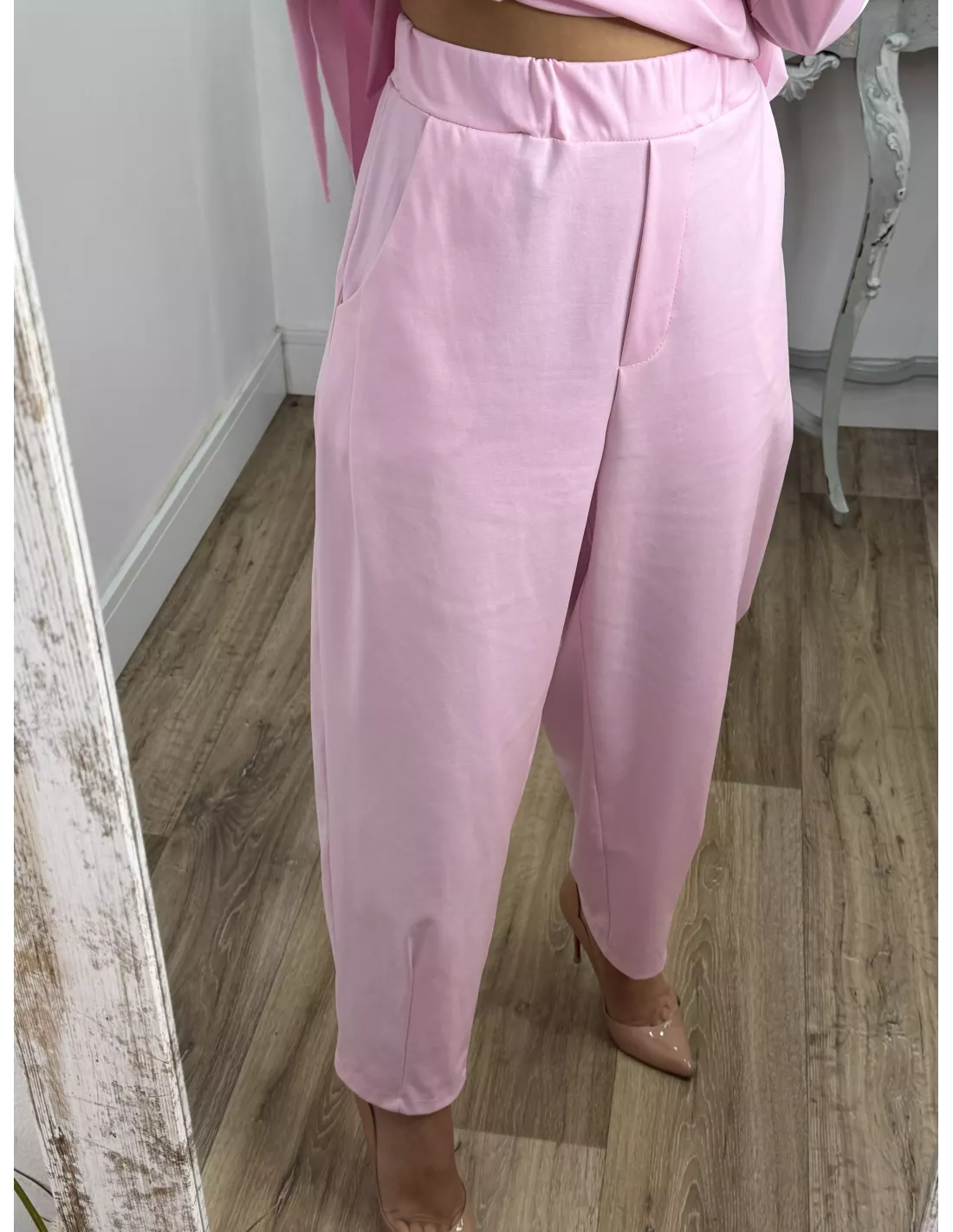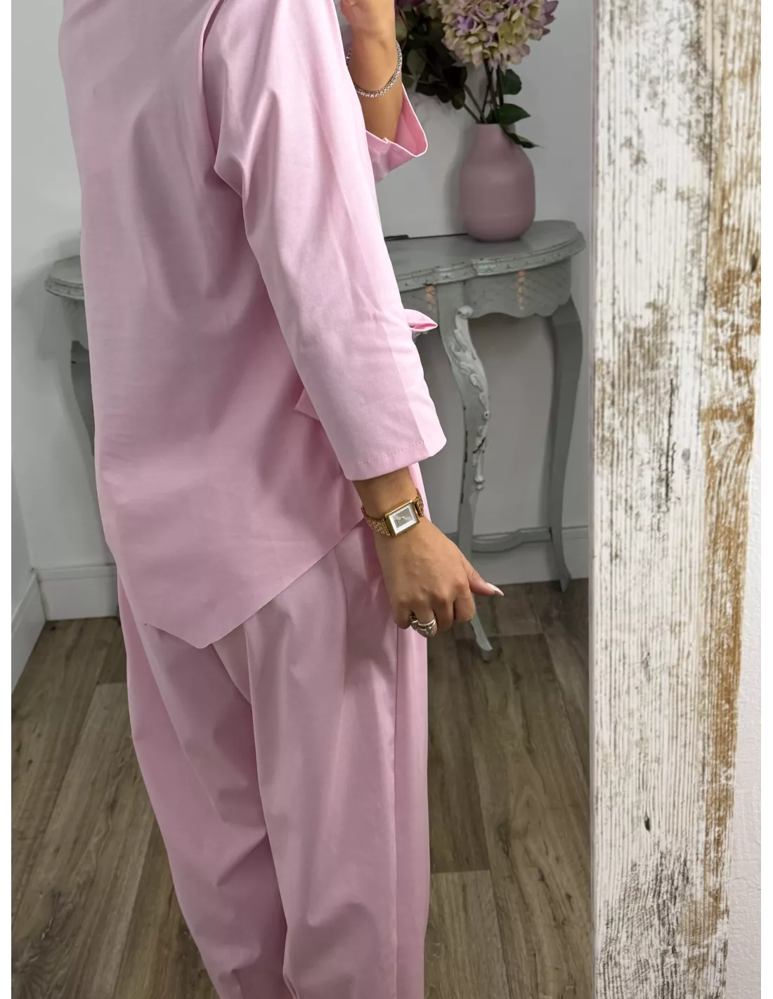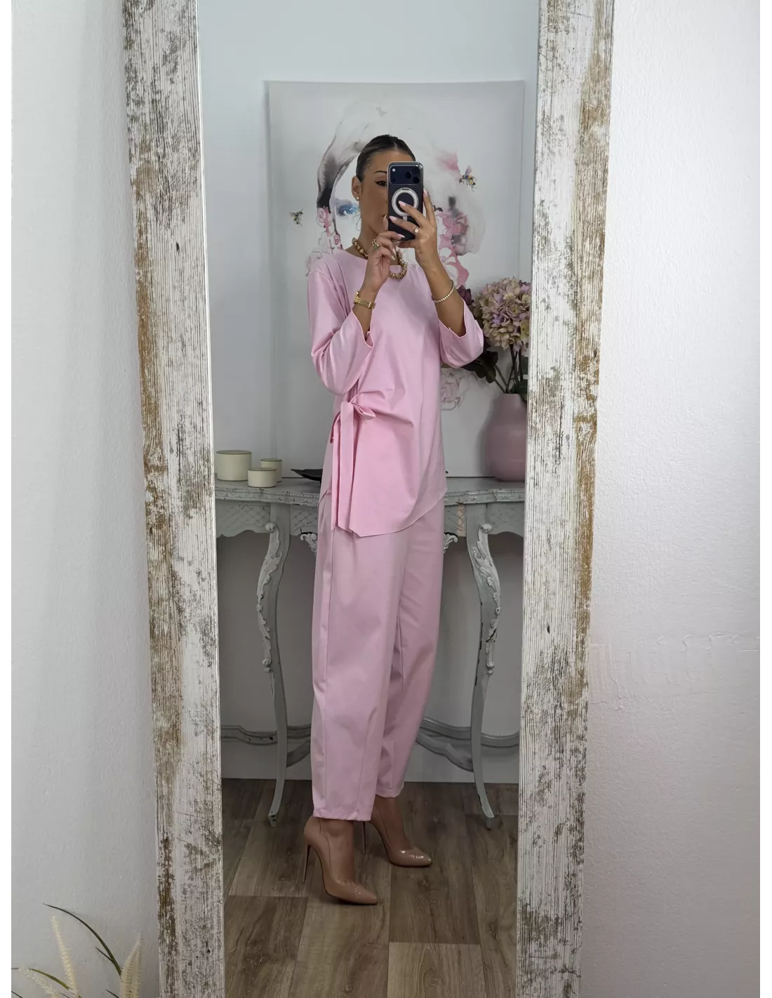 Conjunto de blusa y pantalón la blusa de cuello a la caja con manga francesa y la zona de la cintura lleva una lazada.El pantalón lleva goma en la cintura, es tipo jogger. El tejido es de. Punto.