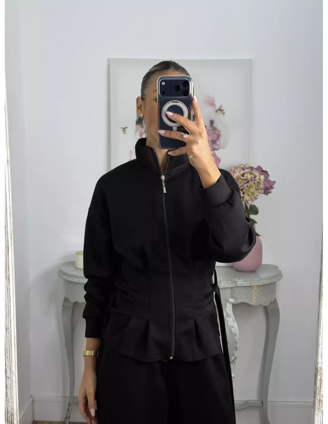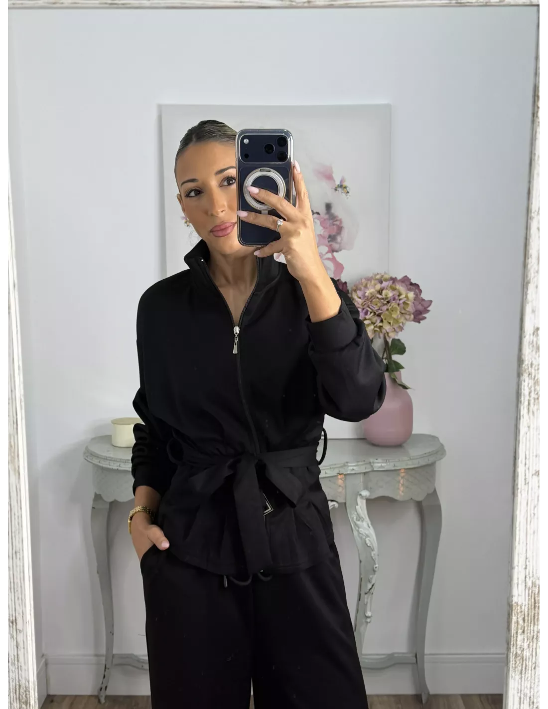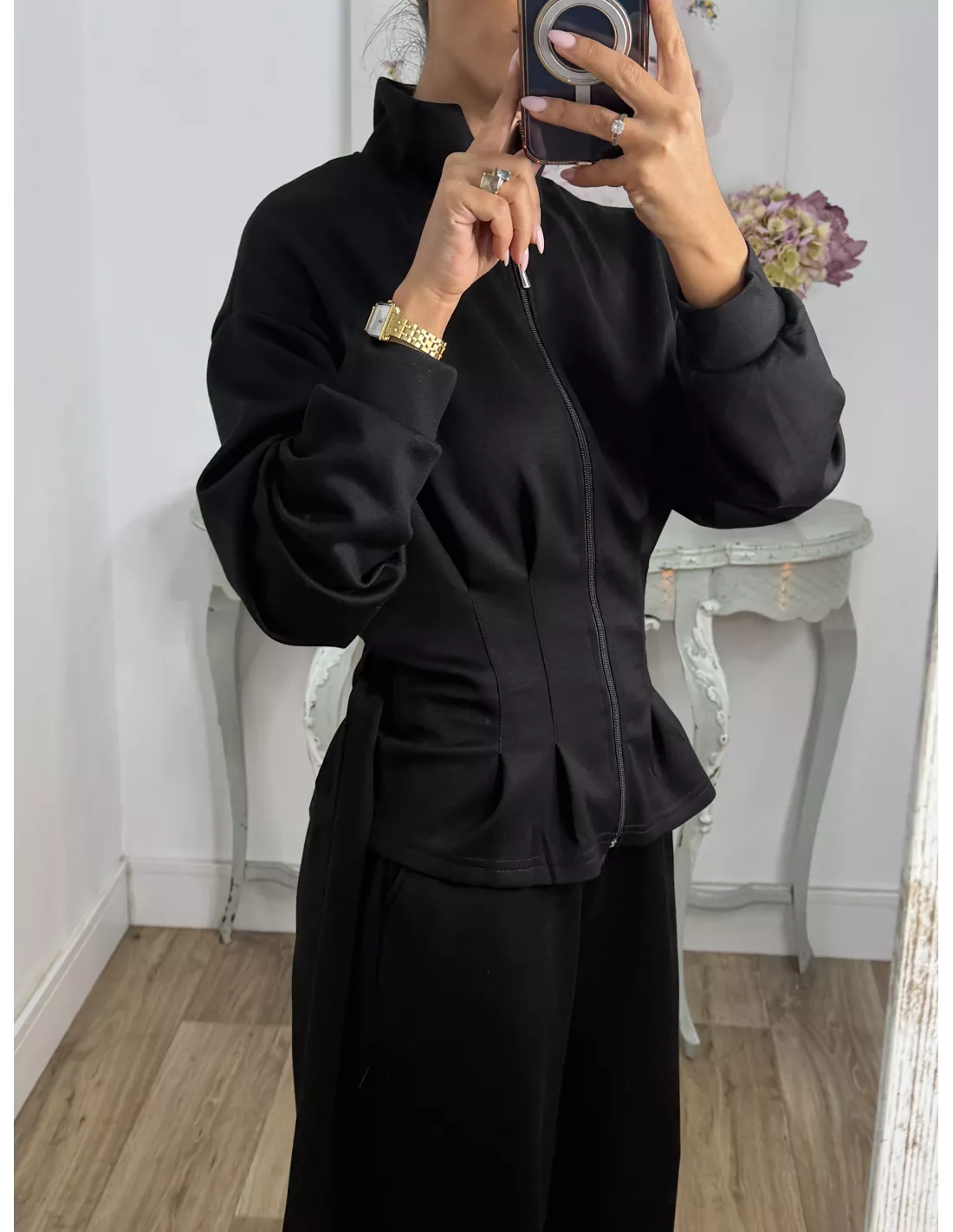 Conjunto de punto de chaqueta y pantalón. La chaqueta el hombro es oversize y la parte de abajo es ajustada, trae capucha y se cierra con cremallera. El pantalón lleva goma en la cintura y trae un cordón. El tejido no se arruga.