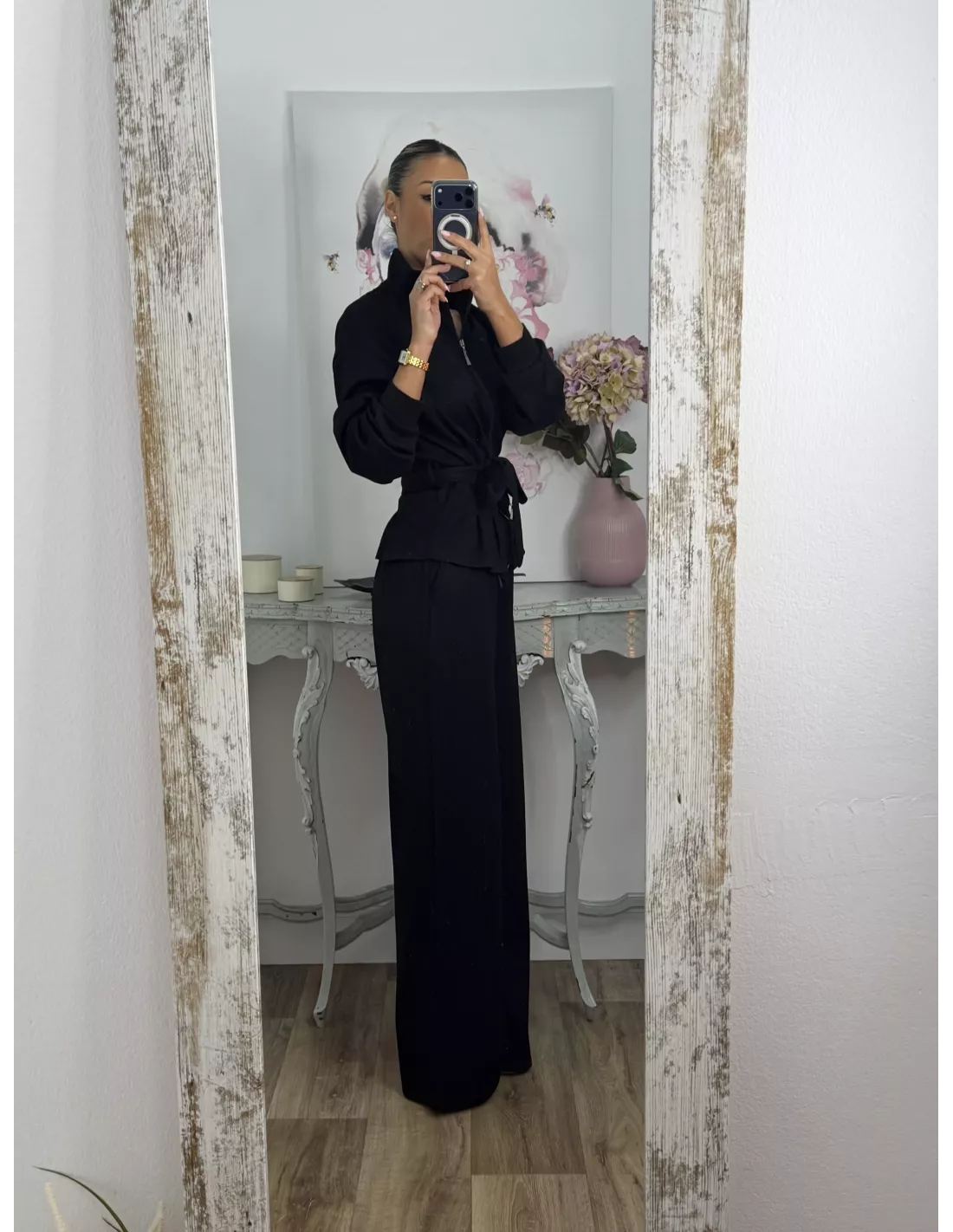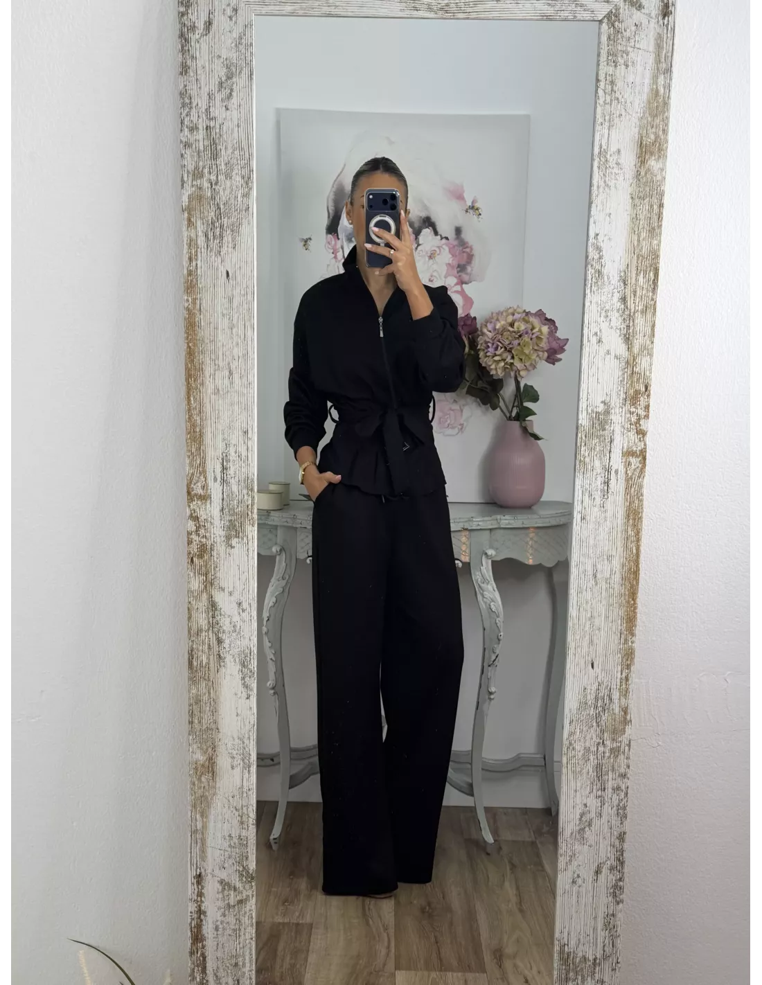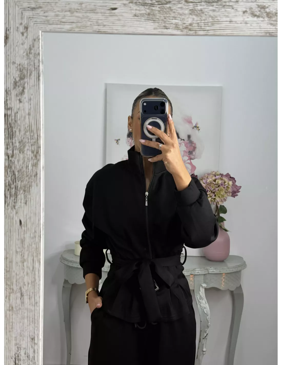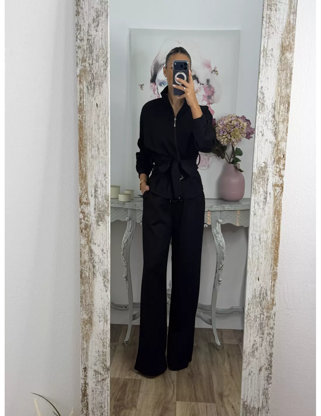 Conjunto de punto de chaqueta y pantalón. La chaqueta el hombro es oversize y la parte de abajo es ajustada, trae capucha y se cierra con cremallera. El pantalón lleva goma en la cintura y trae un cordón. El tejido no se arruga.