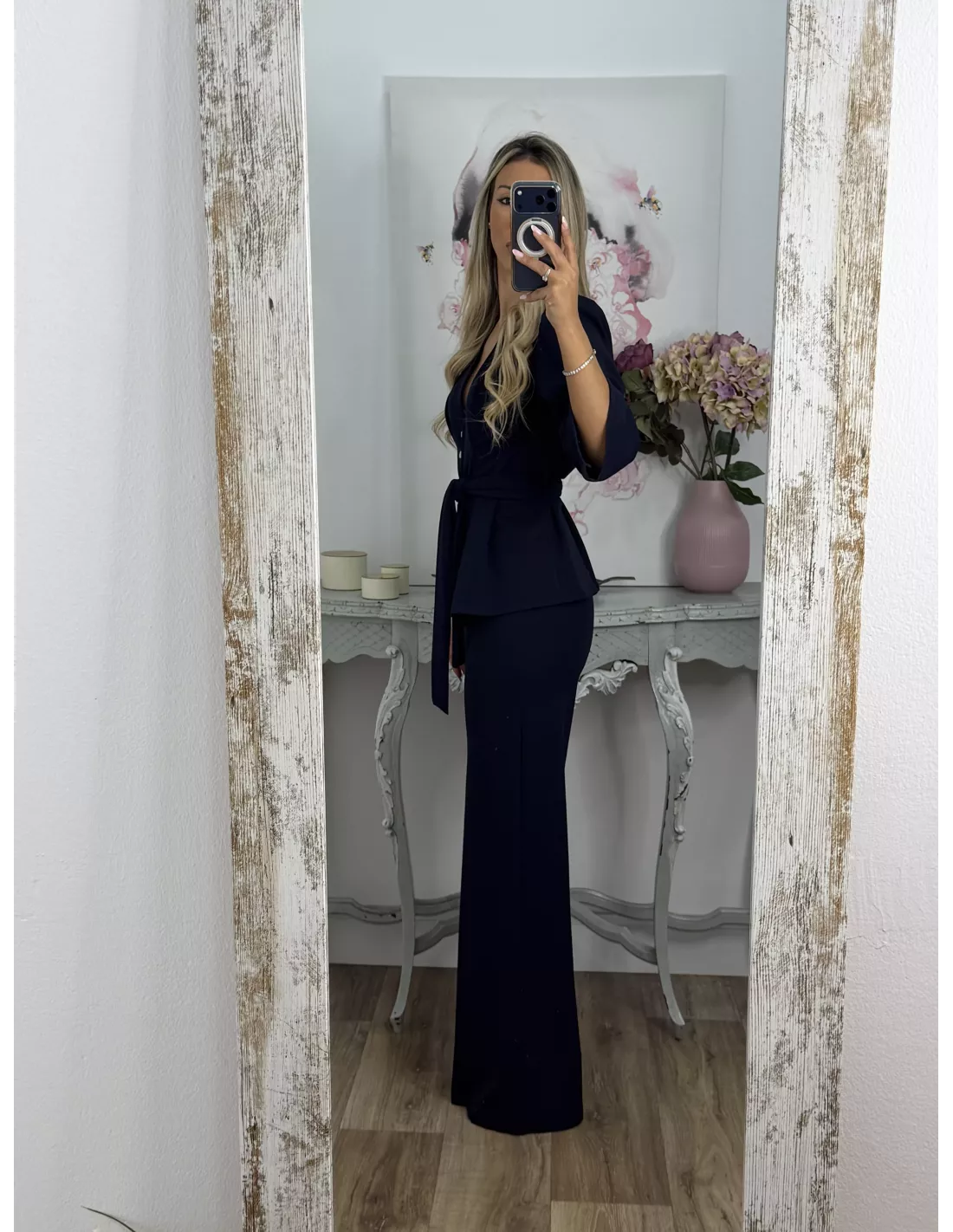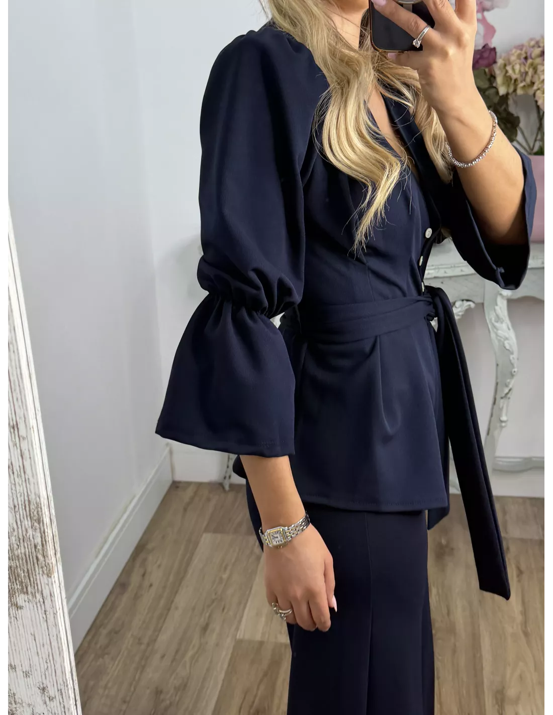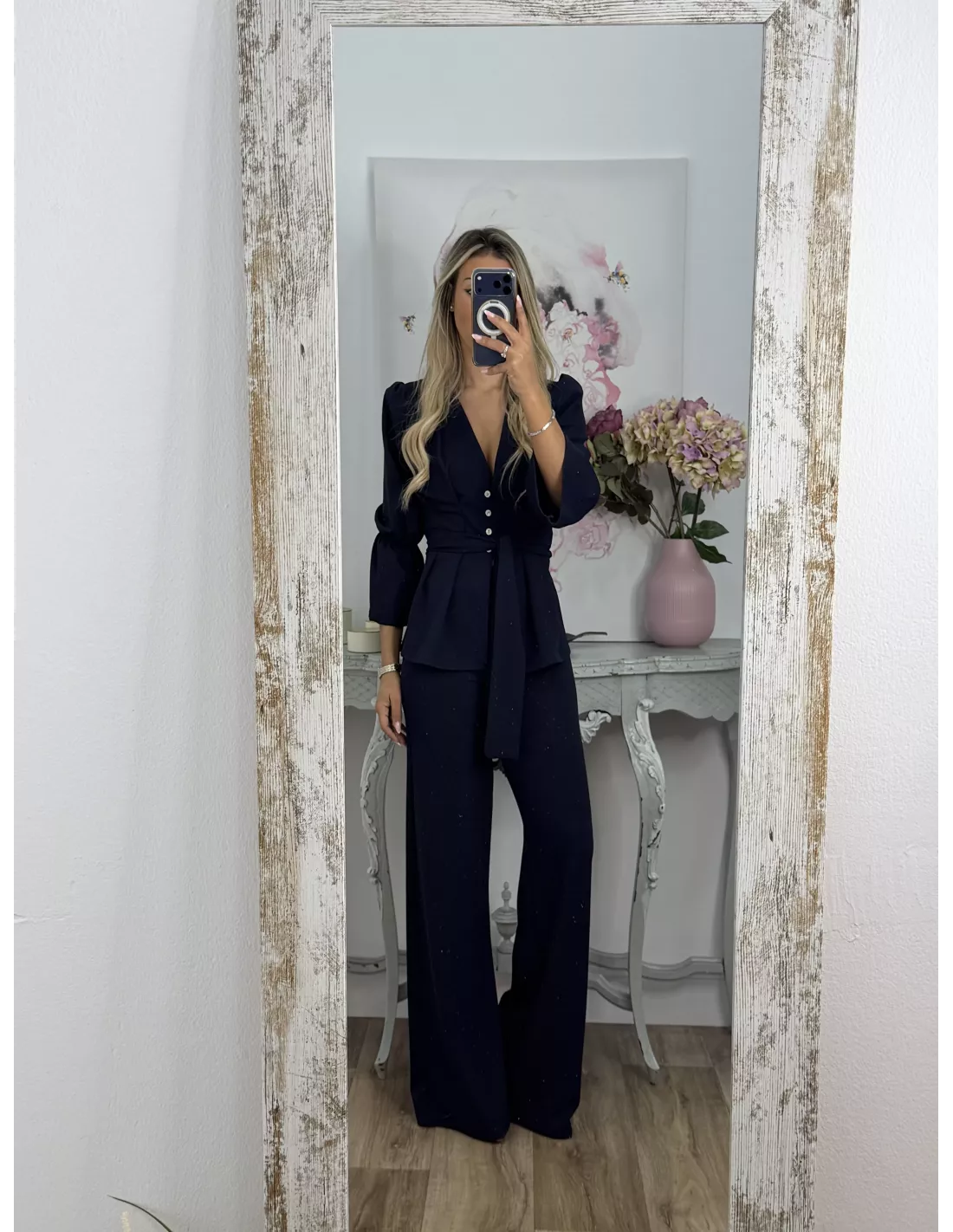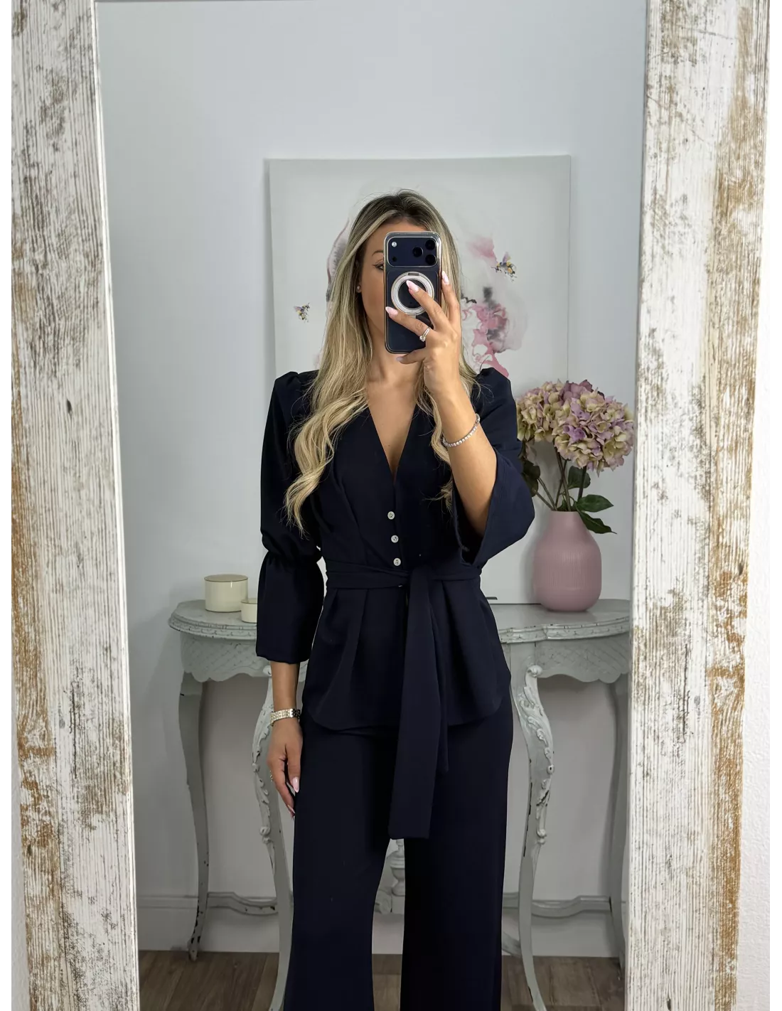Conjunto de blusa y pantalón. Blusa abotonada en la parte delantera, con pinzas que trae cinturón del mismo tejido. Tiene hombreras. Pantalón con goma en la cintura y de corte recto. Tejido de punto.