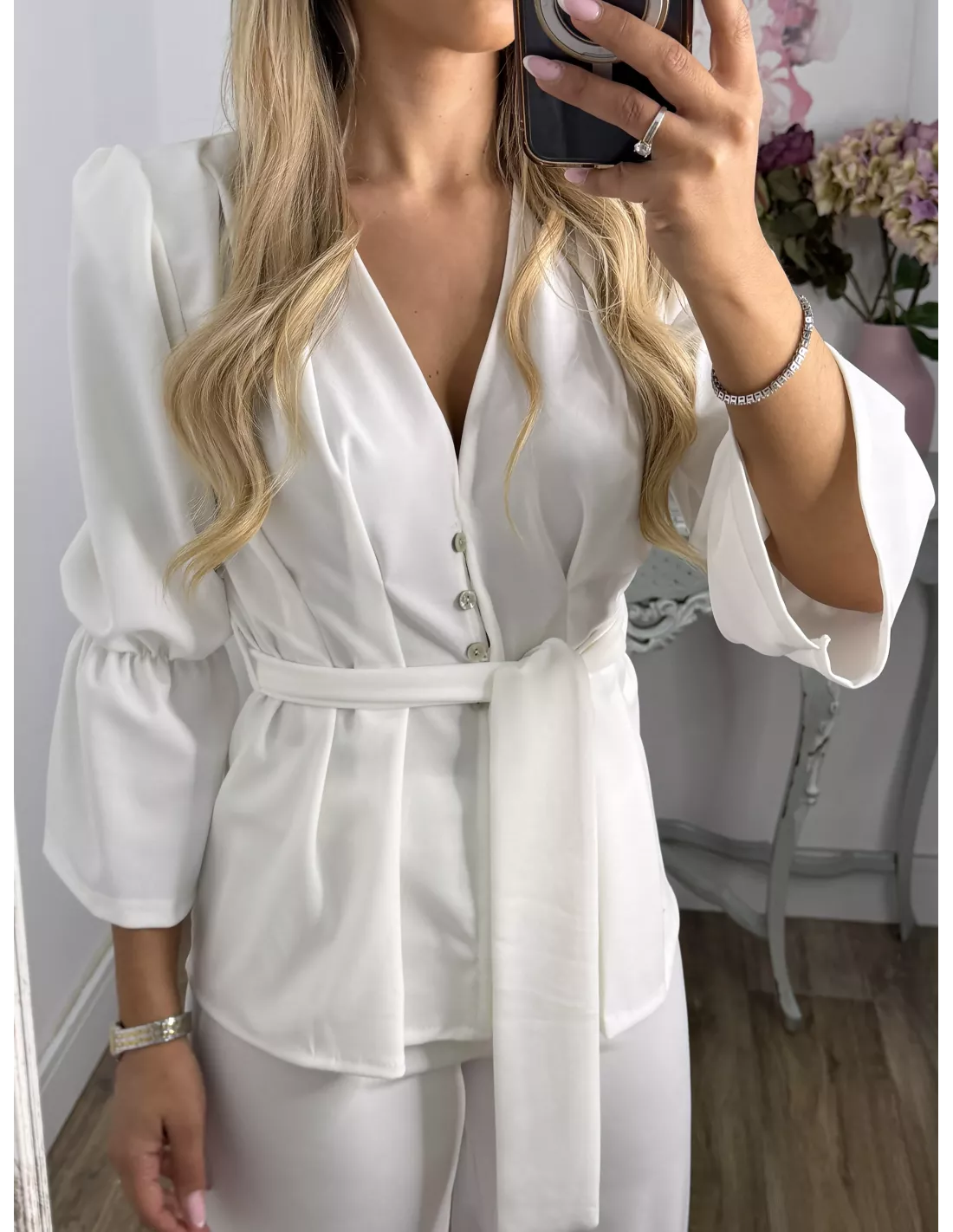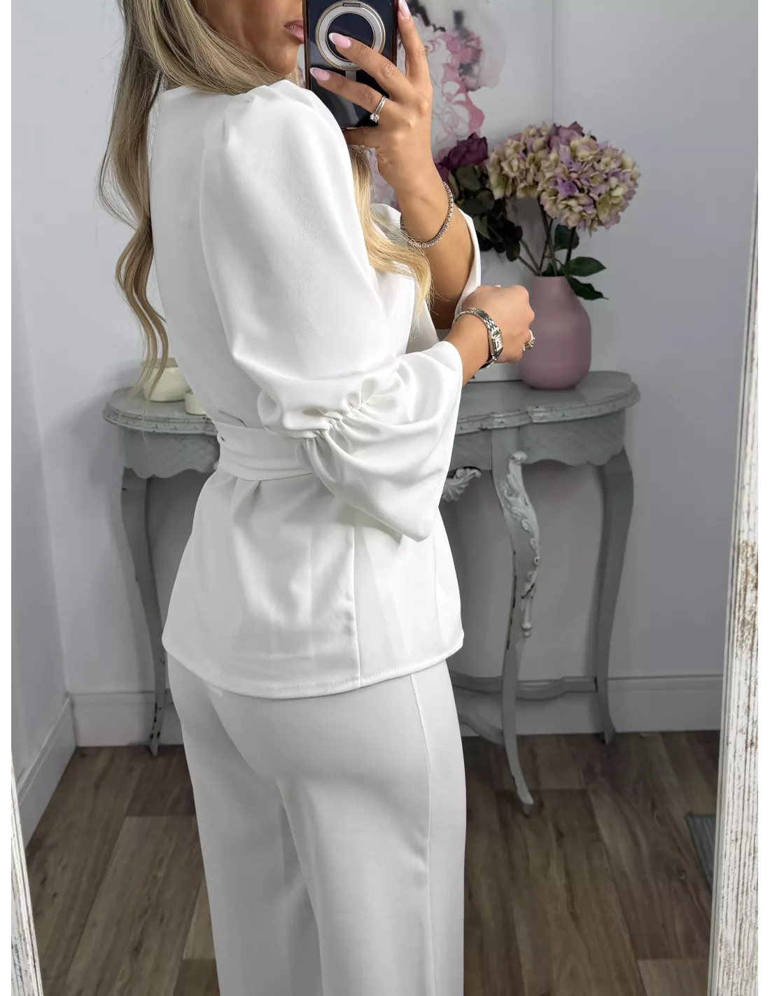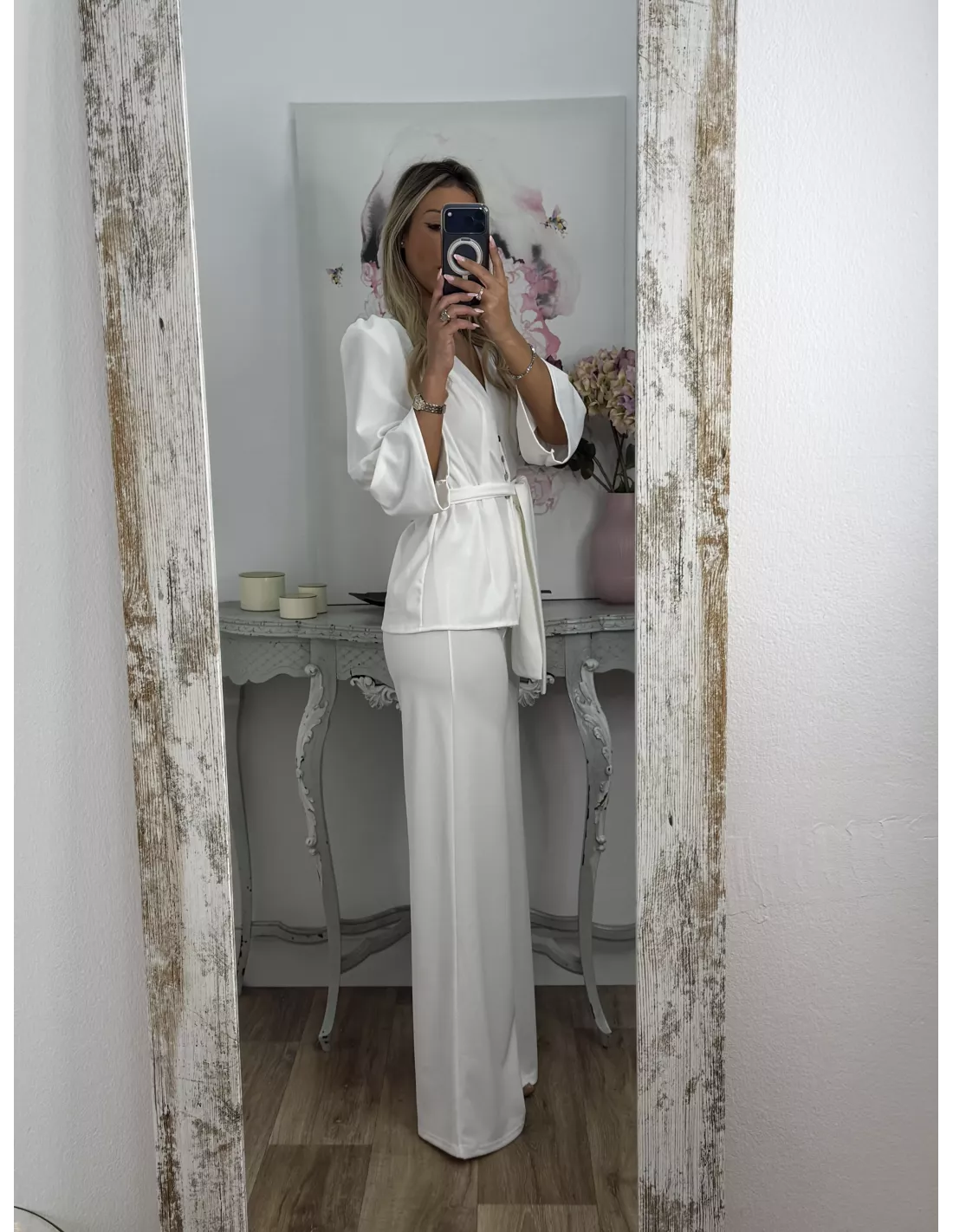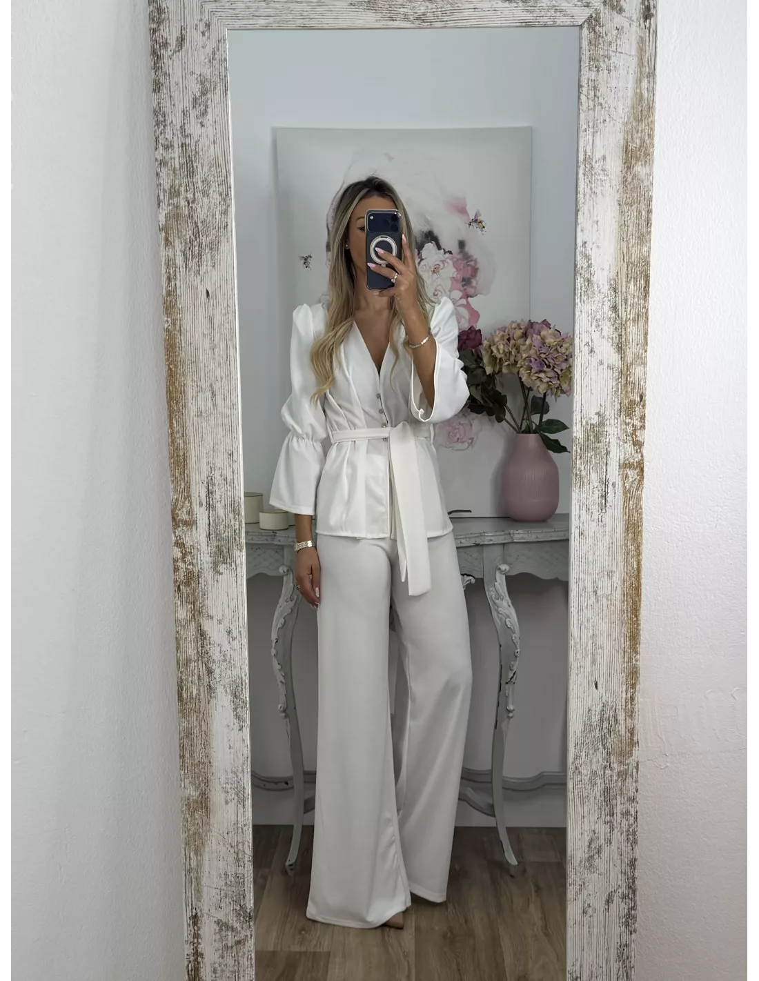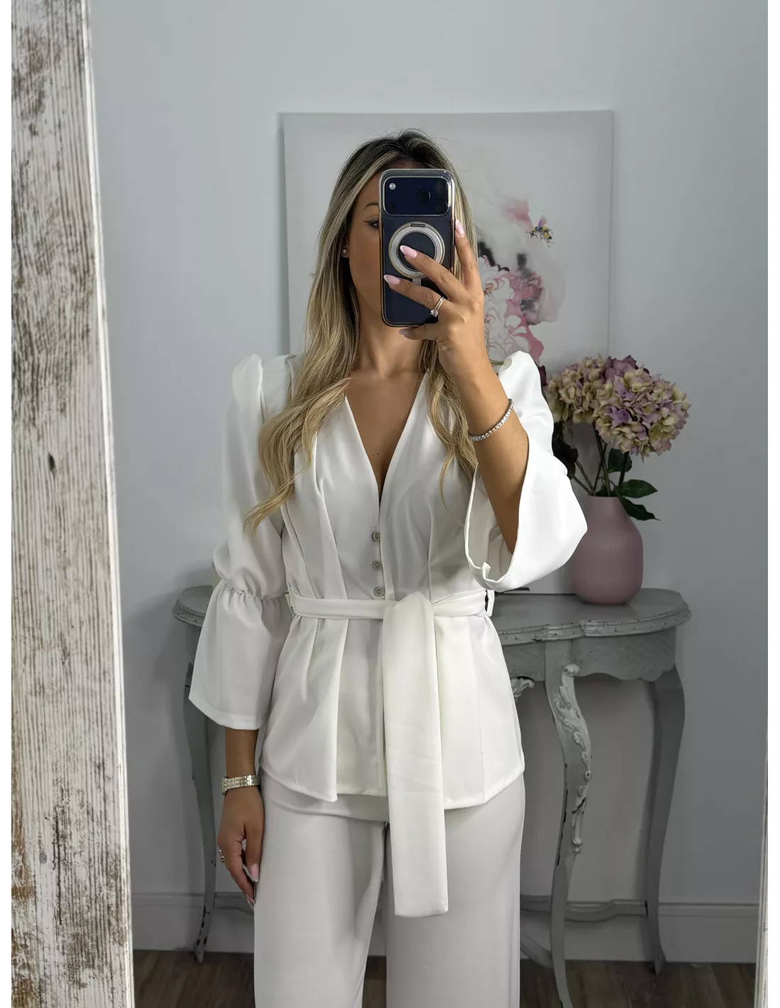 Conjunto de blusa y pantalón. Blusa abotonada en la parte delantera, con pinzas que trae cinturón del mismo tejido. Tiene hombreras. Pantalón con goma en la cintura y de corte recto. Tejido de punto.