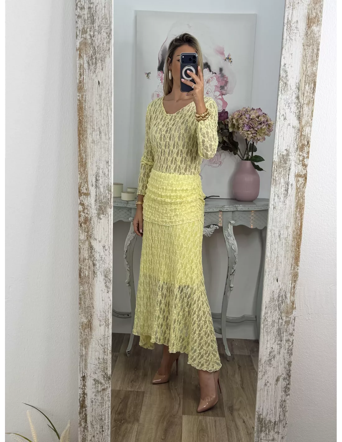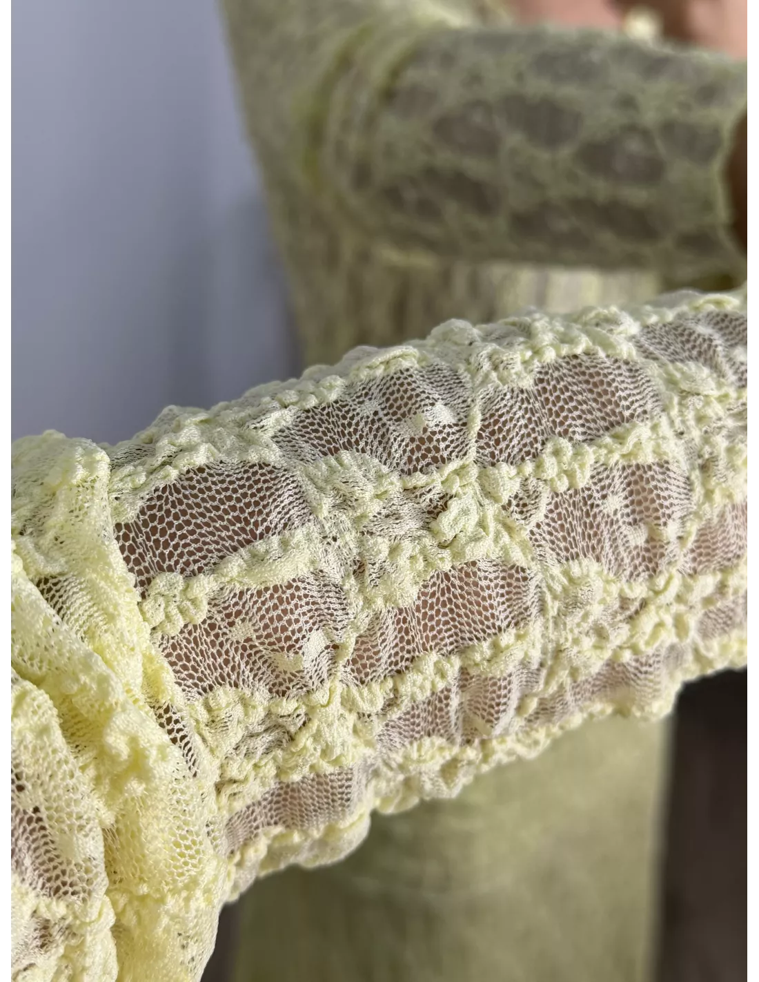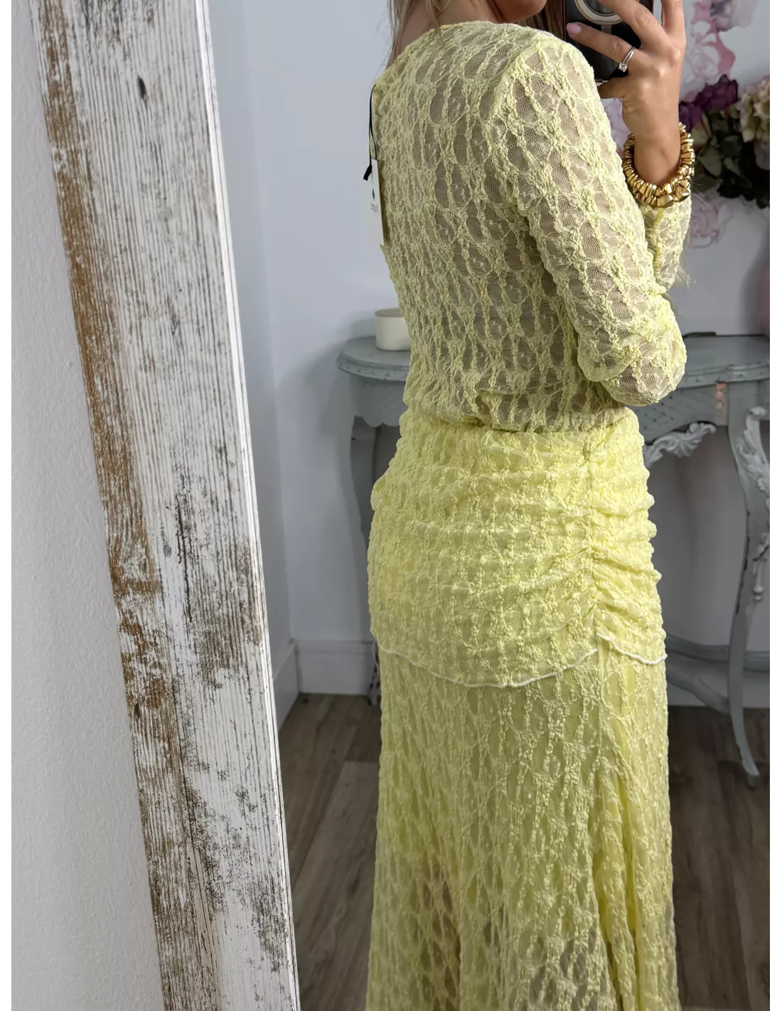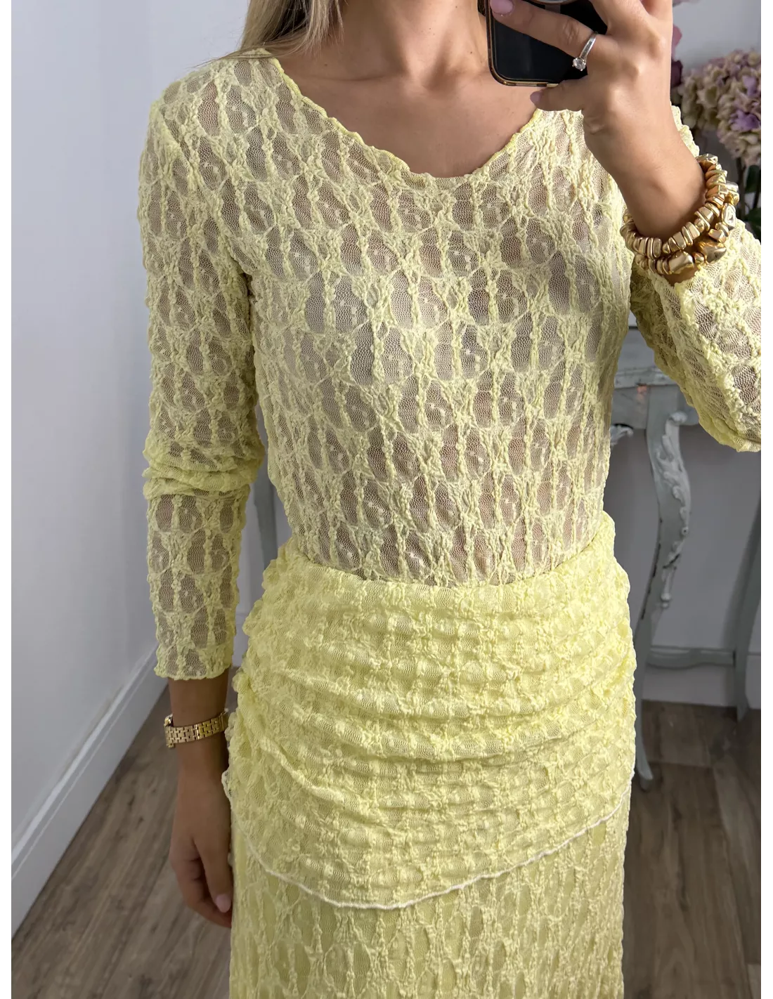 Conjunto de blusa y falda. El tejido es de punto de encaje. La blusa no va forrada y es de corte ajustado. La falda va completamente forrada.