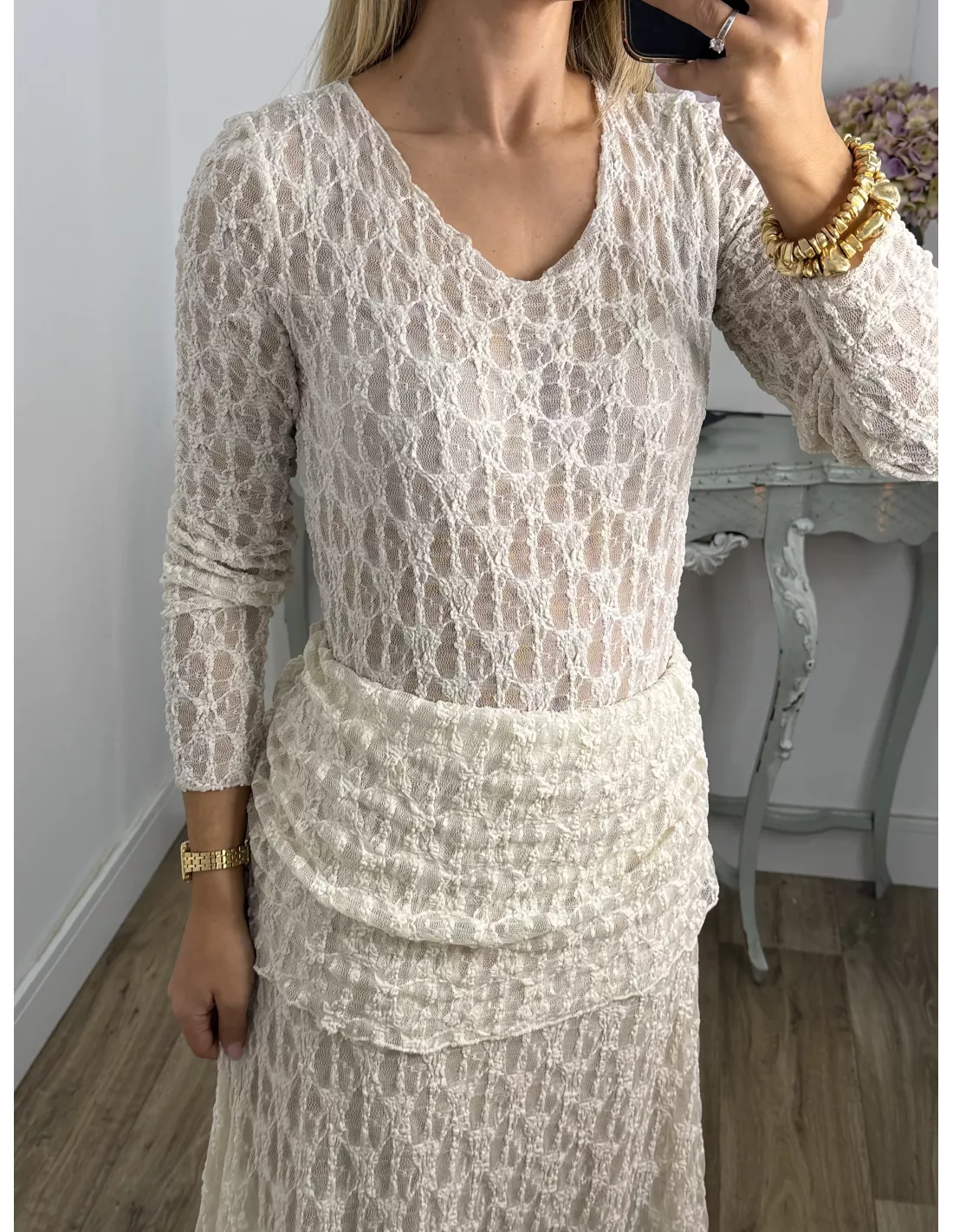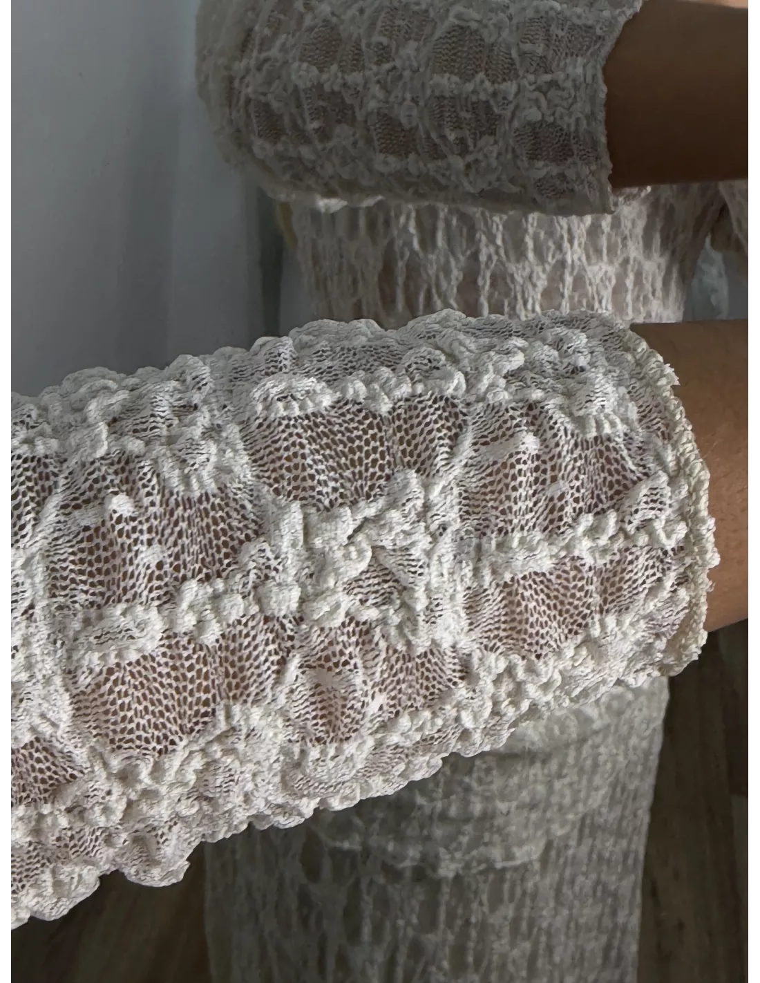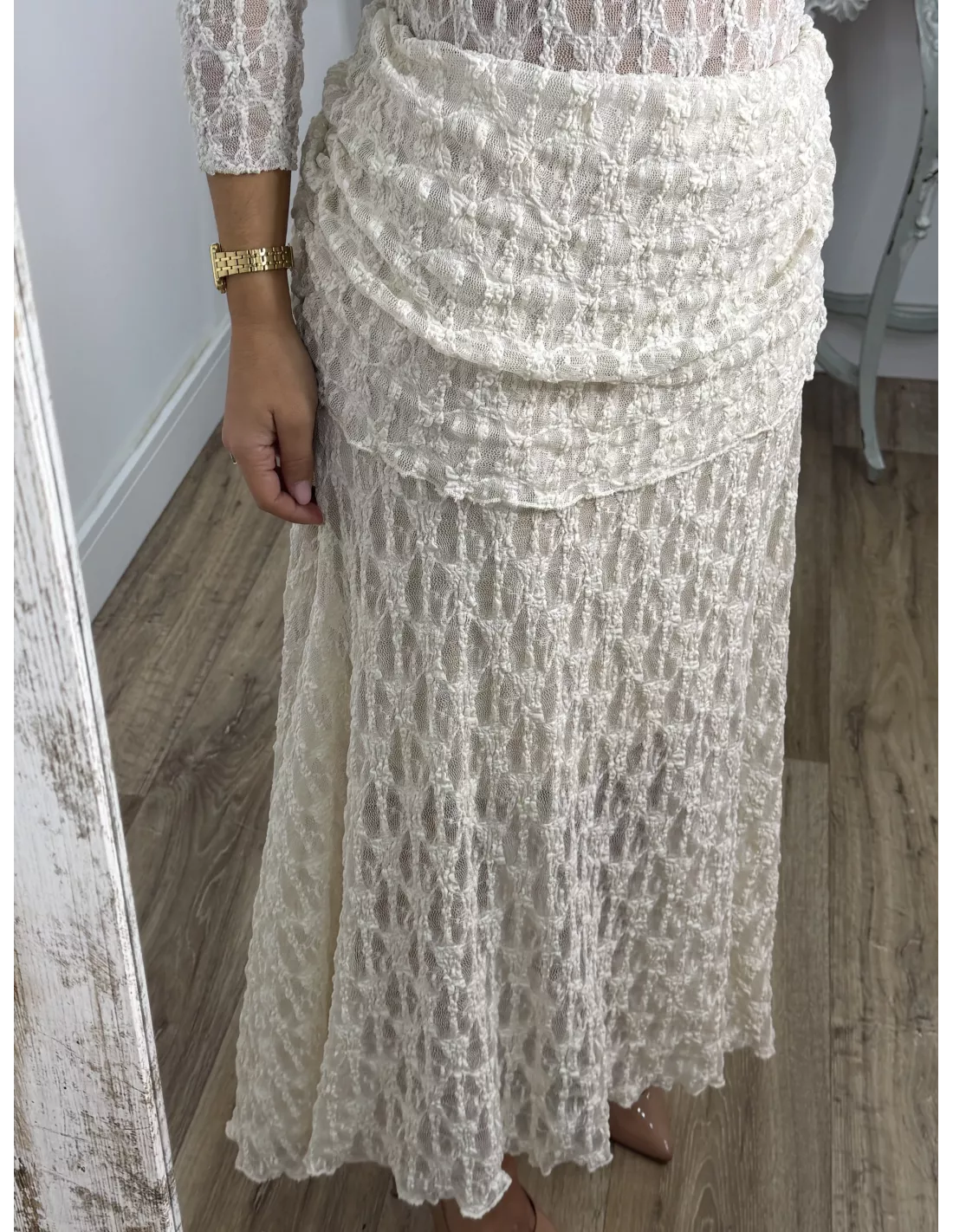 Conjunto de blusa y falda. El tejido es de punto de encaje. La blusa no va forrada y es de corte ajustado. La falda va completamente forrada.