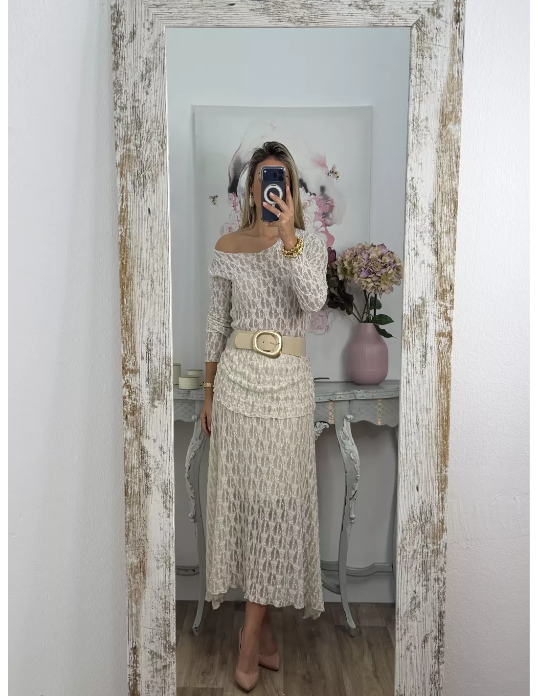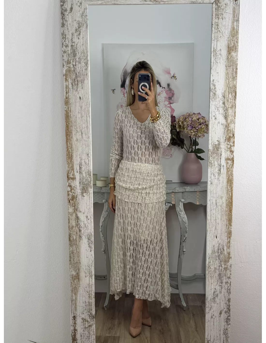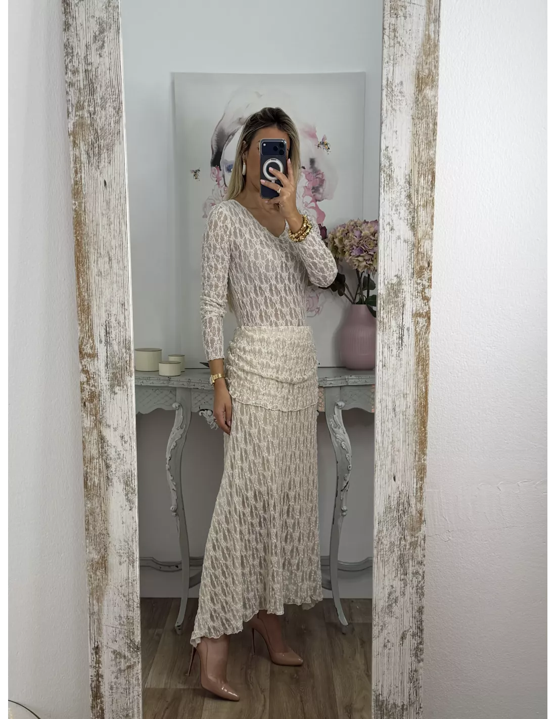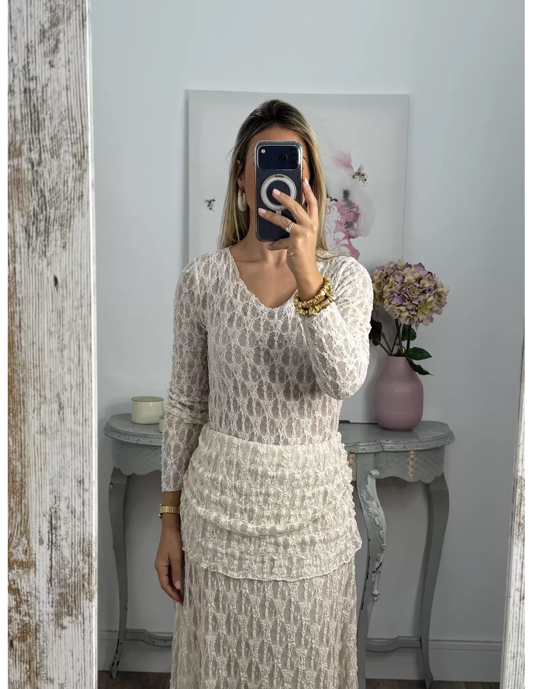Conjunto de blusa y falda. El tejido es de punto de encaje. La blusa no va forrada y es de corte ajustado. La falda va completamente forrada.