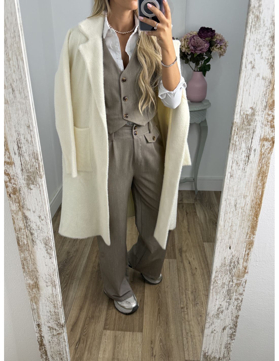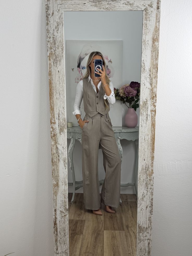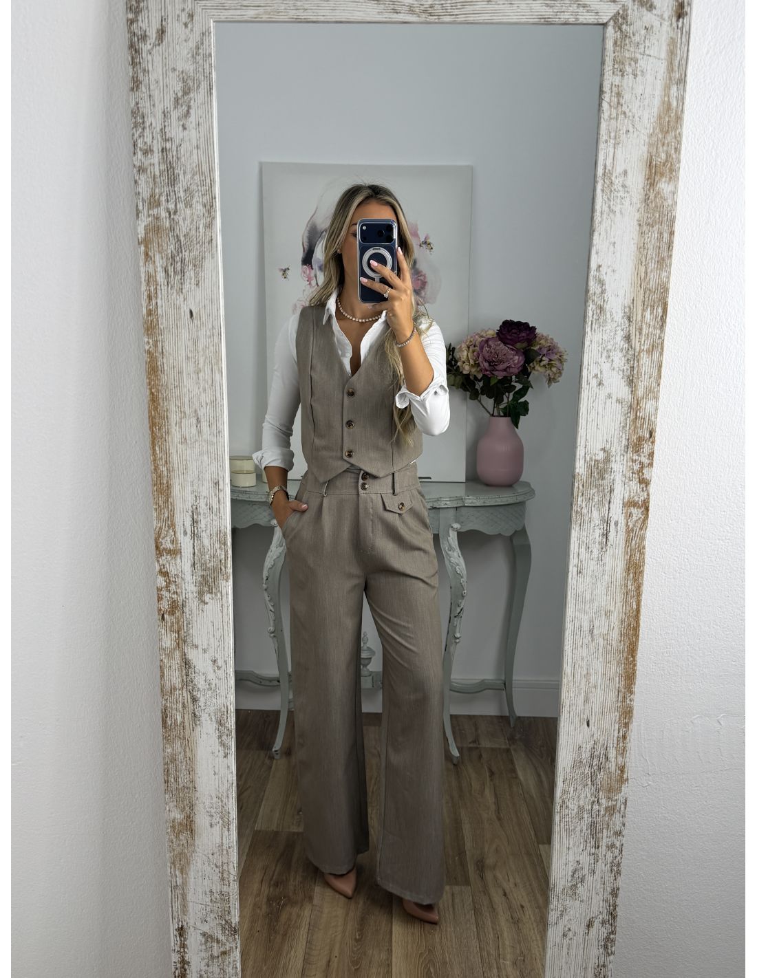 Conjunto de chaleco y pantalón. El chaleco se abotonado y se puede abrir, va forrado y no tiene bolsillos. El pantalón es de pinza con bolsillos en la parte delantera. La zona de la cintura de la parte delantera es normal lleva cremallera y botón, la parte de atrás lleva goma. El pantalón no tapa el zapato, a las chicas altas le quedará corto.